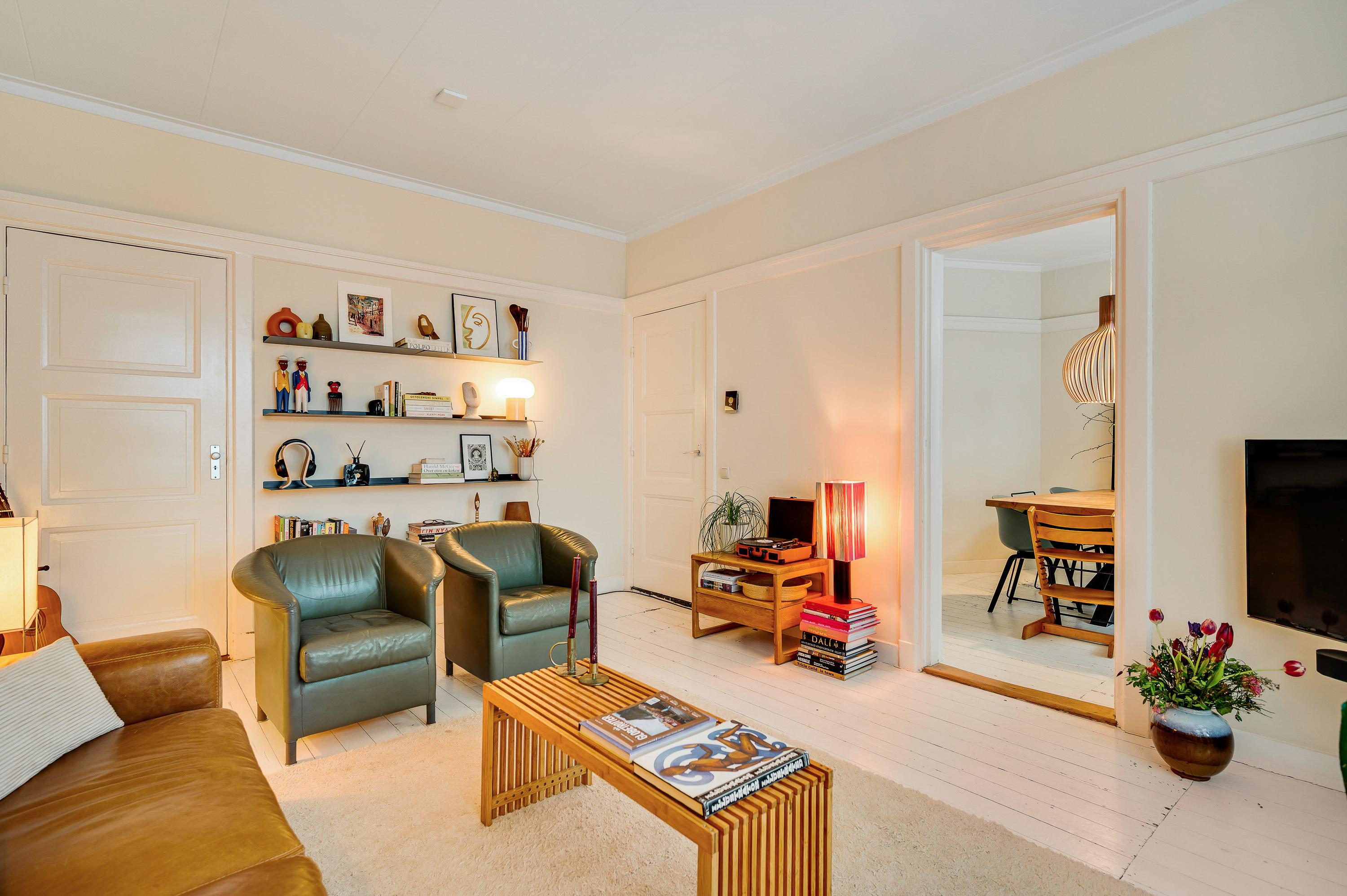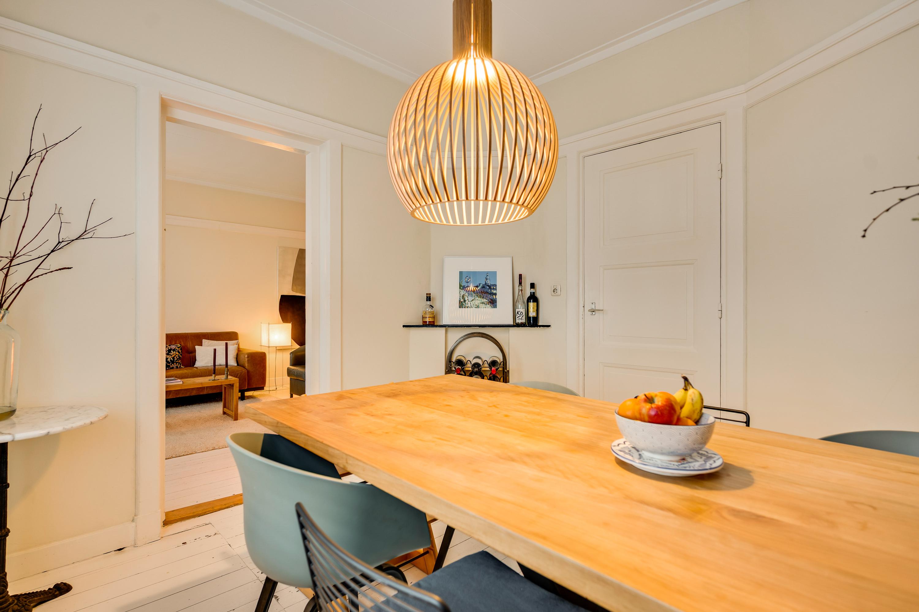 Aan de achterzijde is de woonkamer (circa 4,76 x 3,78 excl. erker), die geheel als zitkamer ingedeeld kan worden. Sfeermakers zijn de houten vloer, houten wandlijsten en de paneeldeuren. De aansluitende eetkamer, met dezelfde sfeer als de woonkamer, is ongeveer 3,16 x 3,07/2,44 meter groot.