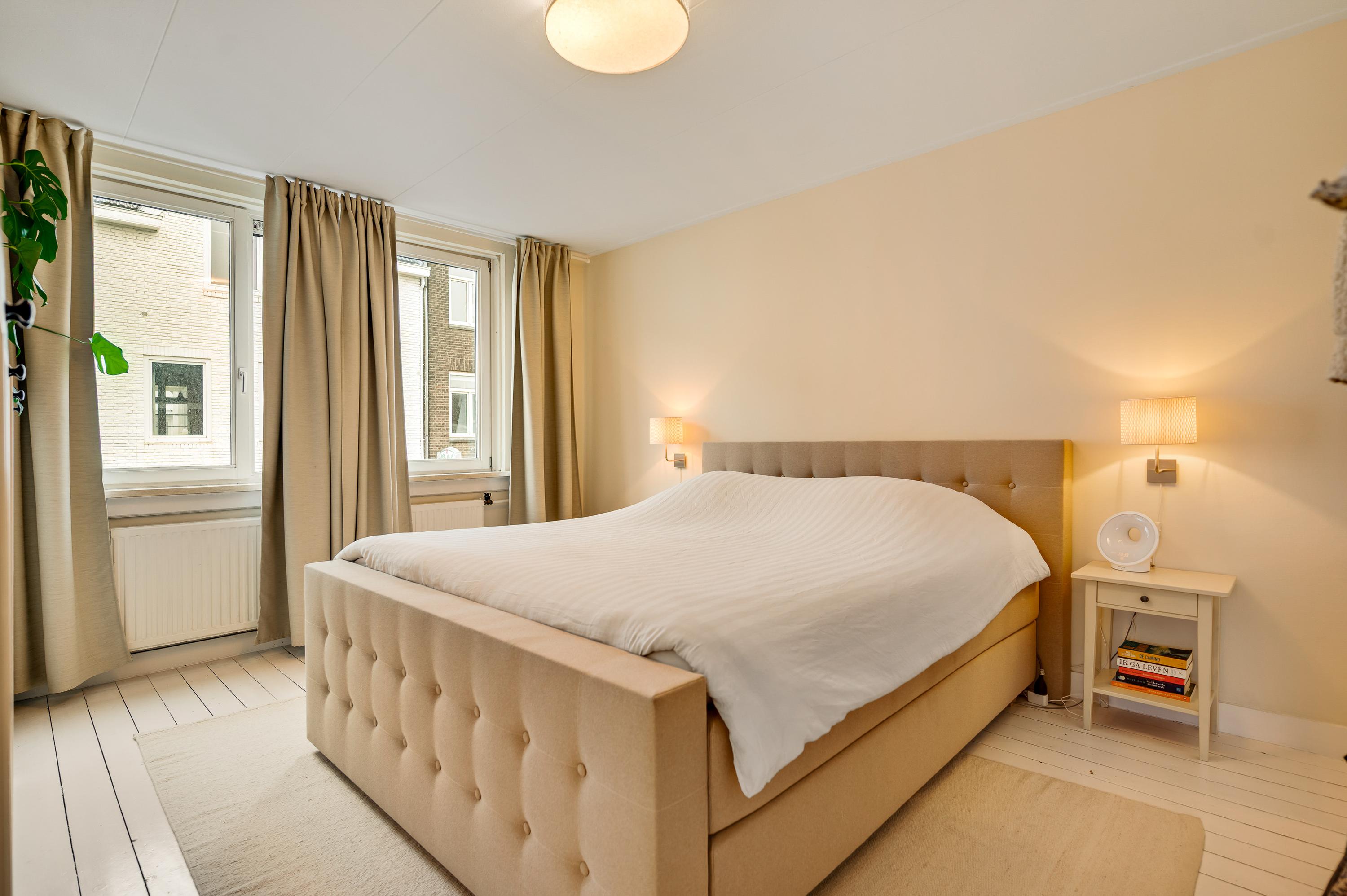 De overloop, met het trappenhuis en een houten vloer, heeft veel lichtinval via de grote ramen aan de voorzijde. Vanaf hier is er toegang tot twee slaapkamers en de badkamer. Slaapkamer I (circa 4,79 x 3,78), in gebruik als master bedroom, heeft net als de woonkamer een inbouwkast. Slaapkamer II is geschikt als kinderkamer, werkkamer of kleedruimte.