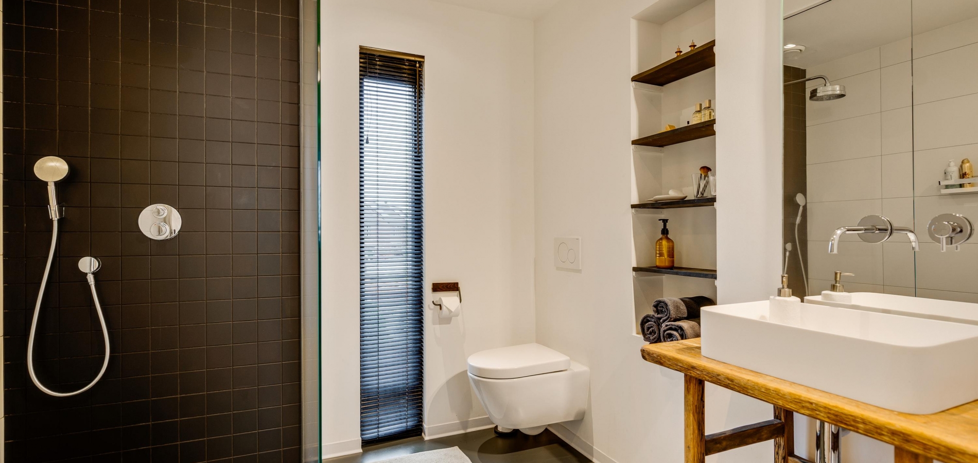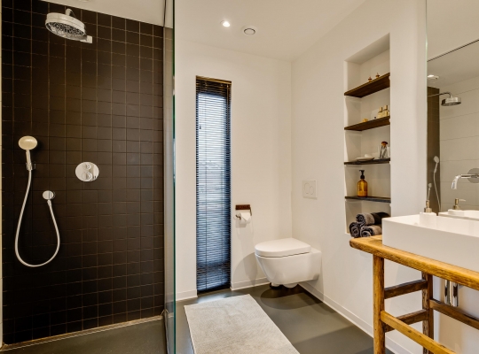 De badkamer (circa 2,37/1,83 x 2,27) biedt ruimte aan een inloopdouche, tweede toilet en een wastafel op een houten badkamermeubel. Fraaie elementen zijn de kranen, designradiator en de nis met donkerbruine planken.