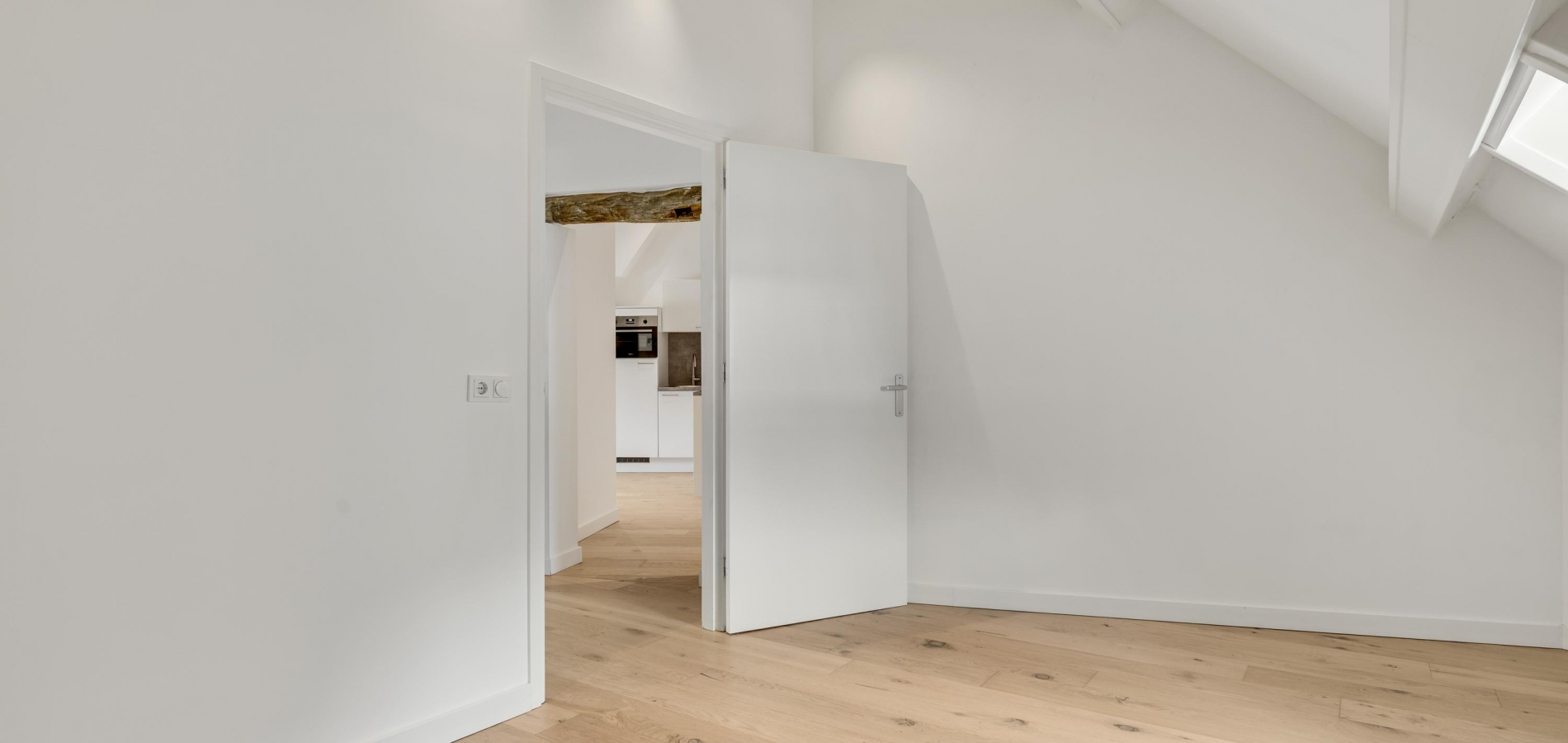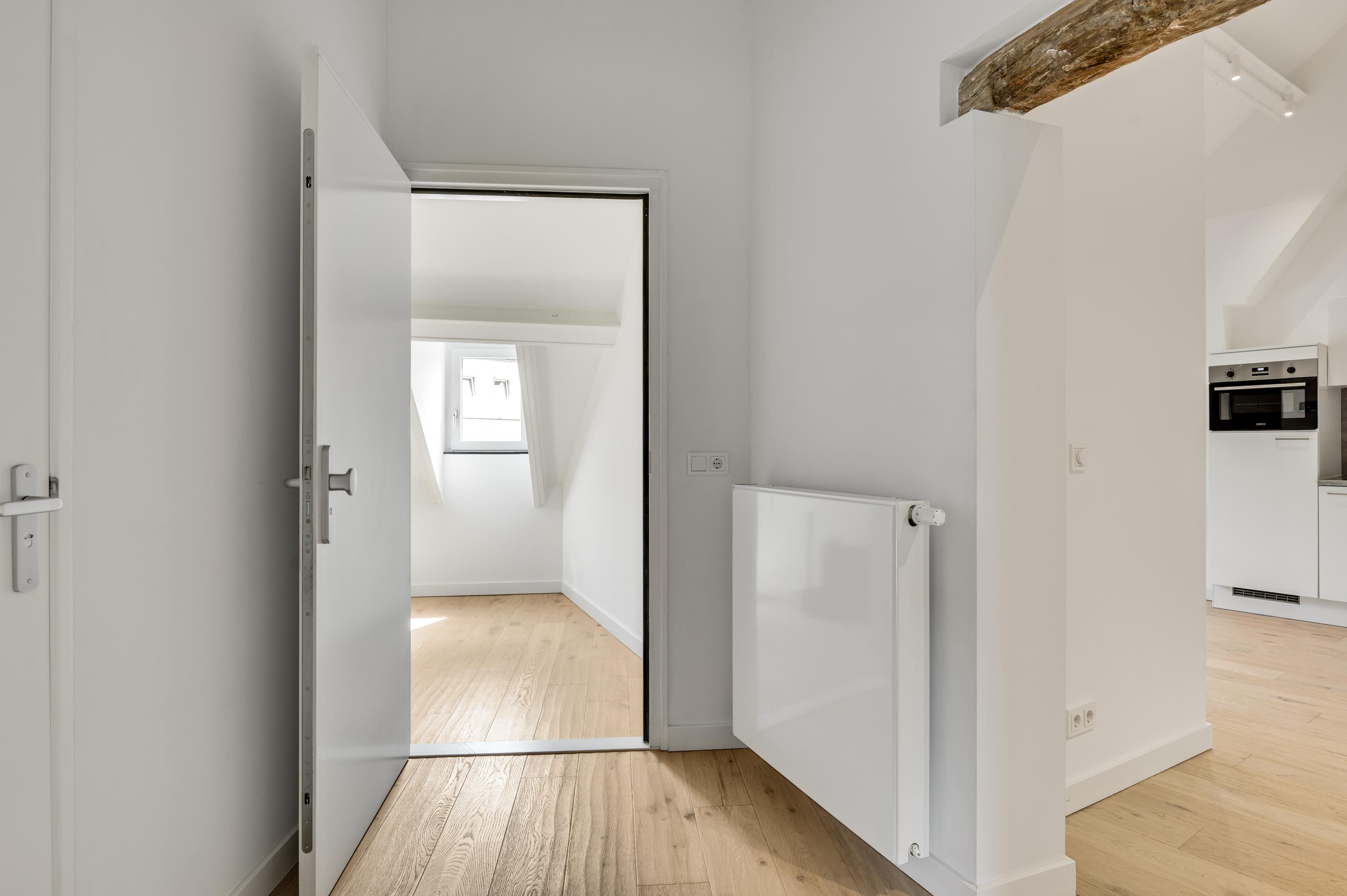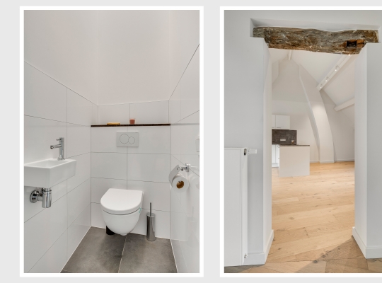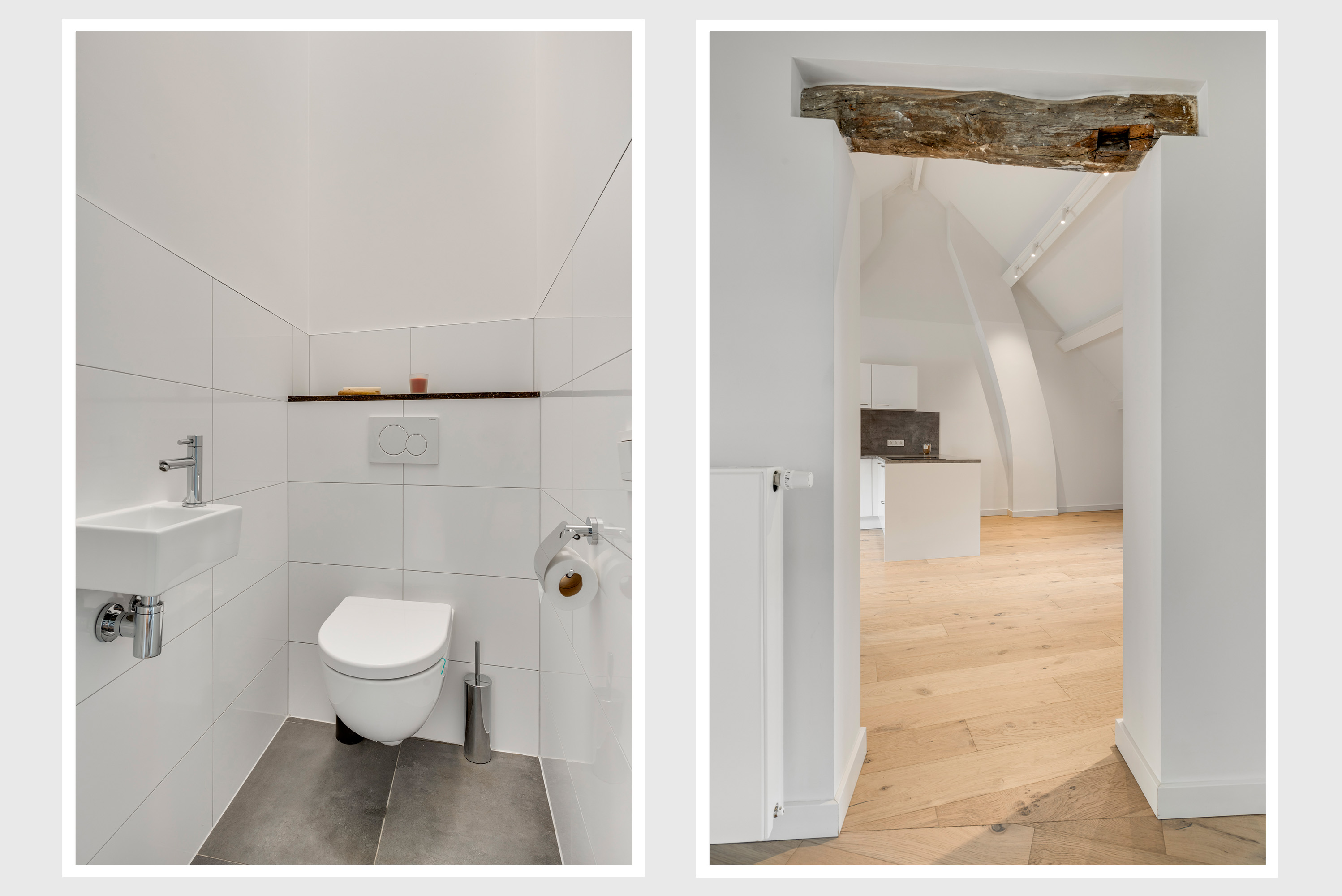 Aan het einde van de trap bereikt u een royaal portaal, met een dakkapel aan de voorzijde. Strak stucwerk is gecombineerd met een pvc-vloer, en vlak naast de trap is de deur naar het appartement. Achter deze deur is de hal, met aan de rechterzijde een recent vernieuwde toiletruimte. Mooi detail in de hal is de oude balk, boven de doorgang naar de woonkamer.