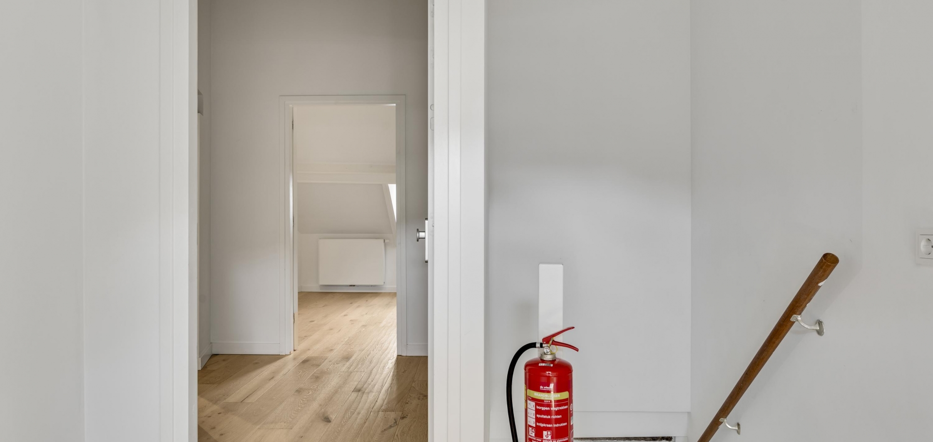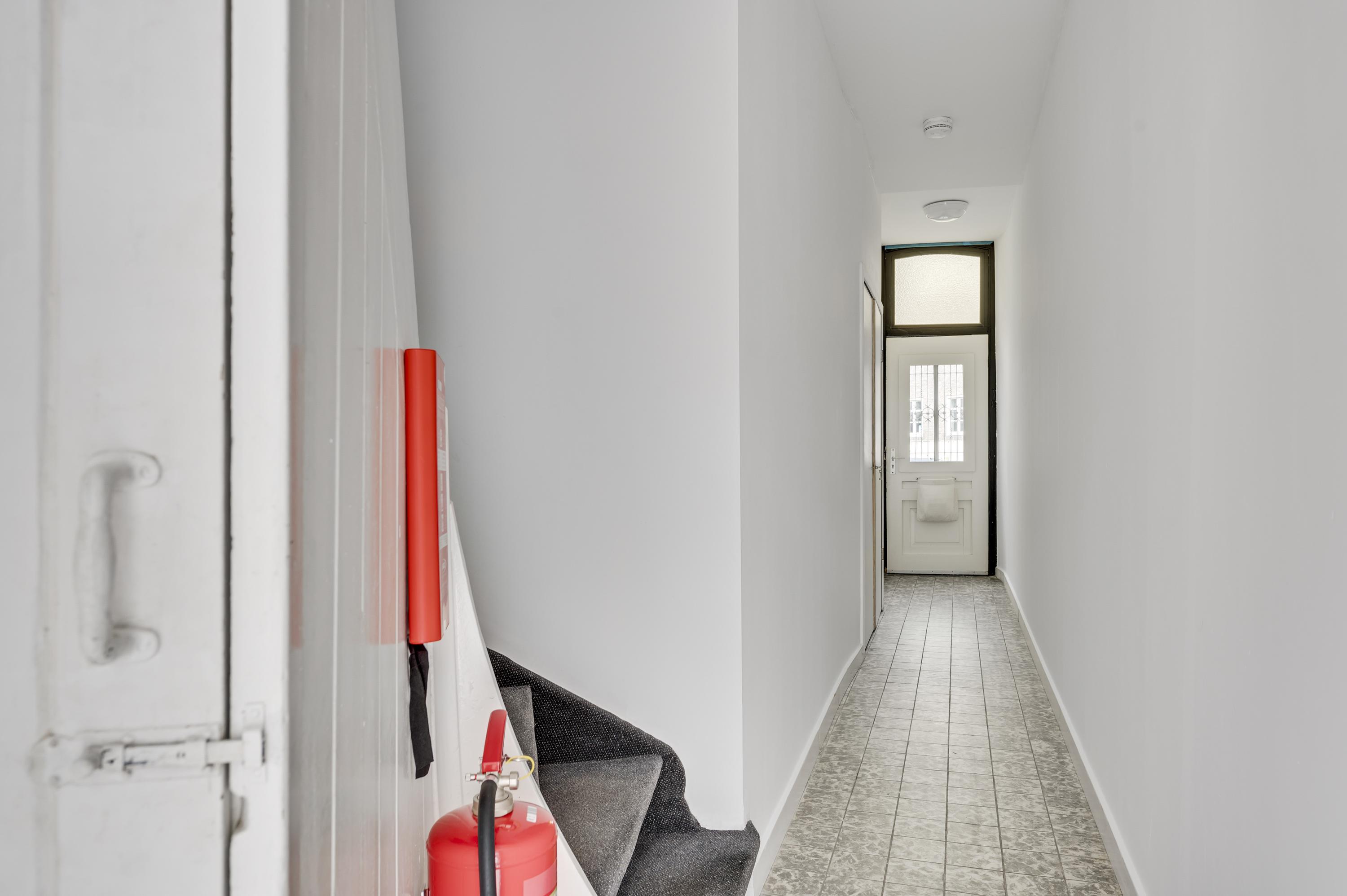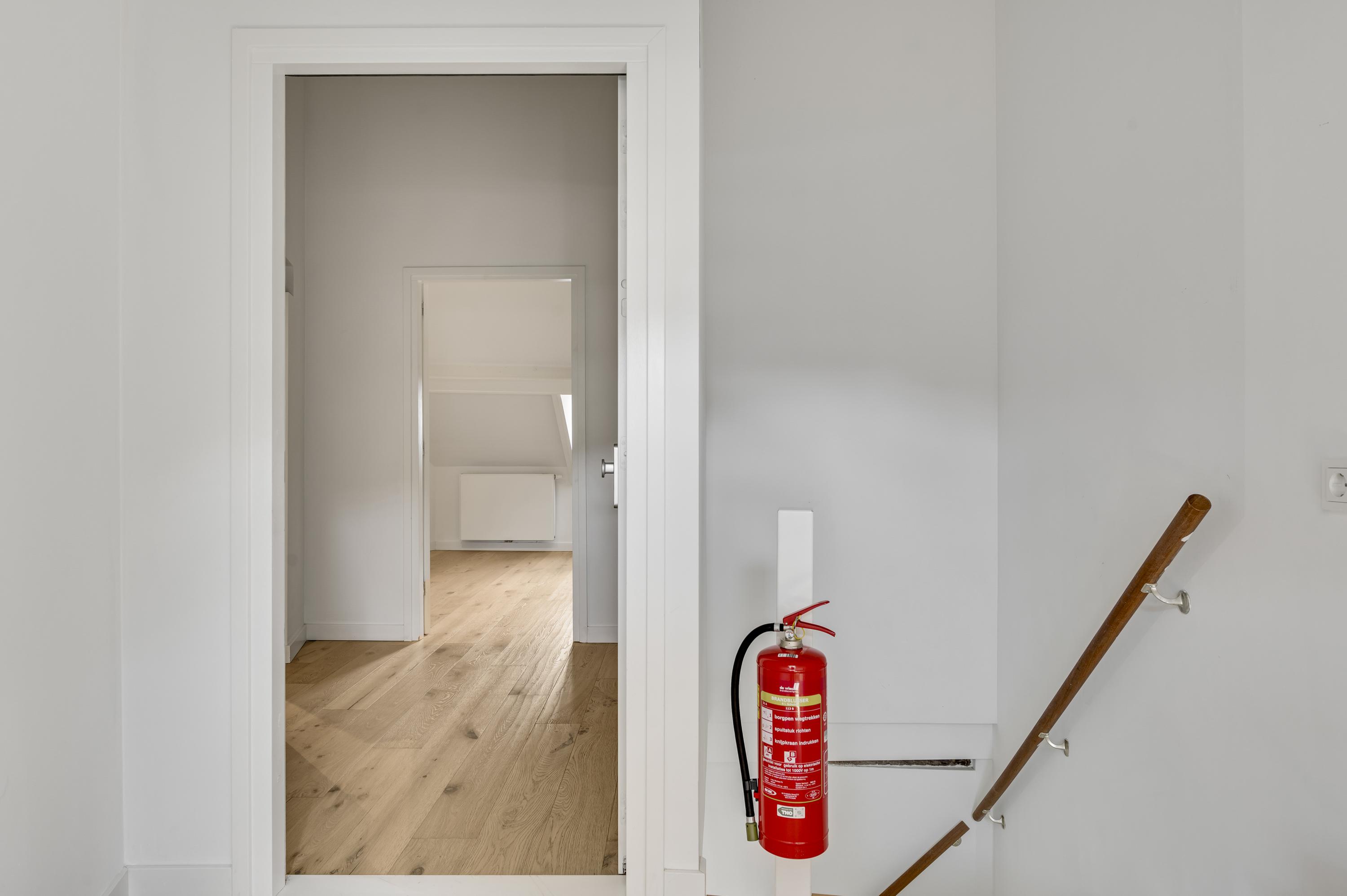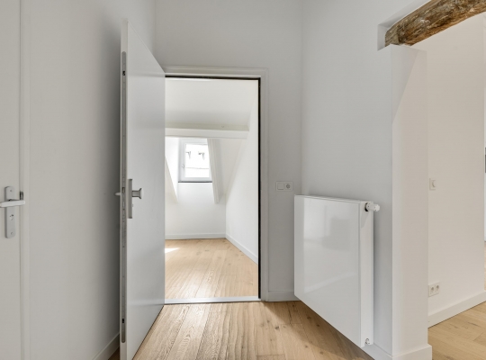 Aan het einde van de trap bereikt u een royaal portaal, met een dakkapel aan de voorzijde. Strak stucwerk is gecombineerd met een pvc-vloer, en vlak naast de trap is de deur naar het appartement. Achter deze deur is de hal, met aan de rechterzijde een recent vernieuwde toiletruimte. Mooi detail in de hal is de oude balk, boven de doorgang naar de woonkamer.