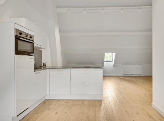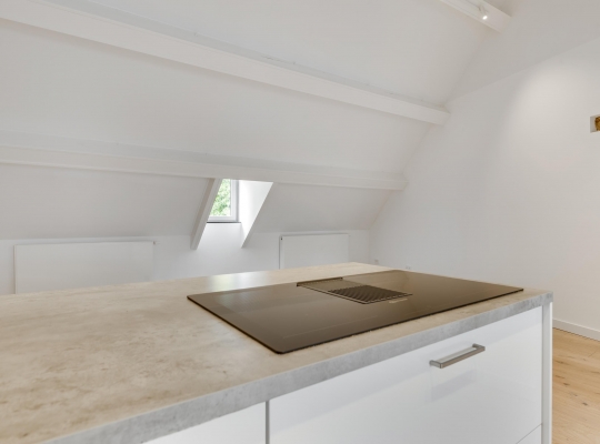De woonkamer met open keuken heeft een totale oppervlakte van circa 40 m2, boordevol sfeer en met een uitstekende afwerking. In de woonkamer is genoeg ruimte voor een grote zithoek met een loungebank, terwijl de eettafel in de keuken een plekje kan krijgen. Het zicht tot in de hoge nok zorgt, samen met de dakkapellen en verlichting, voor een woonkamer en keuken met de wowfactor.