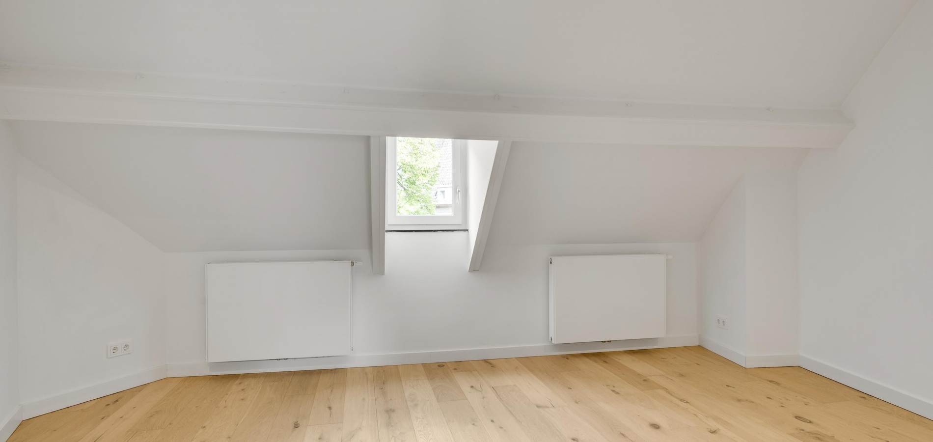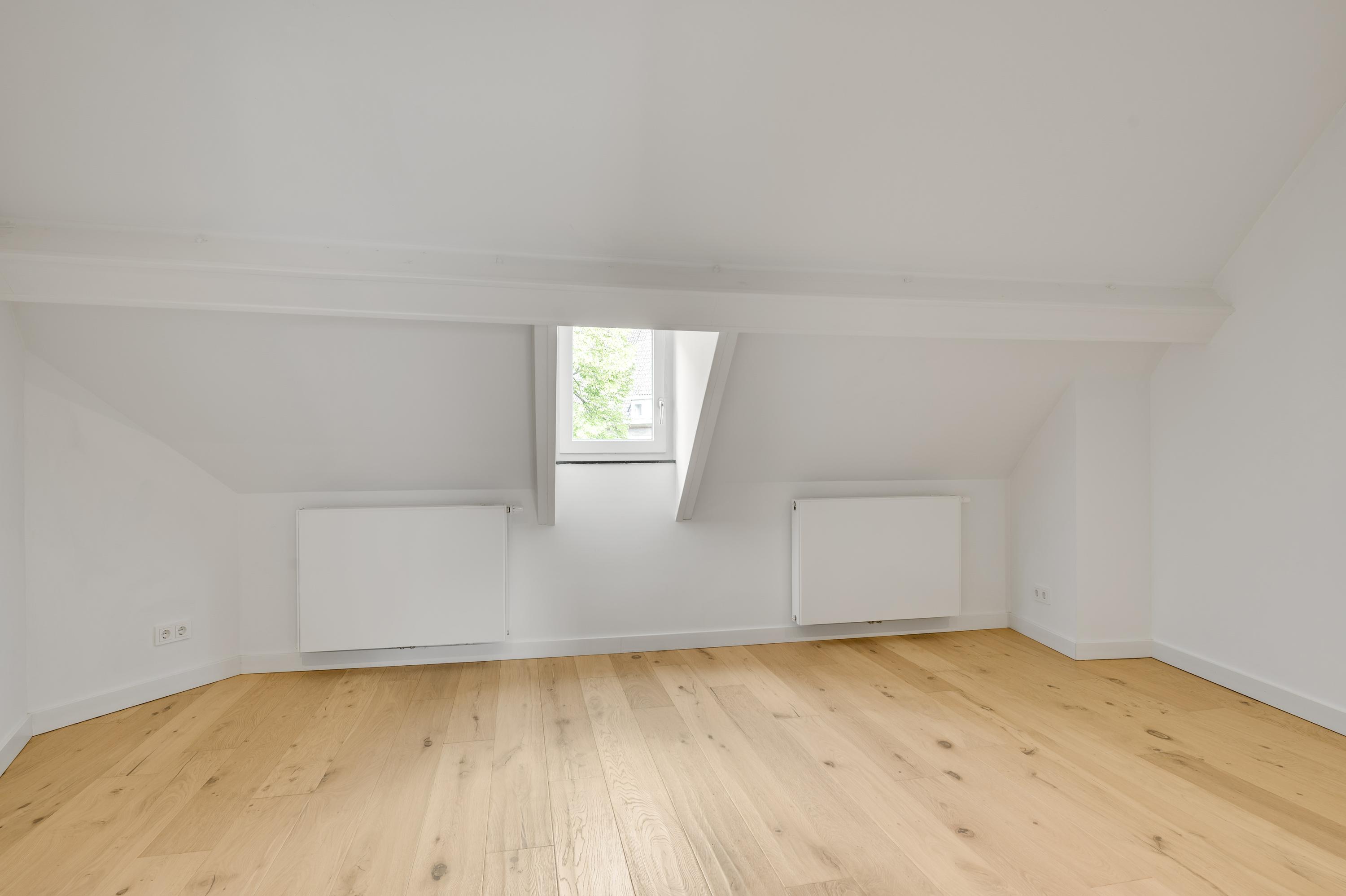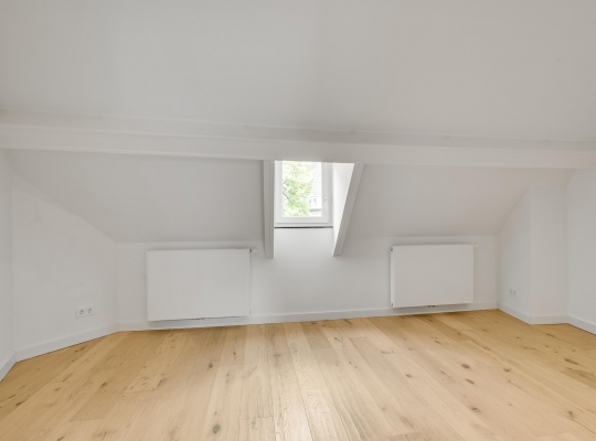 Niet alleen de woonkamer, maar ook de slaapkamer (circa 5,17 x 3,62) bevindt zich aan de voorzijde. Zet u het bed bij het schuine dak, onder het raam, of kiest u toch voor een andere indeling? Er is niet alleen genoeg plek voor een groot tweepersoonsbed, maar ook voor een grote garderobekast.