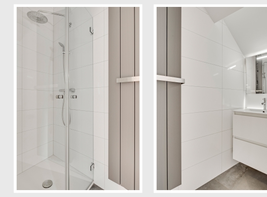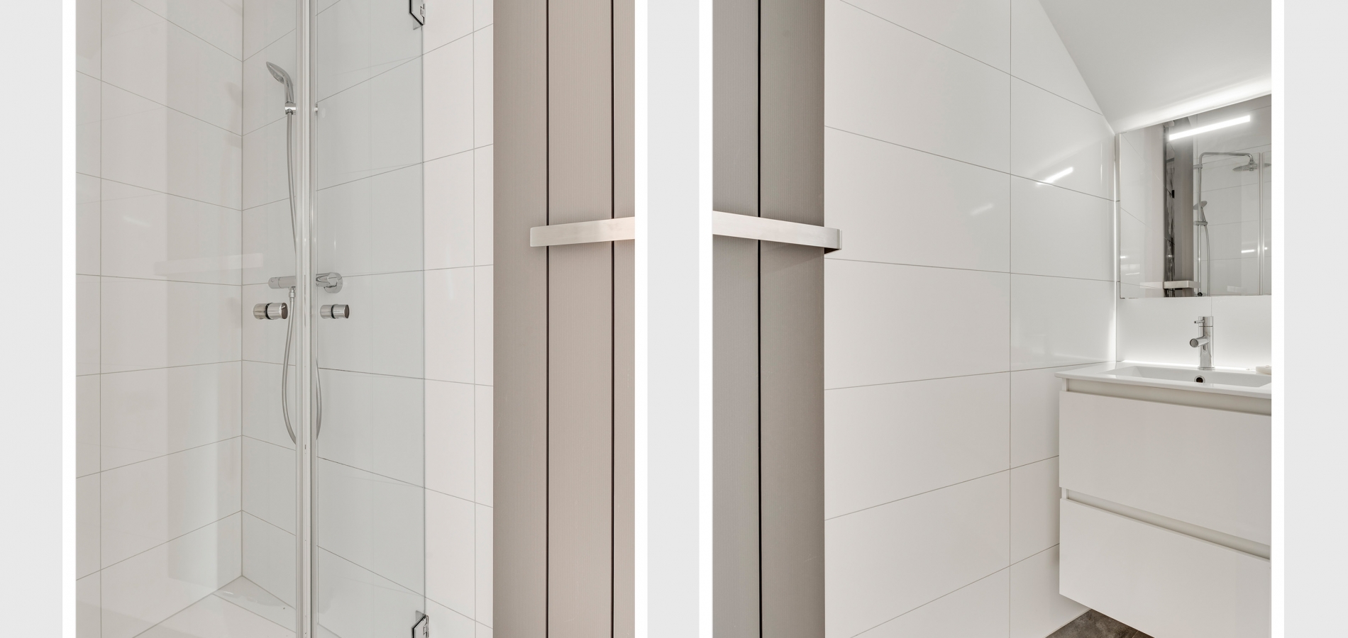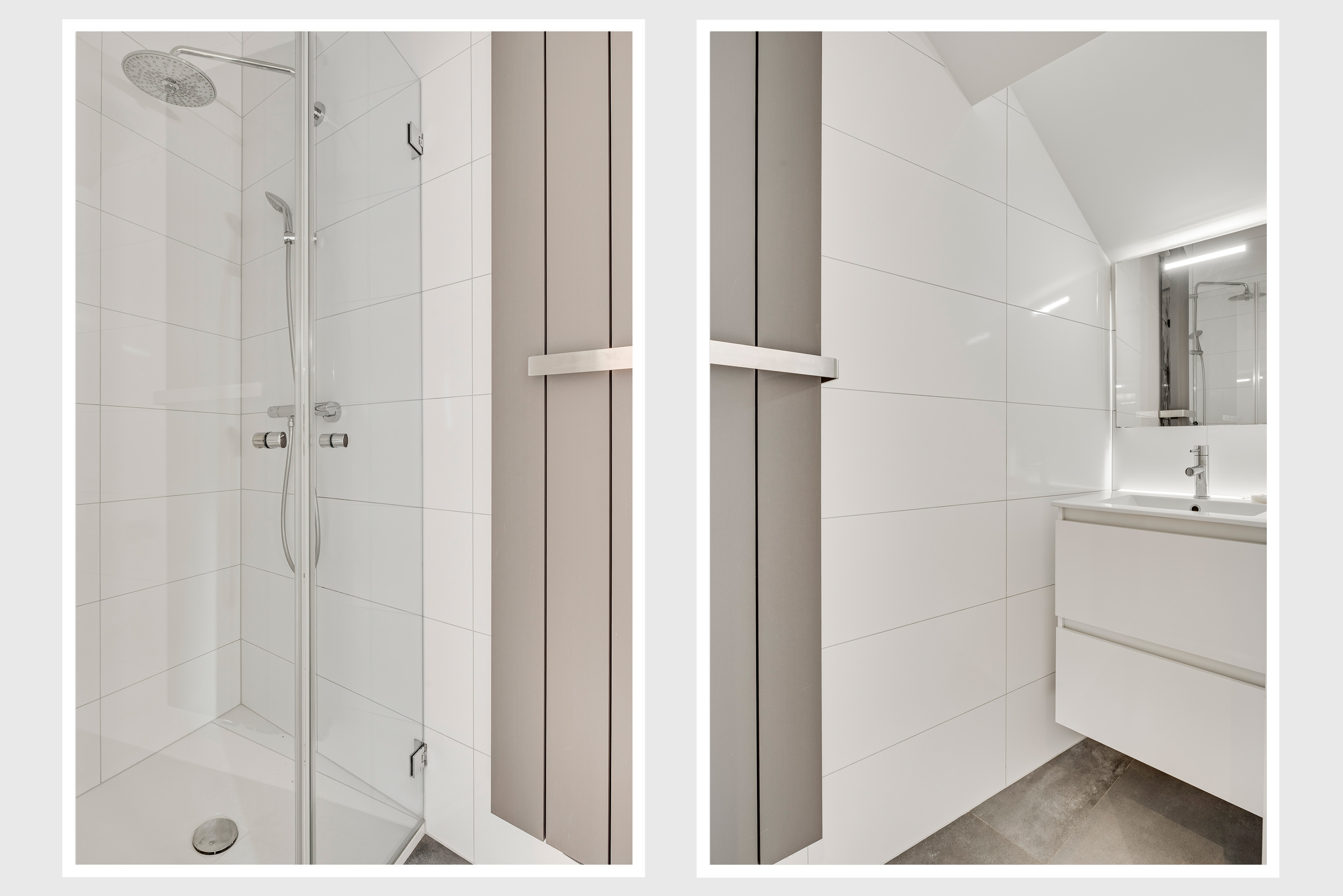 Vanuit de keuken is de slim ingedeelde badkamer (circa 2,75 x 1,13) te bereiken. Deze ruimte is, net als de rest van het appartement, recent vernieuwd. Grote, lichte wandtegels zijn gecombineerd met een antracietkleurige tegel en modern sanitair. U heeft de beschikking over een douche met een dubbele douchekop, een designradiator met handdoekenrek en een wastafelmeubel met grote spiegel.