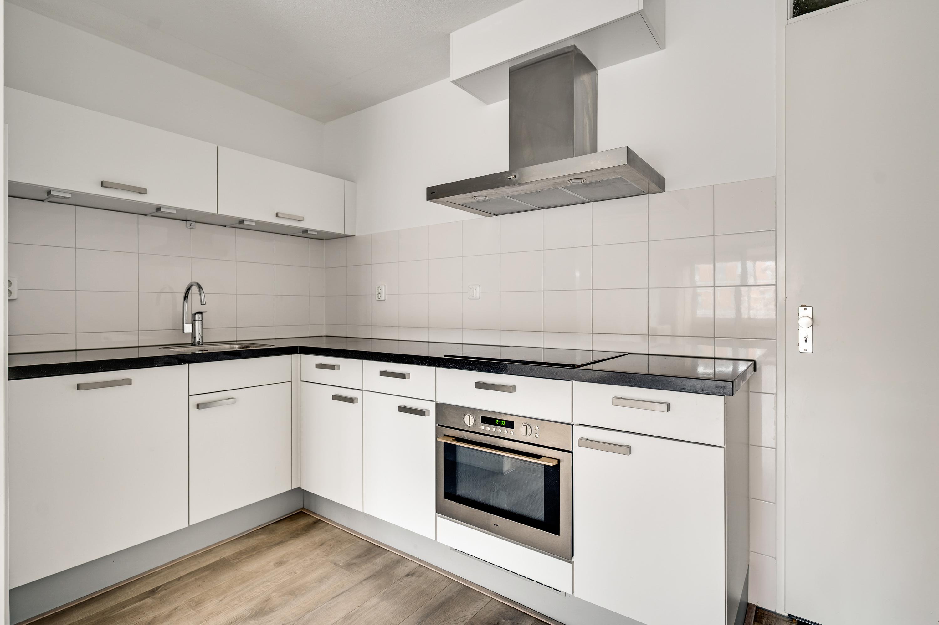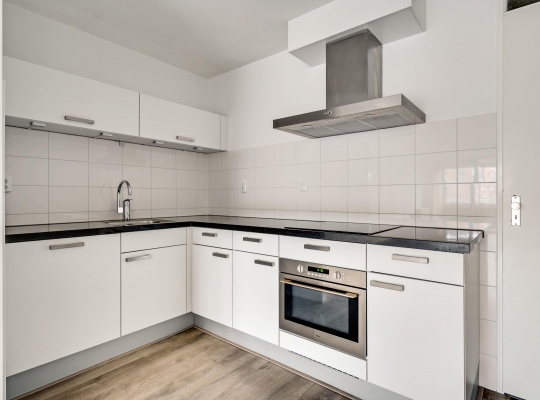 Naast de woonkamer is de halfopen keuken (circa 3,56 x 1,78), waar een lichte hoekopstelling staat. Het aanrechtblad is van natuursteen en de inductie kookplaat, afzuigkap, combi-oven en vaatwasser zijn ingebouwd. In de bijkeuken/berging (circa 3,56 x 1,18) is ruimte voor een koel-/vriescombinatie, de stofzuiger, strijkplank en andere spullen.