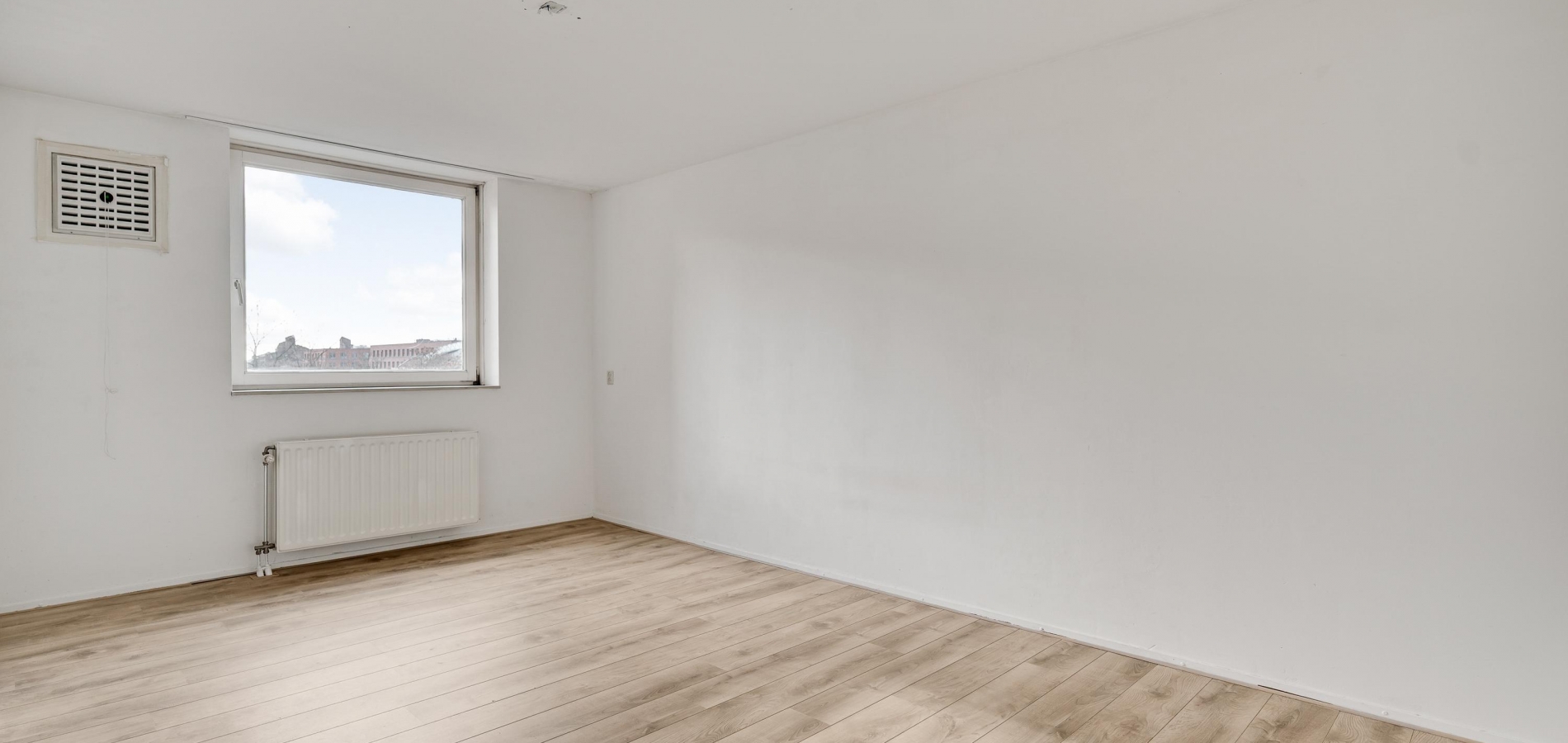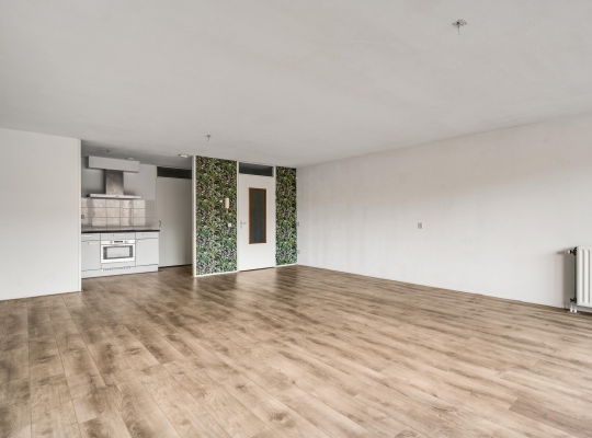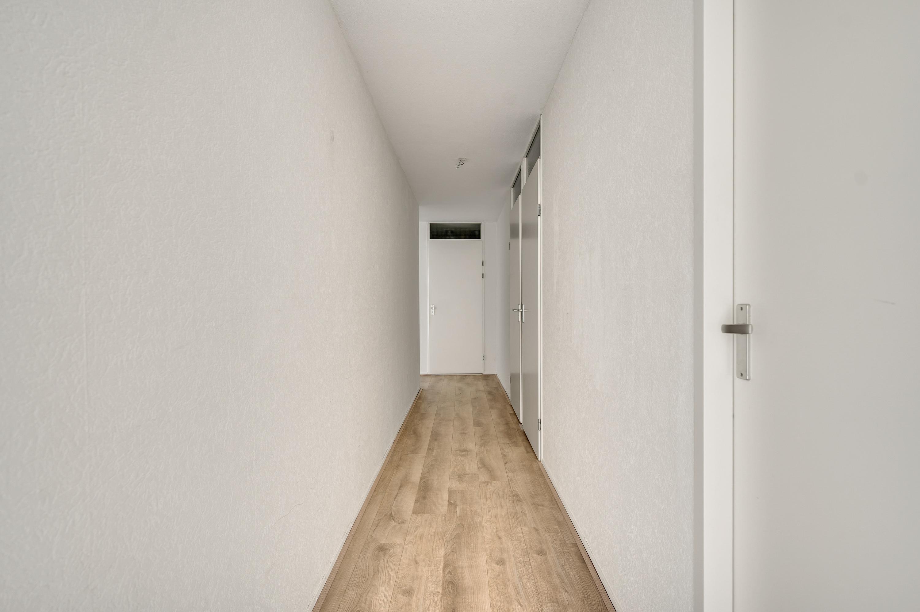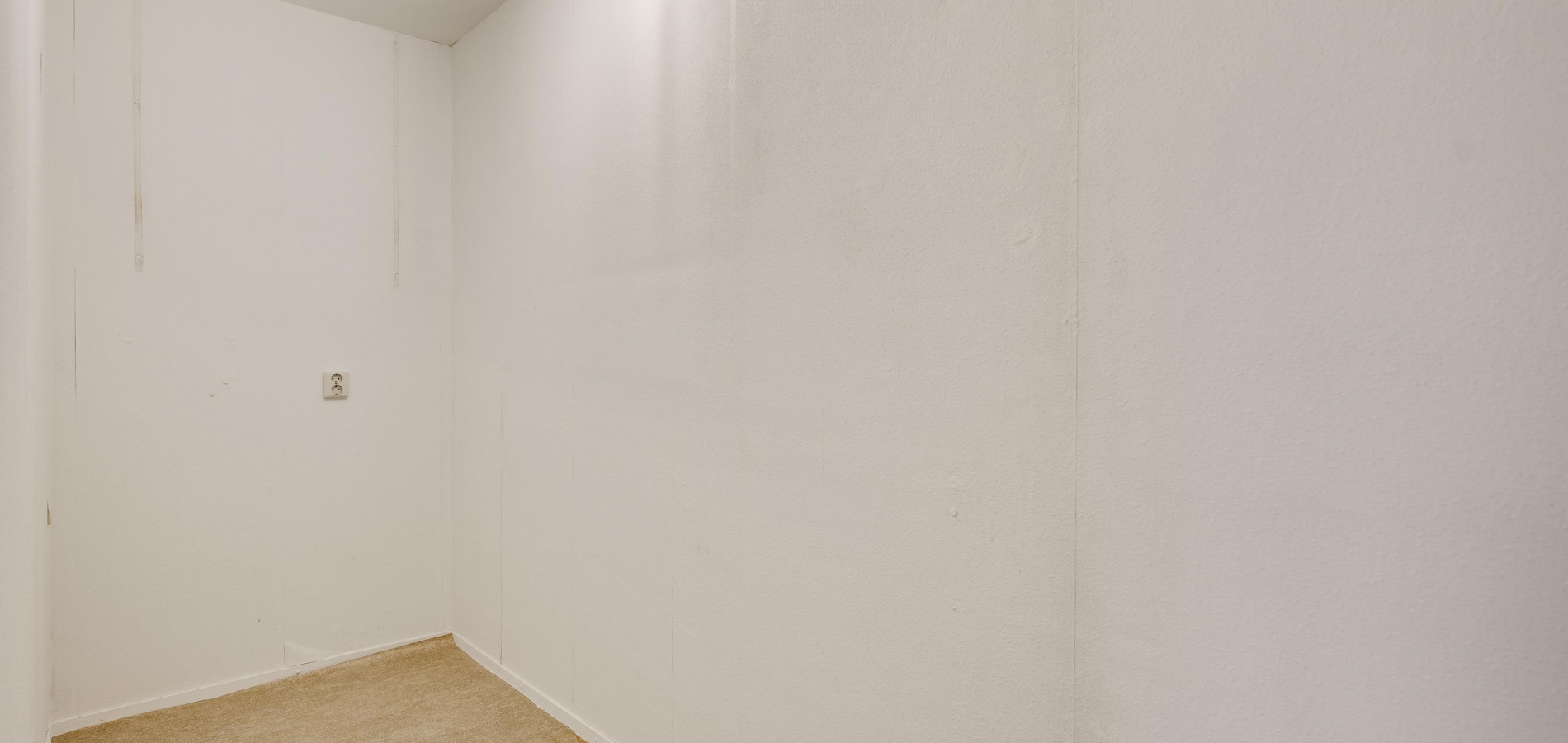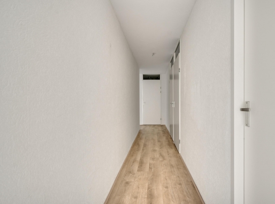 In de ruime hal ligt, net als in bijna het hele appartement, een mooie laminaatvloer. De lichte kleuren op de wanden, het plafond en de binnendeuren vormen een goede basis om naar eigen smaak te gaan stylen. Links in de hal is een berging (circa 1,75 x 1,11), waar de wasmachine en droger kunnen staan.