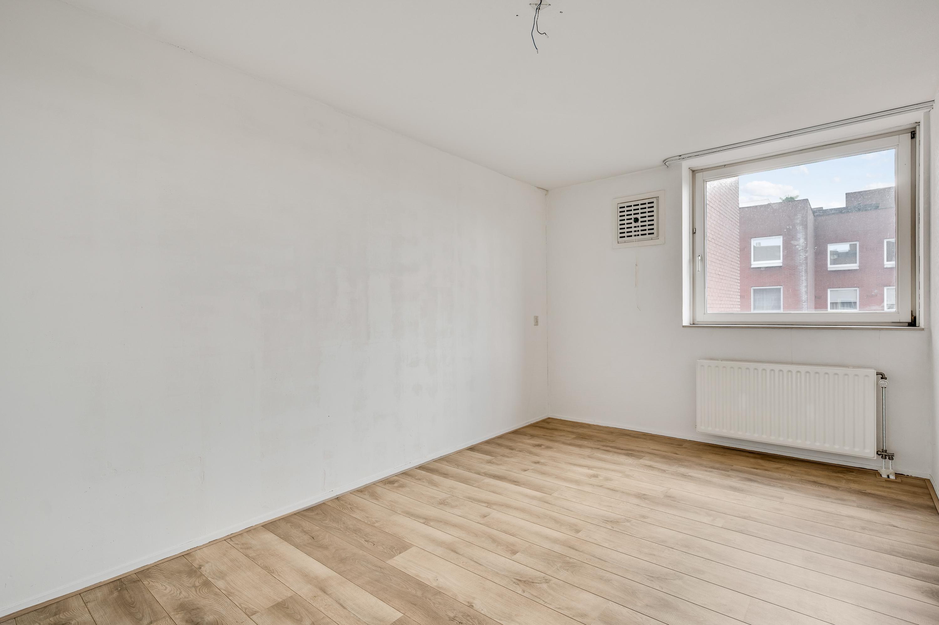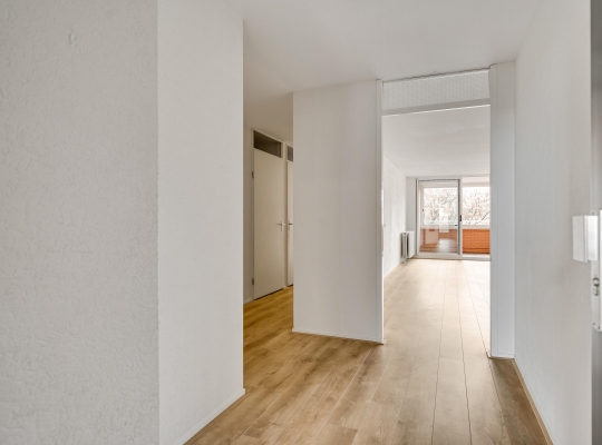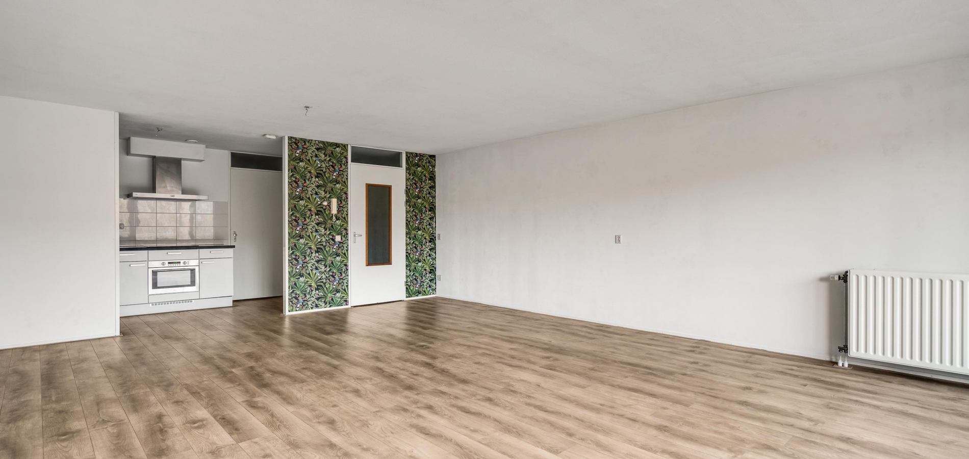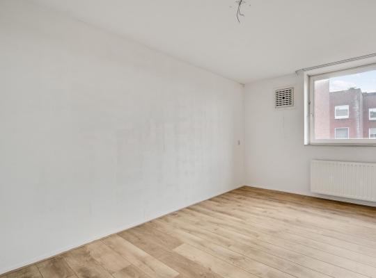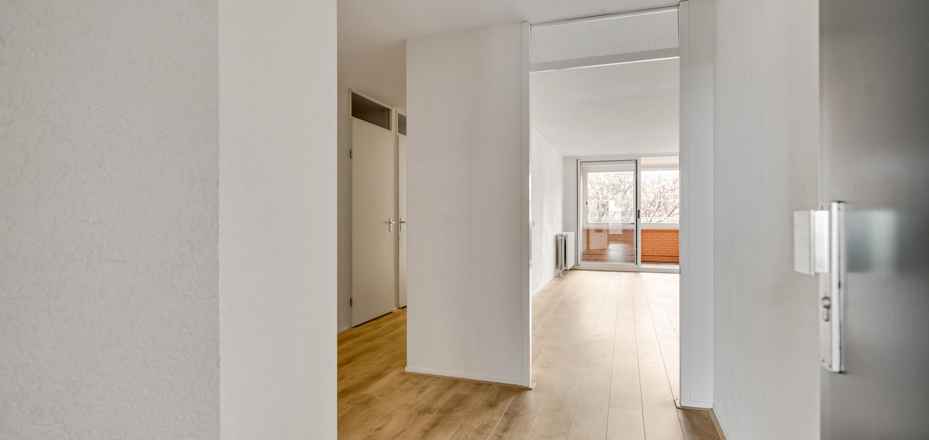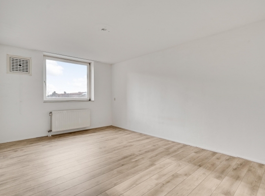 In de ruime hal ligt, net als in bijna het hele appartement, een mooie laminaatvloer. De lichte kleuren op de wanden, het plafond en de binnendeuren vormen een goede basis om naar eigen smaak te gaan stylen. Links in de hal is een berging (circa 1,75 x 1,11), waar de wasmachine en droger kunnen staan.