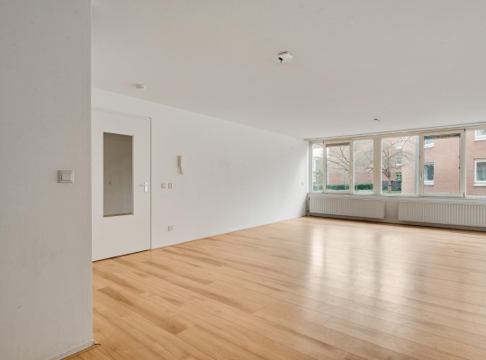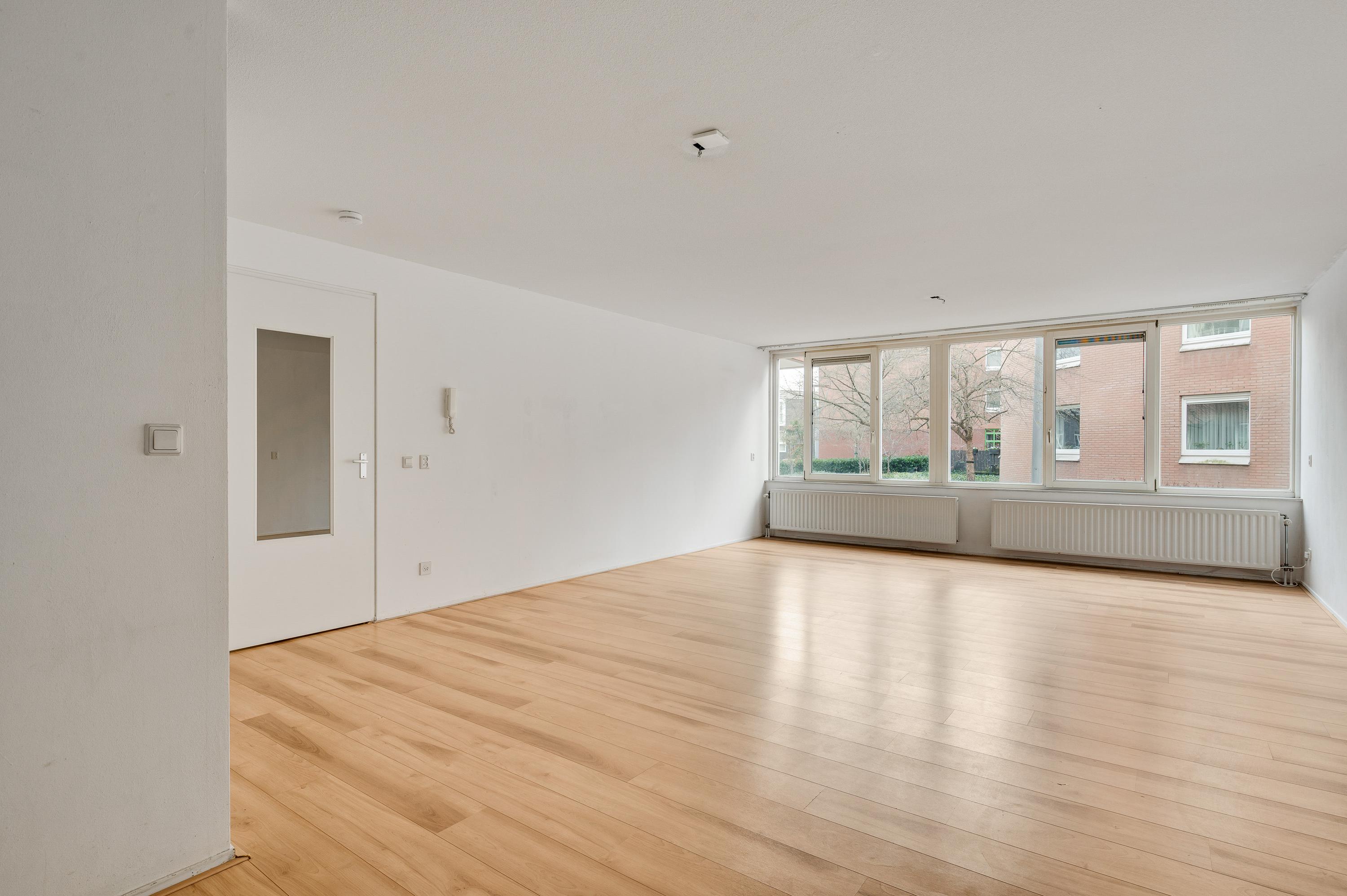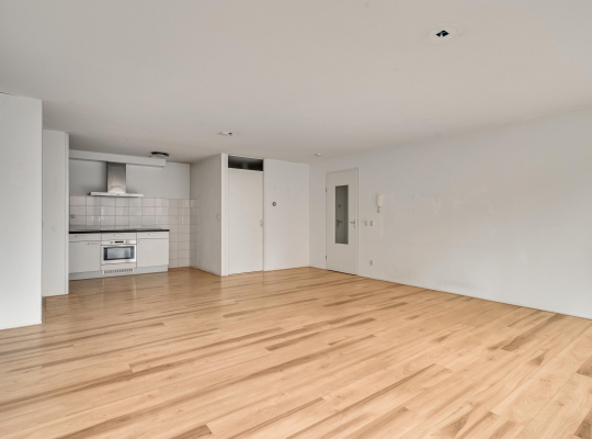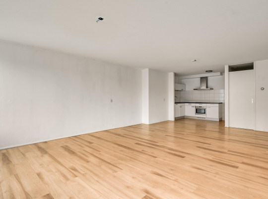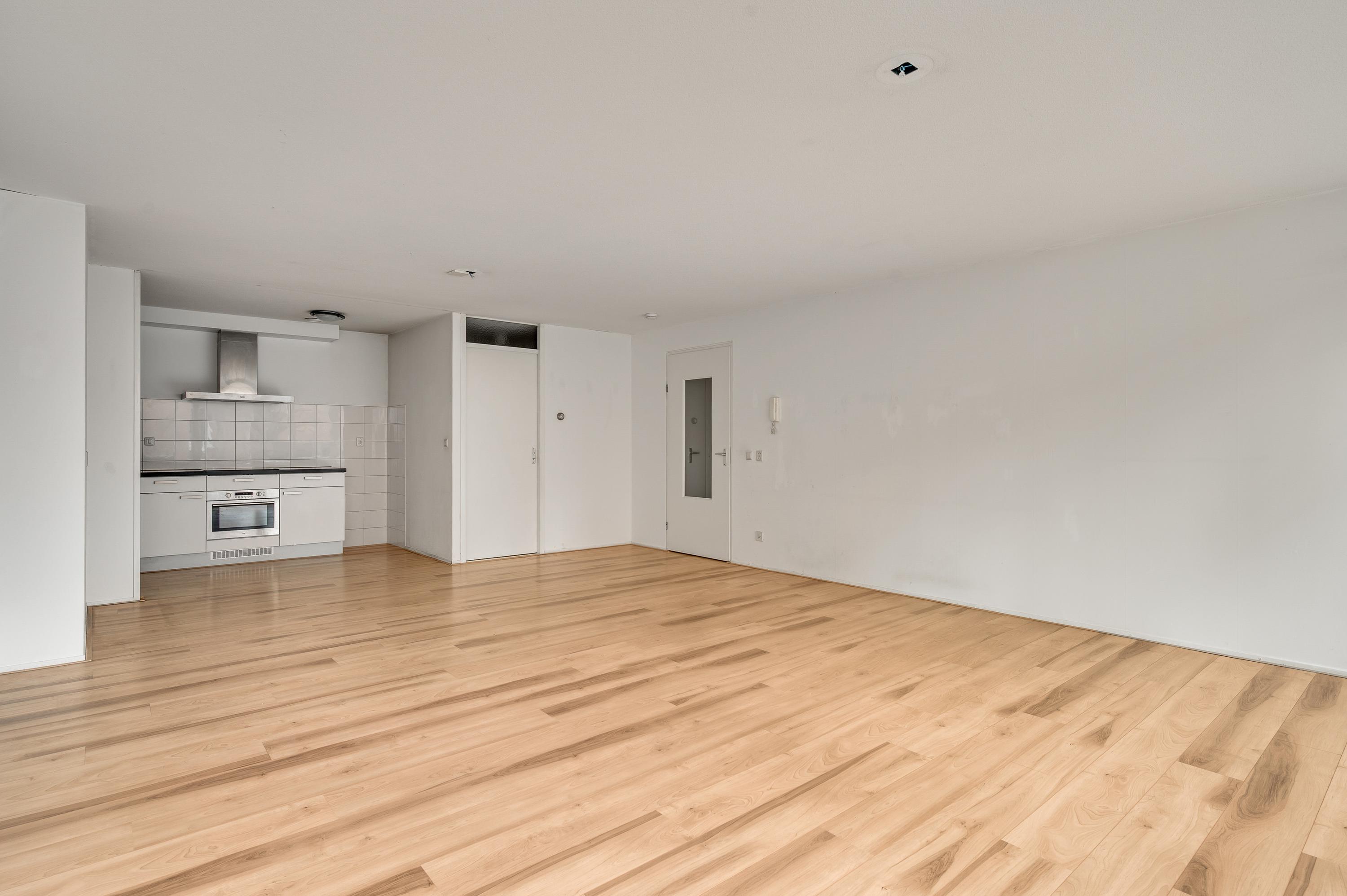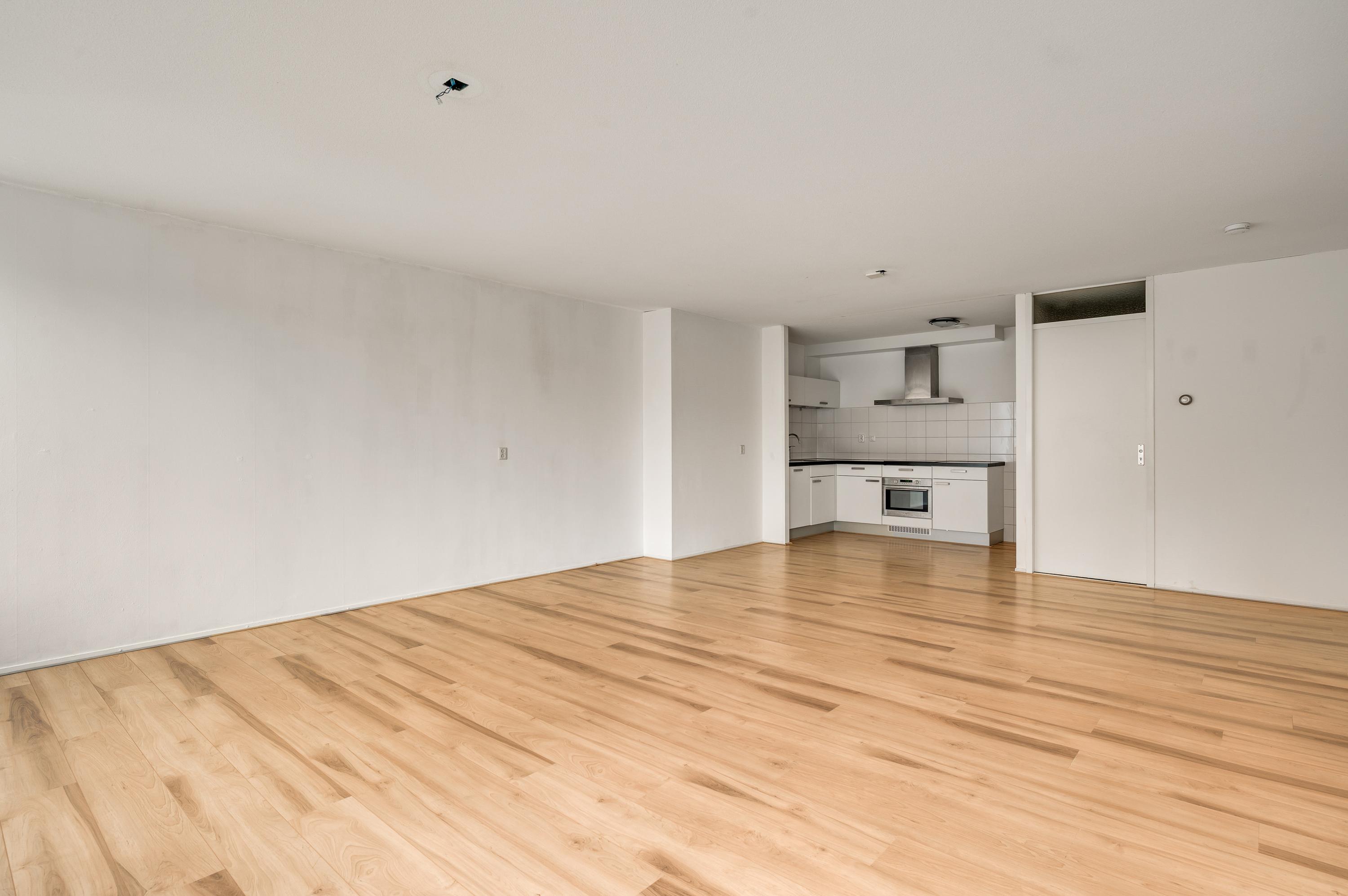 De woonkamer (circa 6,98 x 5,17) staat in open verbinding met de keuken (circa 3,05 x 1,85). De gezamenlijke oppervlakte bedraagt ruim 40 m2, met grote ramen aan de zuidkant. Op de foto’s is de woonkamer leeg, maar er is genoeg plek voor een grote zithoek, de eettafel en de rest van uw interieur.