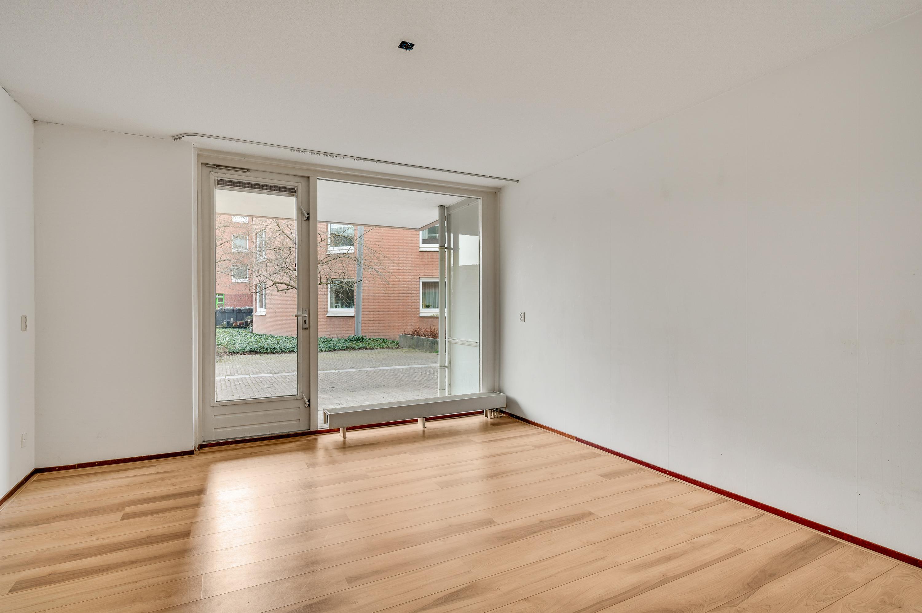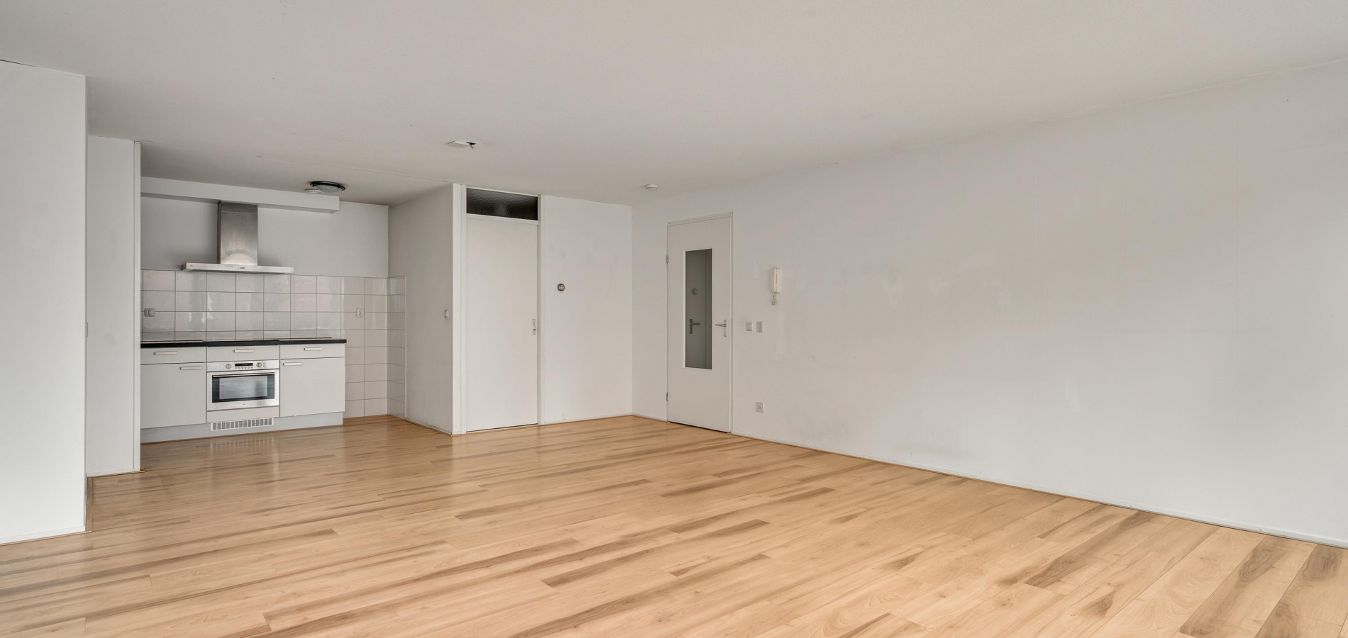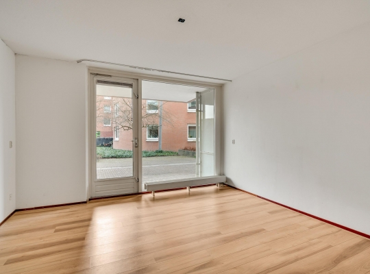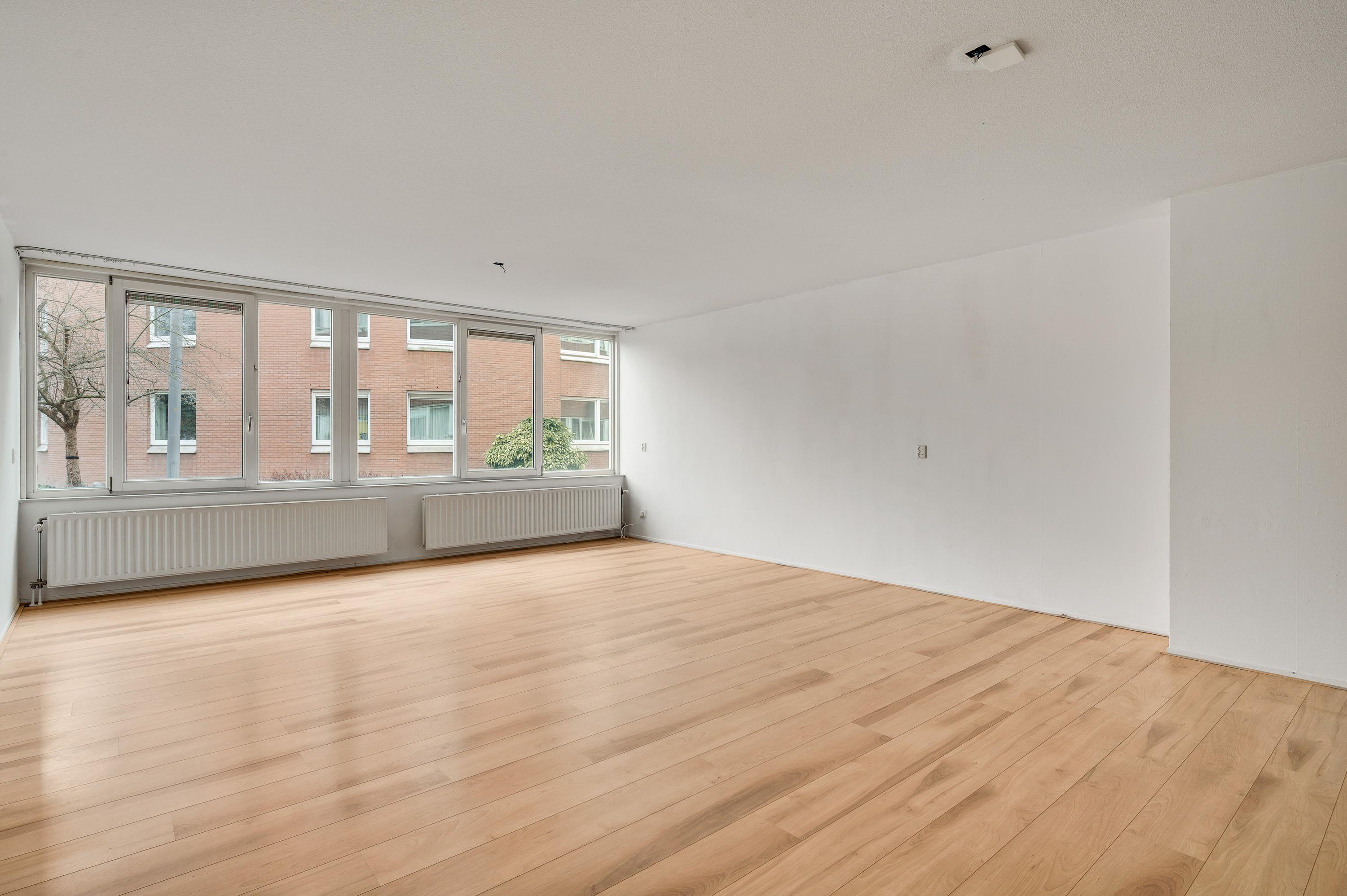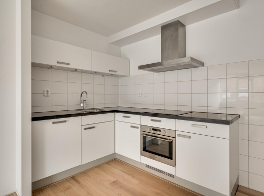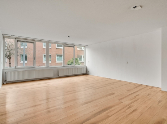 De woonkamer (circa 6,98 x 5,17) staat in open verbinding met de keuken (circa 3,05 x 1,85). De gezamenlijke oppervlakte bedraagt ruim 40 m2, met grote ramen aan de zuidkant. Op de foto’s is de woonkamer leeg, maar er is genoeg plek voor een grote zithoek, de eettafel en de rest van uw interieur.