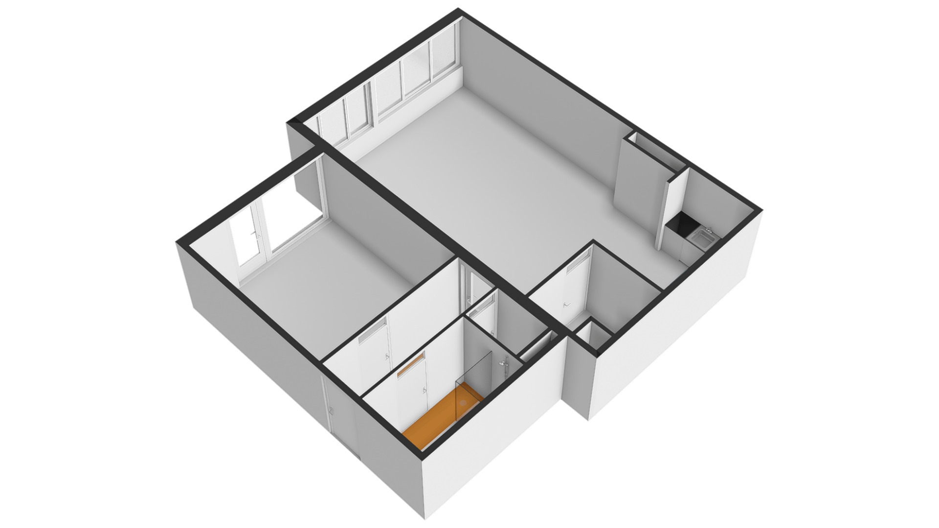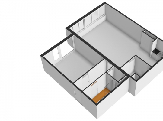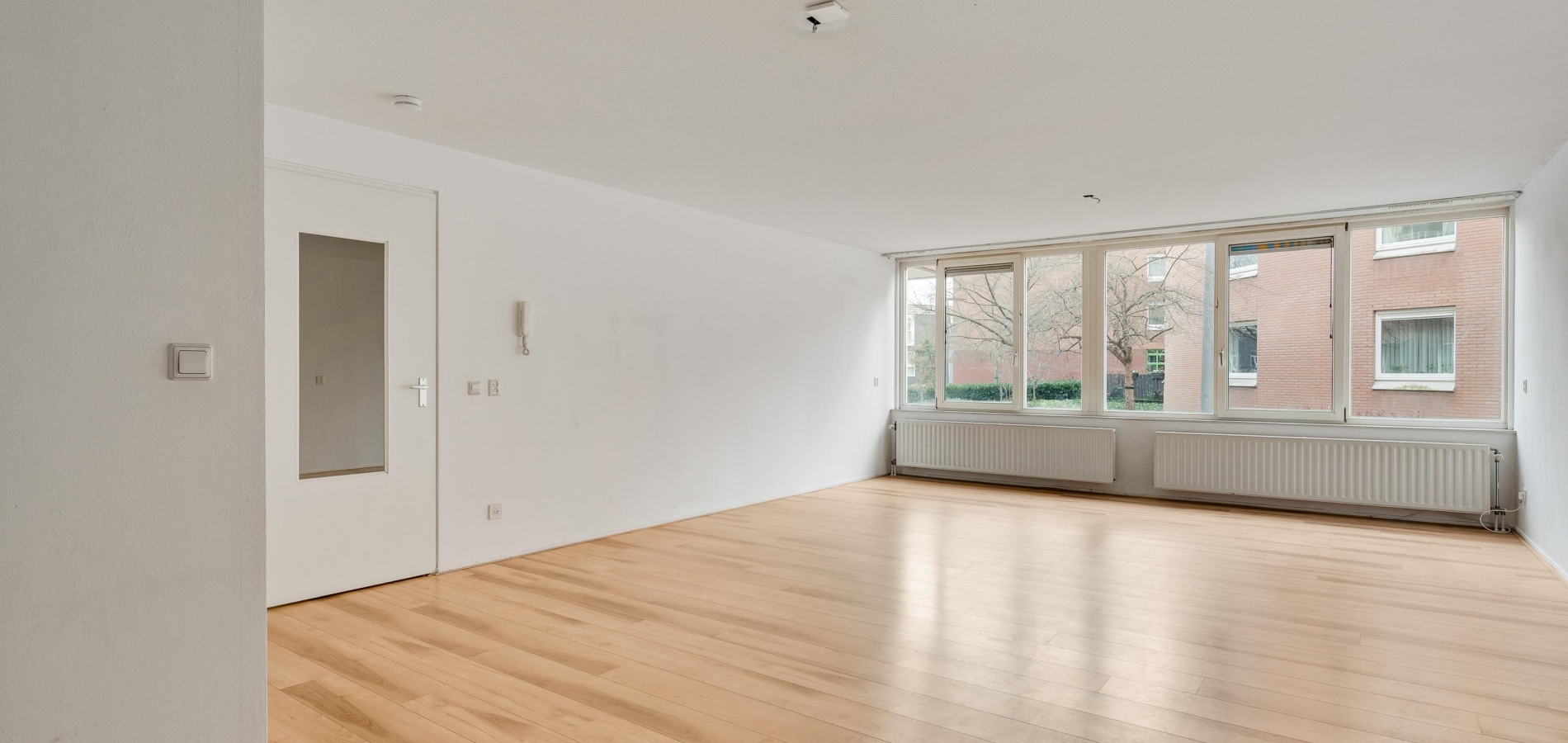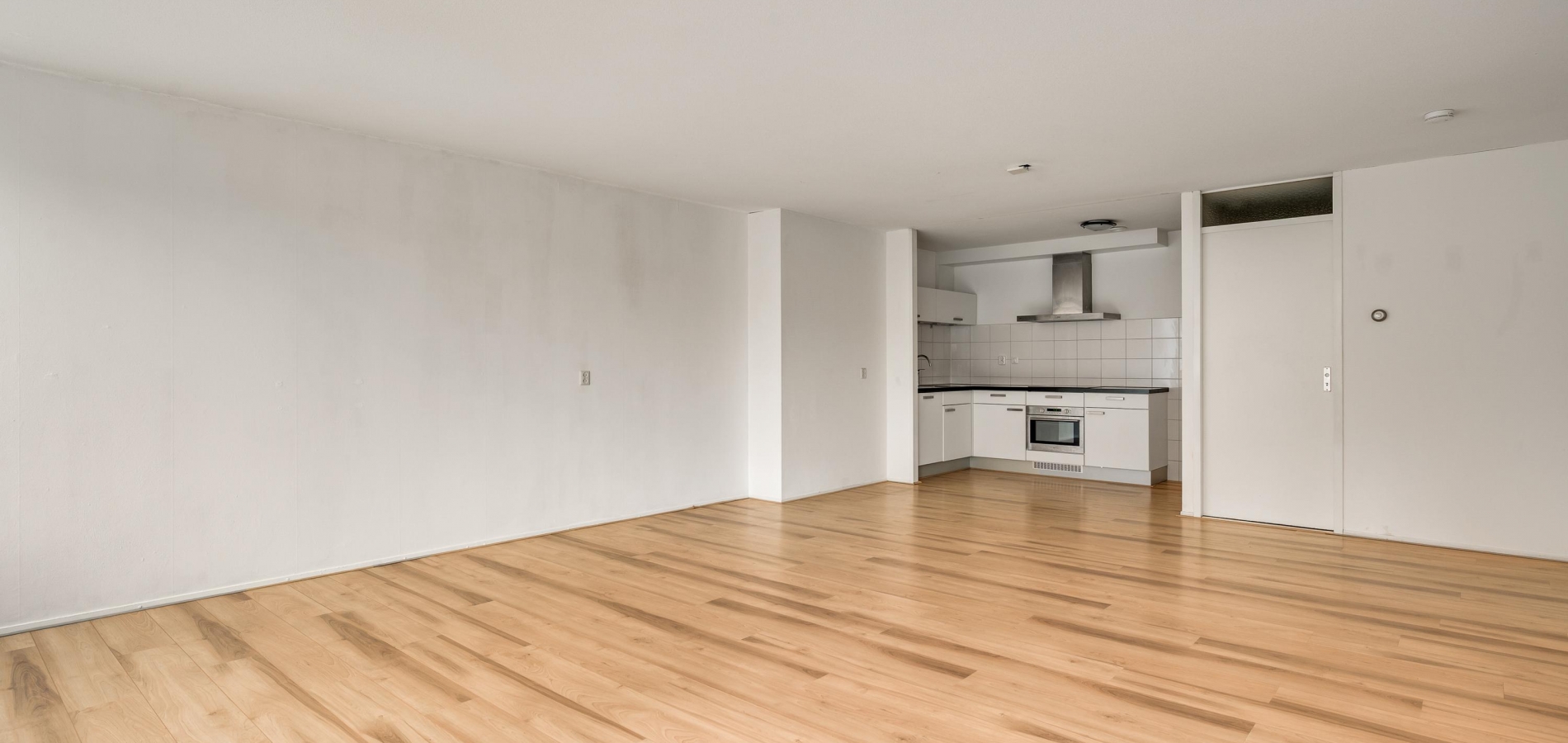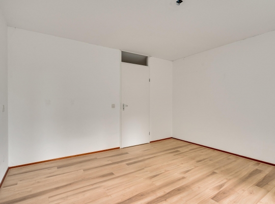 De woonkamer (circa 6,98 x 5,17) staat in open verbinding met de keuken (circa 3,05 x 1,85). De gezamenlijke oppervlakte bedraagt ruim 40 m2, met grote ramen aan de zuidkant. Op de foto’s is de woonkamer leeg, maar er is genoeg plek voor een grote zithoek, de eettafel en de rest van uw interieur.