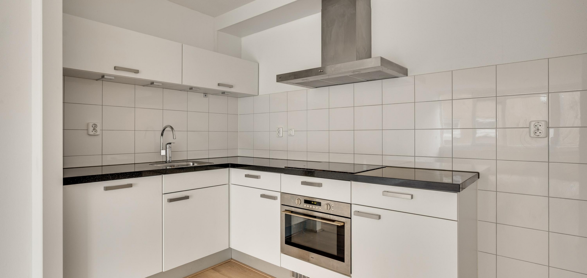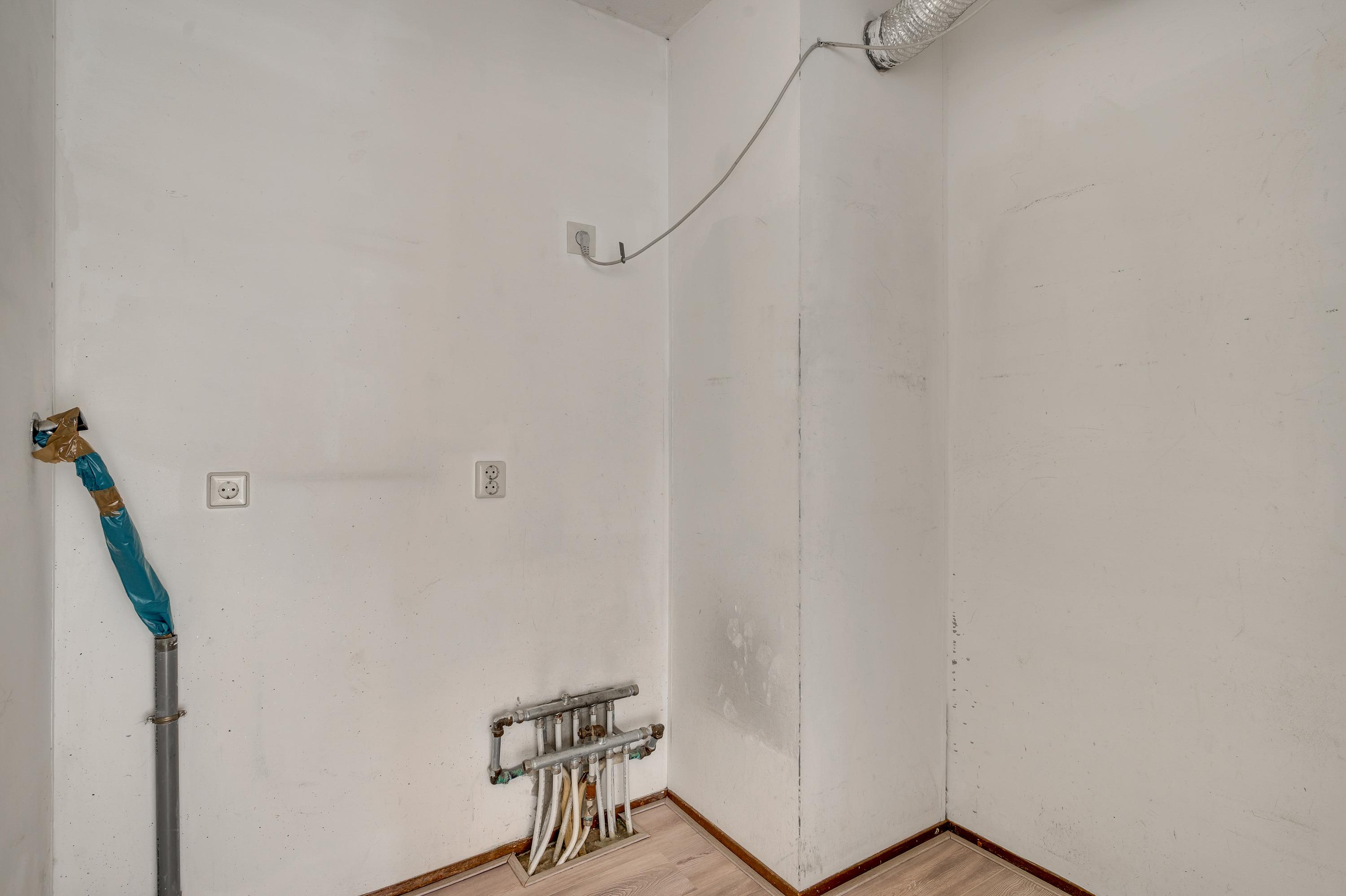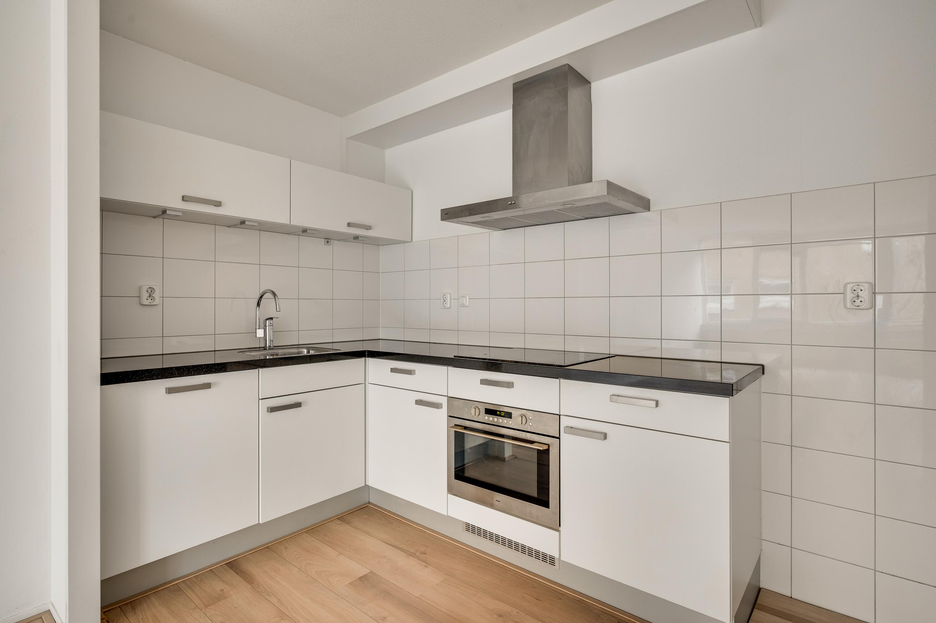 In de keuken staat een lichte hoekopstelling met een inductie kookplaat, afzuigkap, vaatwasser en een combi-oven. Voor een hoge koel-/vriescombinatie is genoeg plek in deze fijne keuken en in de naastgelegen berging (circa 2,02 x 1,79) is onder andere plek voor de wasapparatuur.