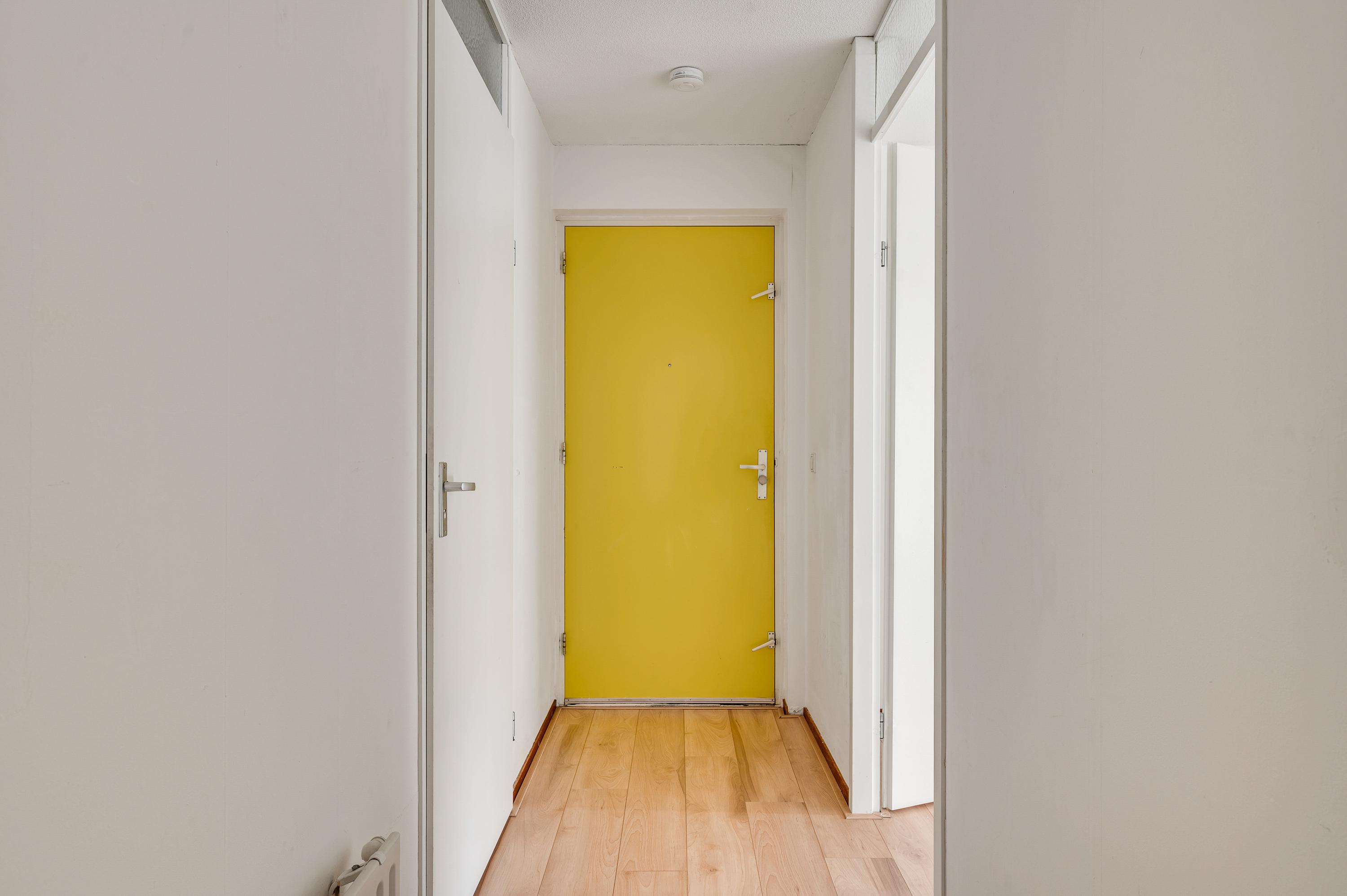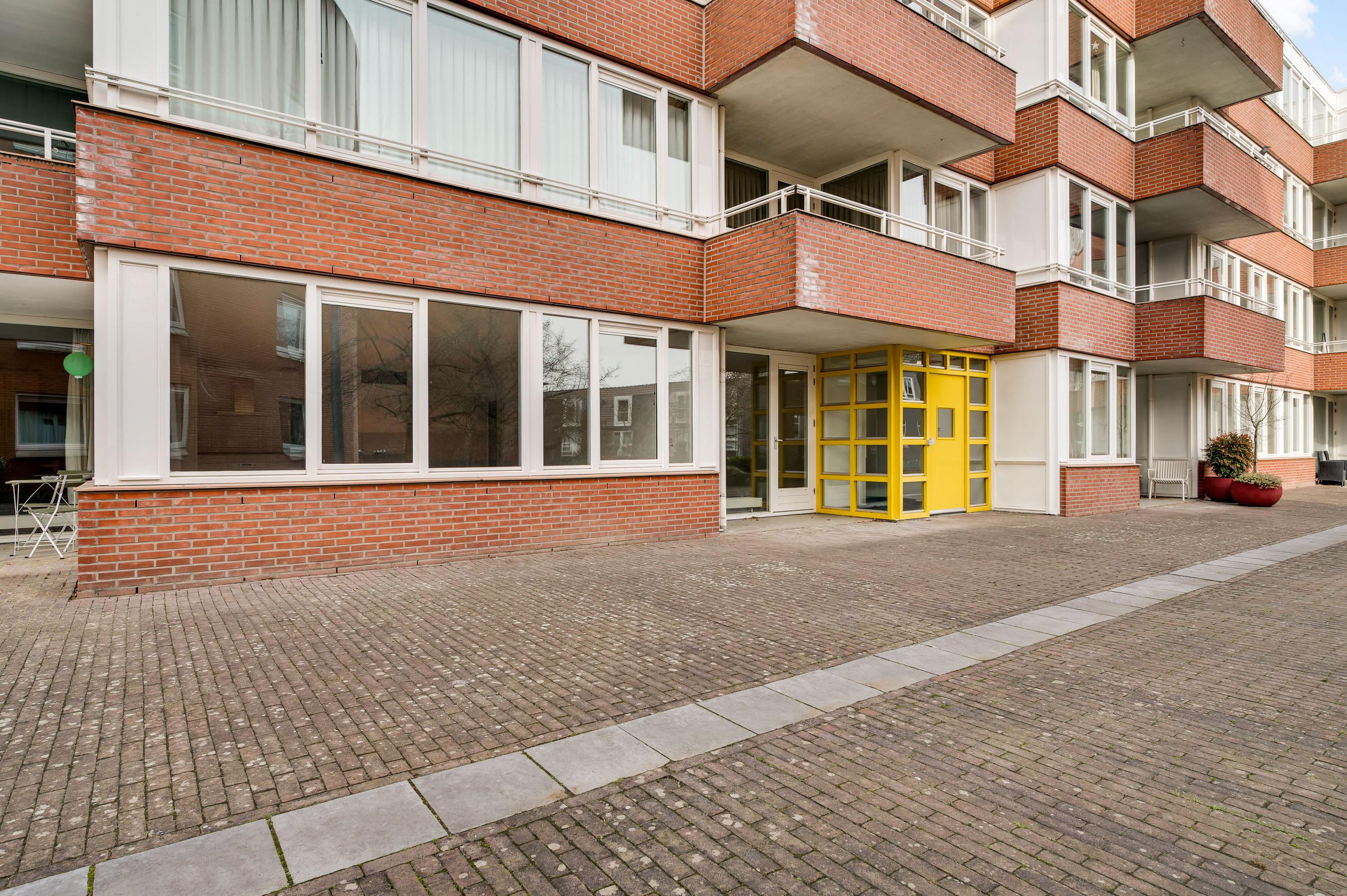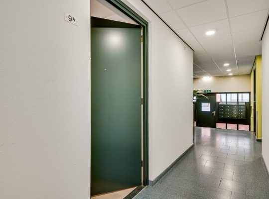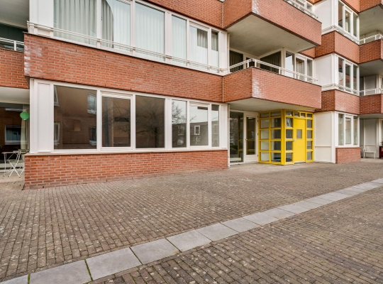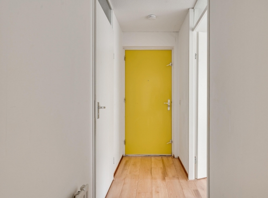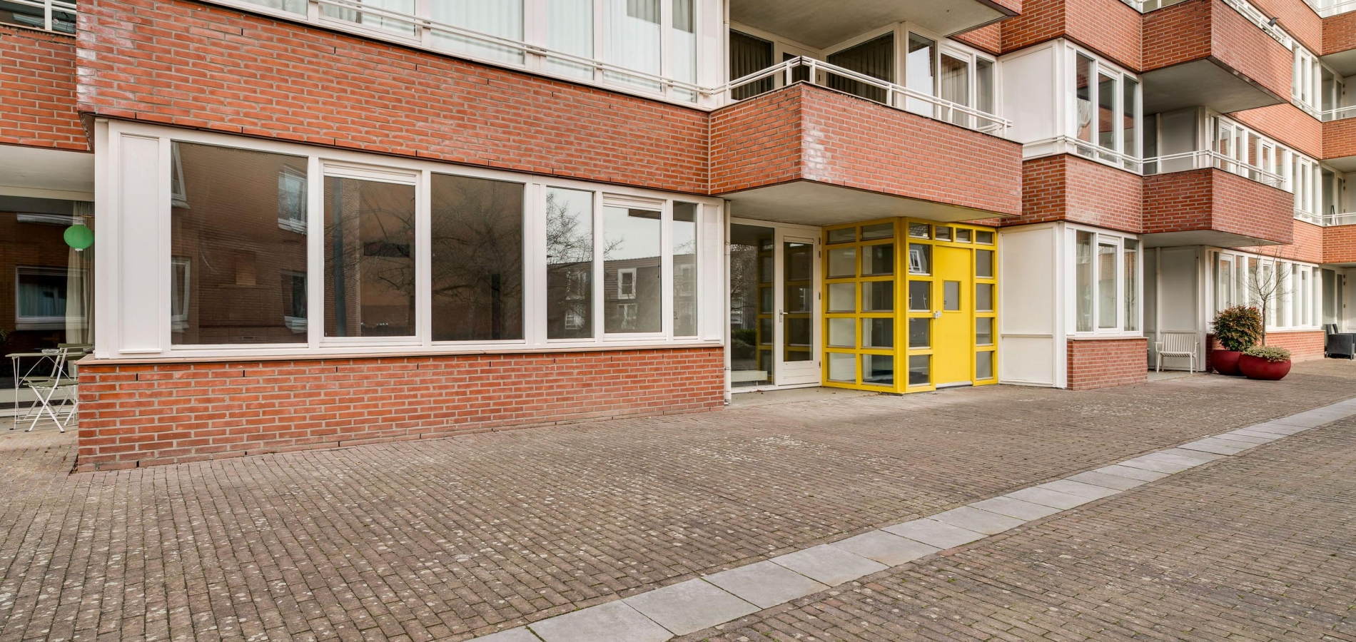 Dit appartement is te bereiken via de ‘gele’ entree, aan het begin van de Remalunet. Aan de buitenzijde is een trap, die naar de overdekte entree leidt. Wilt u geen trappen lopen, dan kunt u gebruikmaken van de entree aan de achterzijde van het gebouw.