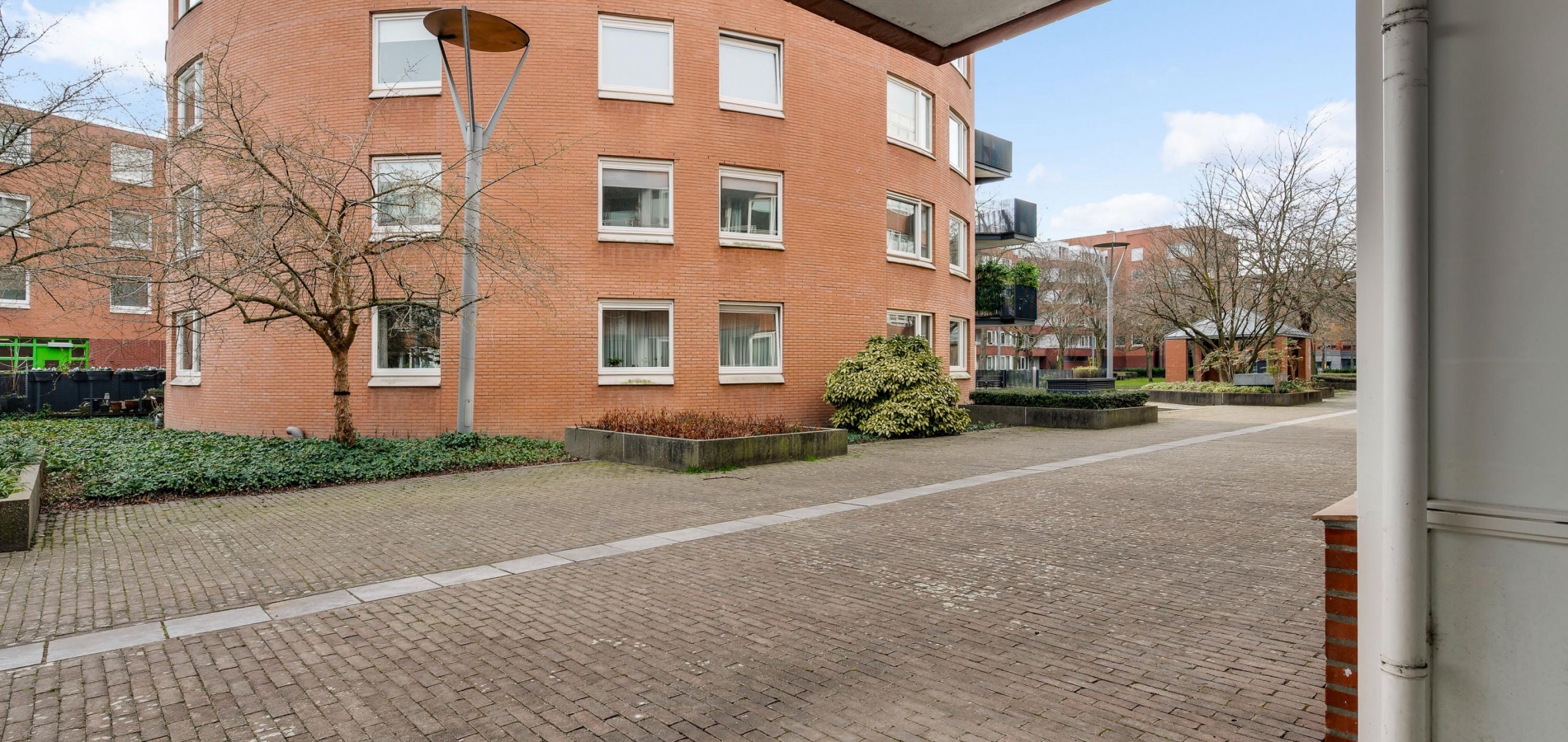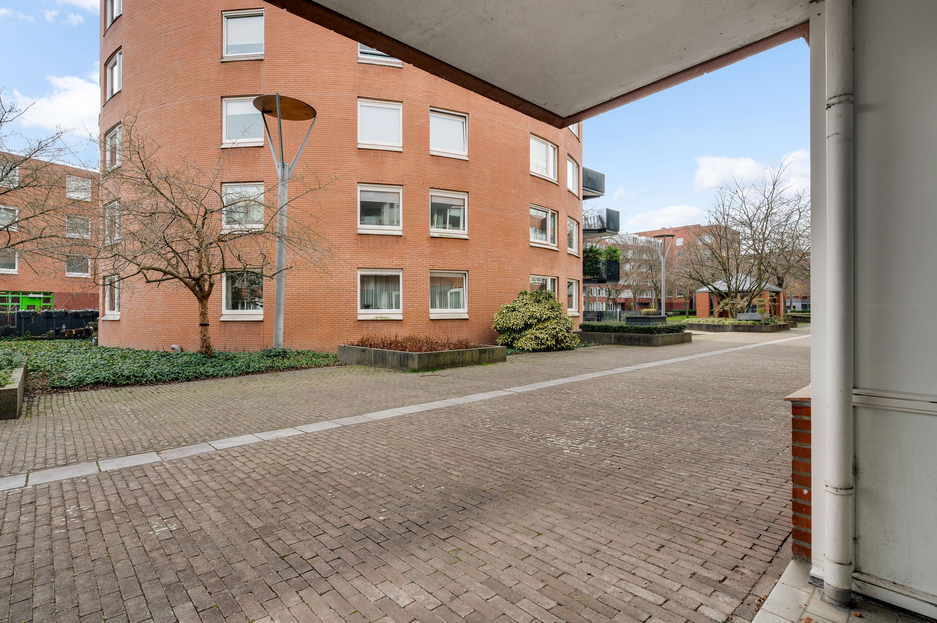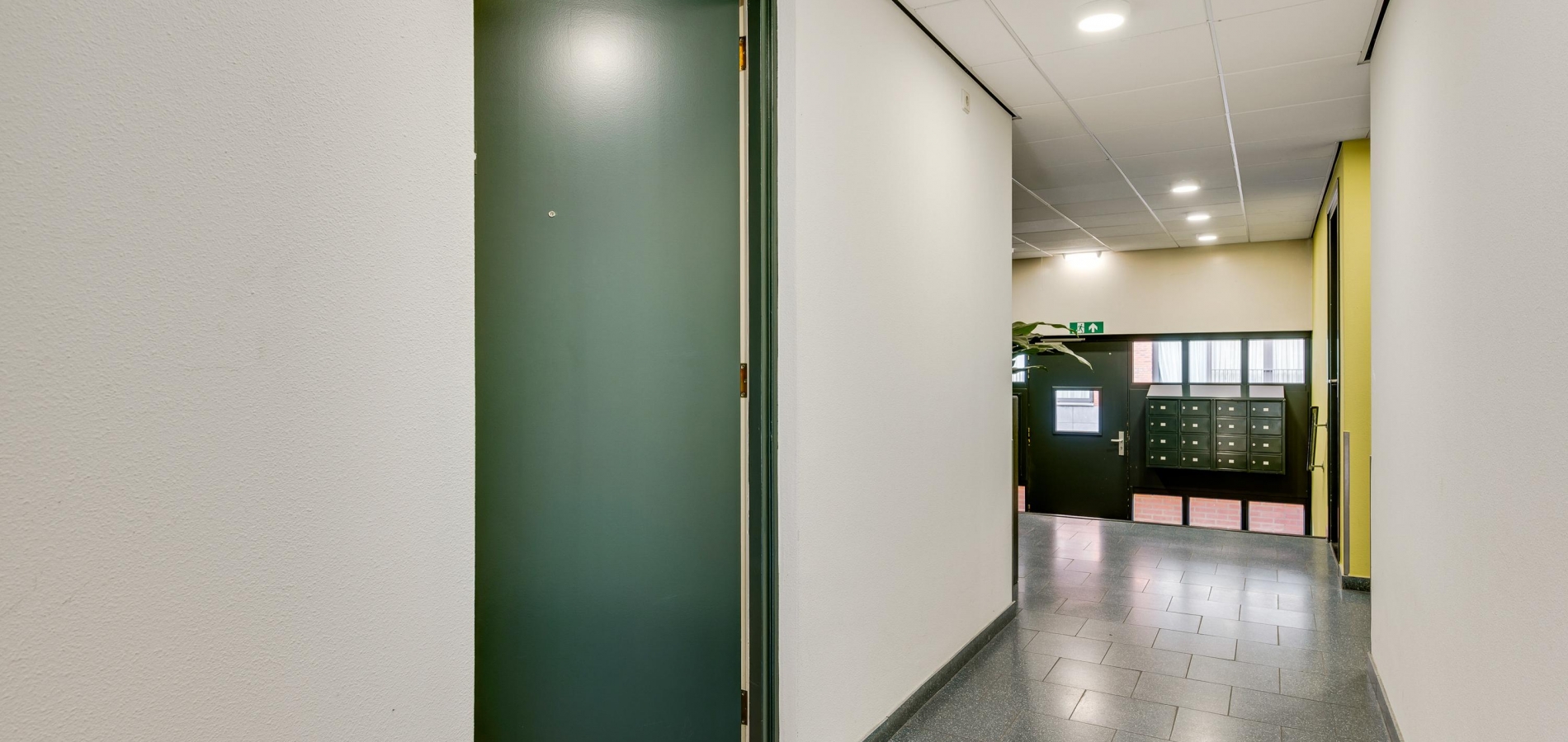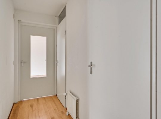 Dit appartement is te bereiken via de ‘gele’ entree, aan het begin van de Remalunet. Aan de buitenzijde is een trap, die naar de overdekte entree leidt. Wilt u geen trappen lopen, dan kunt u gebruikmaken van de entree aan de achterzijde van het gebouw.