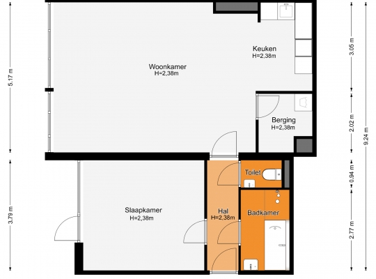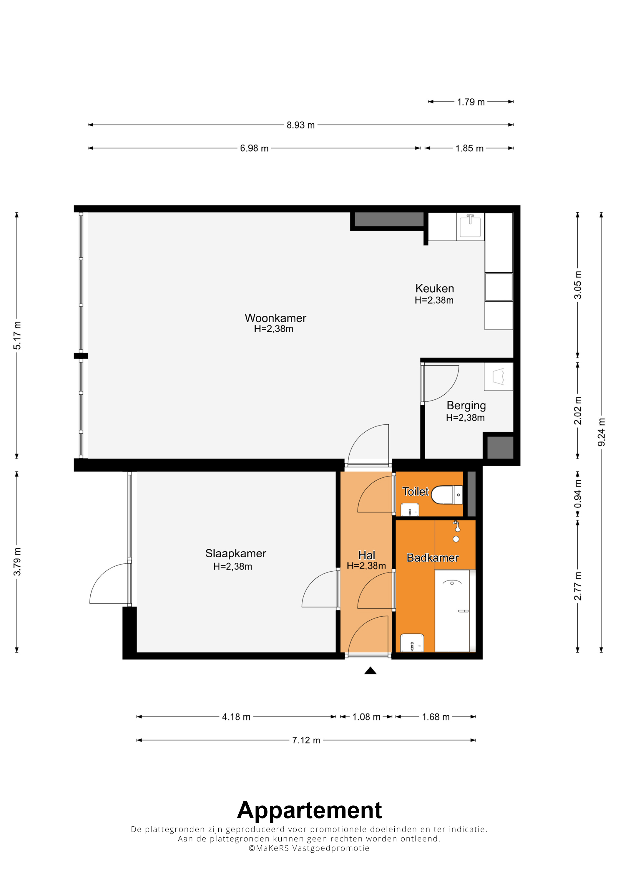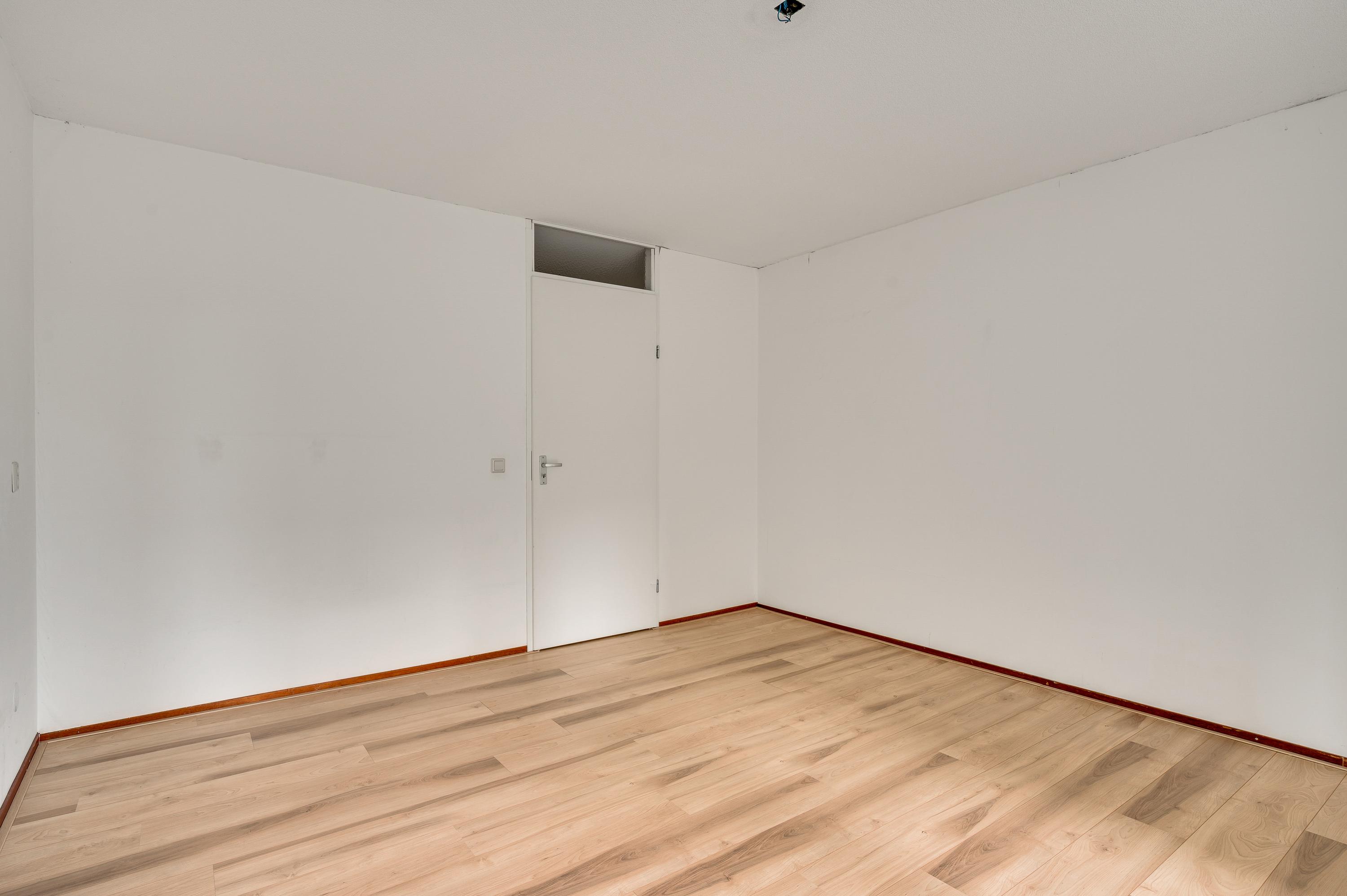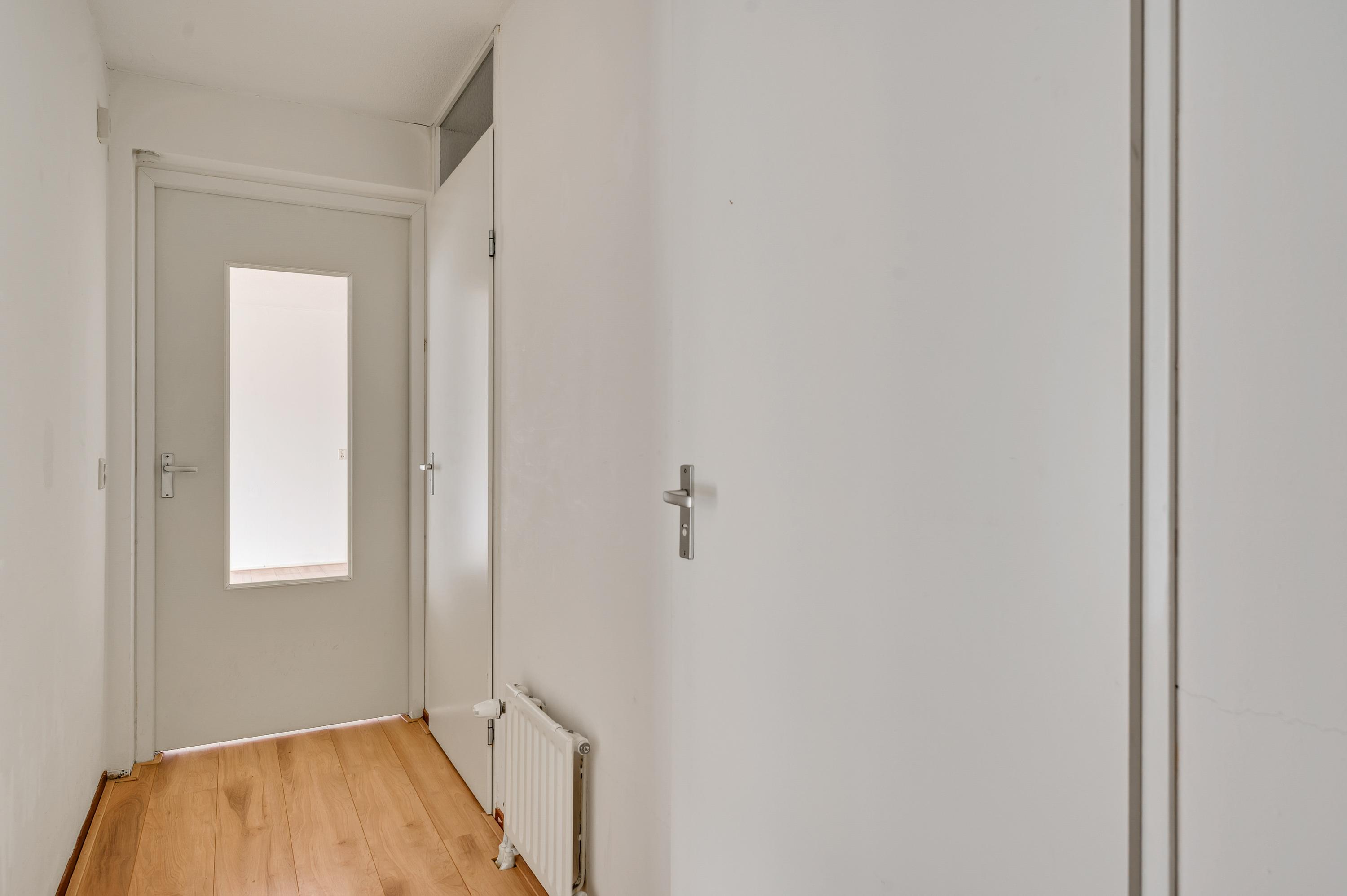 In de hal (circa 3,79 x 1,08) ligt, net als in bijna het hele appartement, laminaat op de vloer. Aan de linkerzijde is de ruime slaapkamer (circa 4,18 x 3,79), met een deur naar het terras en de binnentuin. De toiletruimte met fonteintje en de badkamer (circa 2,77 x 1,68) zijn aan de andere zijde van de hal. In de badkamer ziet u niet alleen een bad, maar ook een inloopdouche en een wastafel met spiegel en planchet.