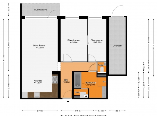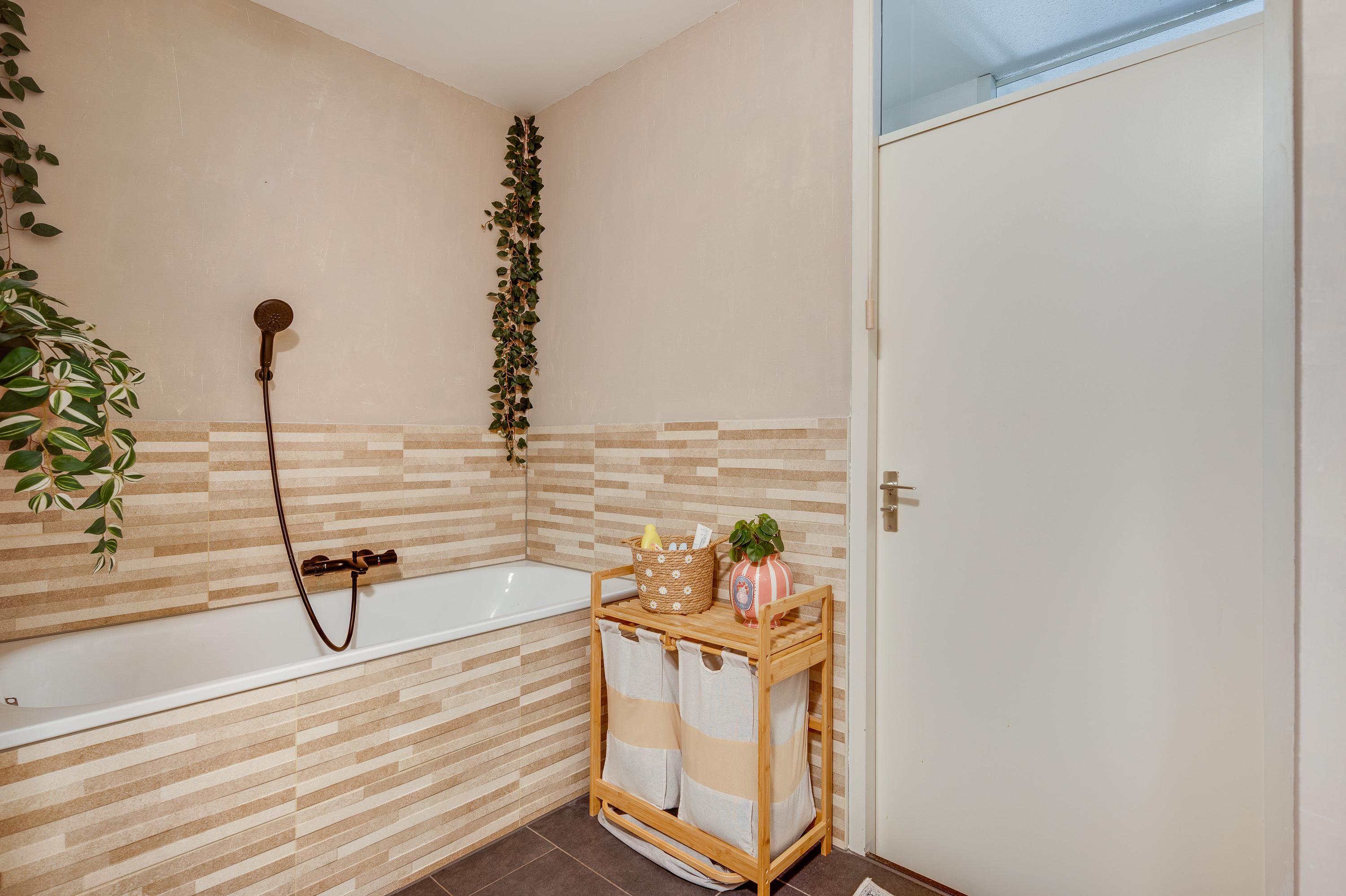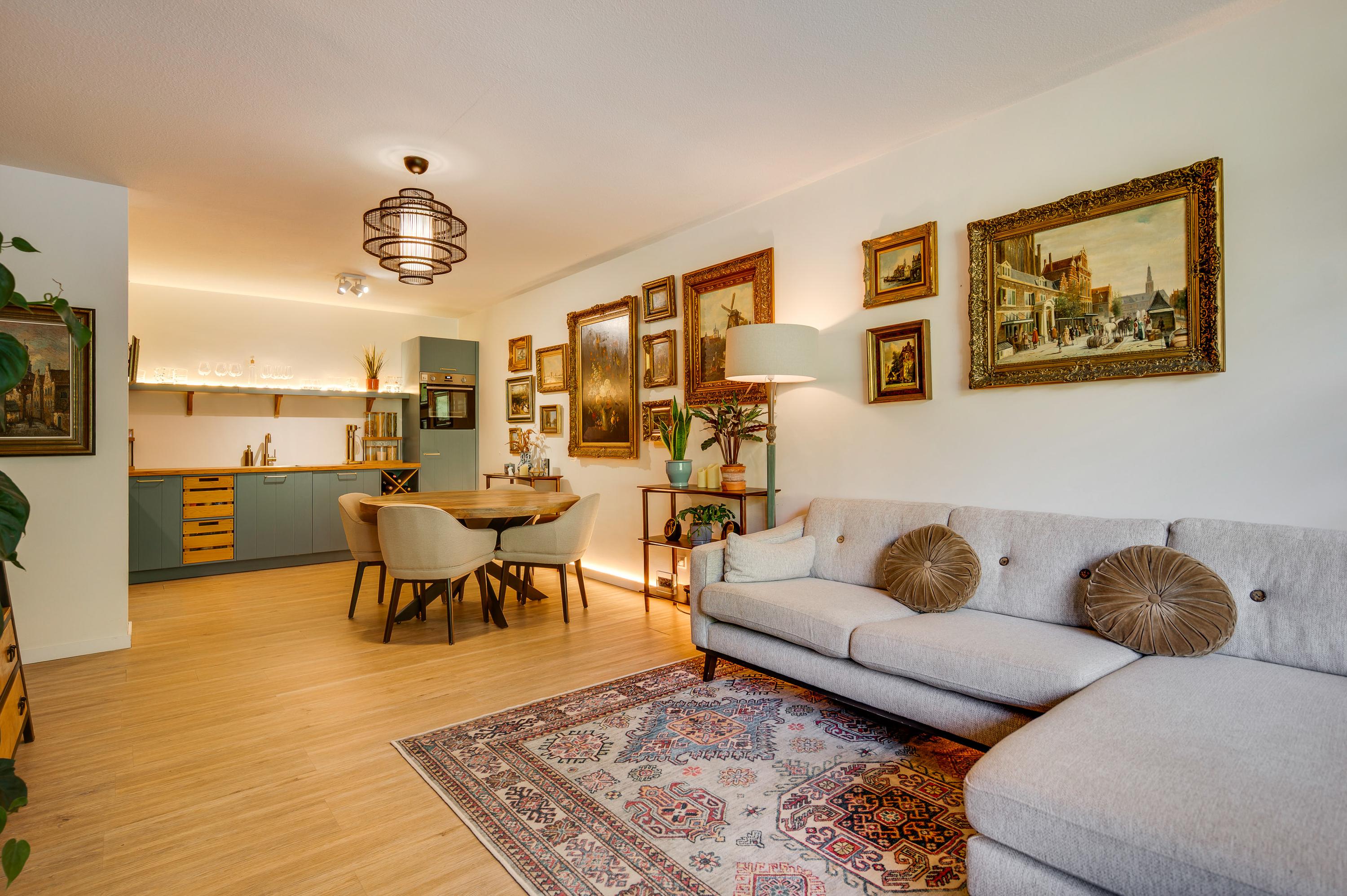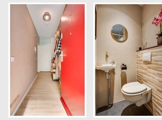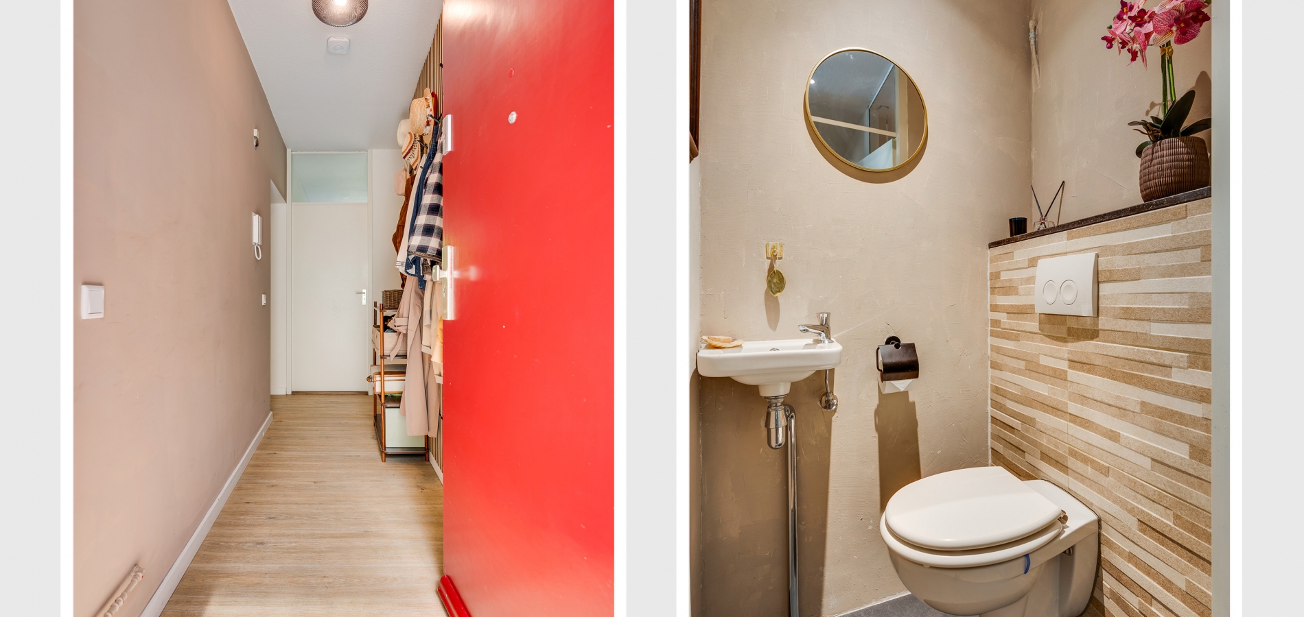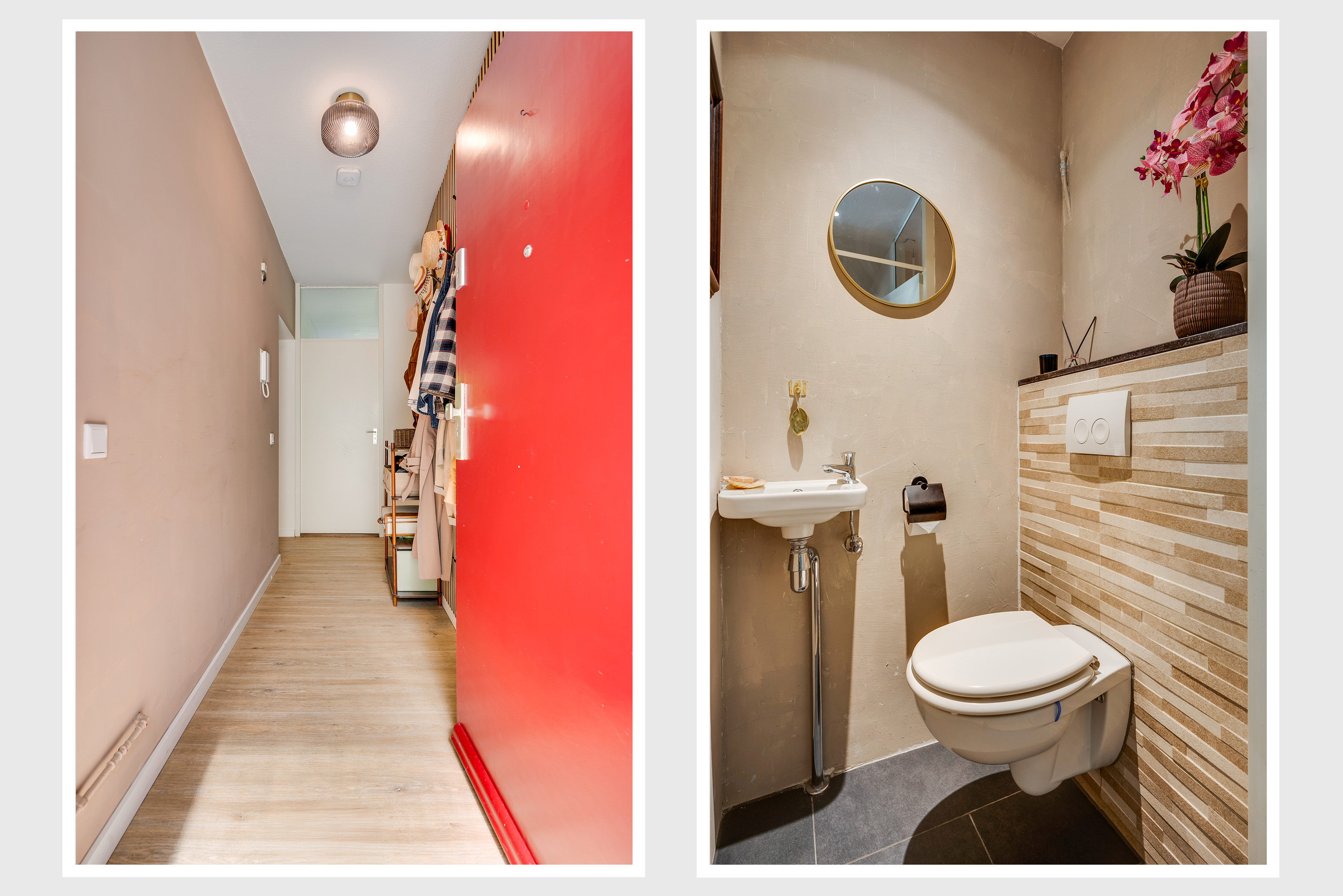 Via de gesloten, altijd droge galerij loopt u naar de voordeur van dit goed ingedeelde appartement. De ruime, L-vormige hal is smaakvol verbouwd, net als de rest van het appartement. Aan het einde van de hal is de fraaie toiletruimte, met een wandcloset en een fonteintje.