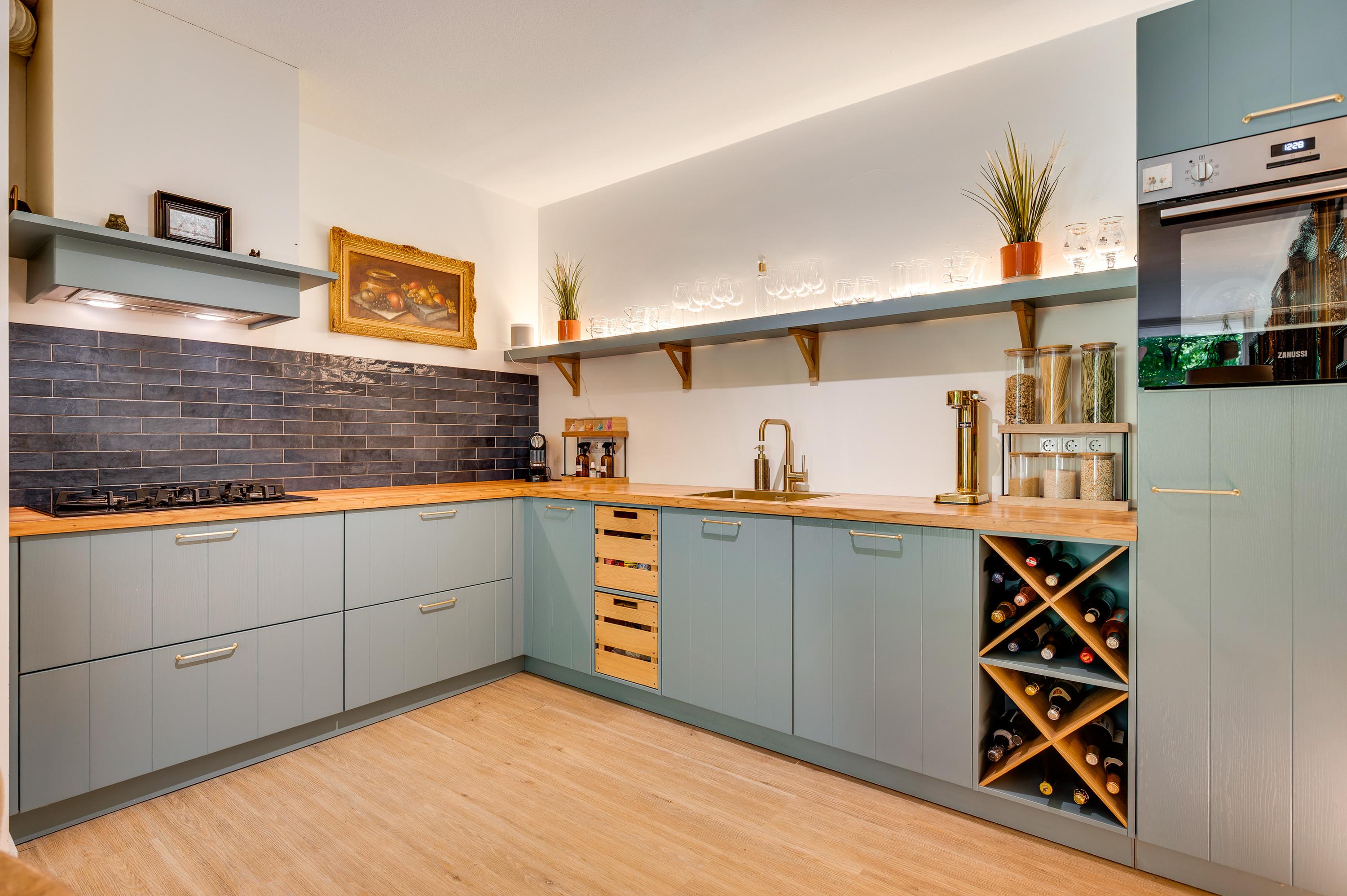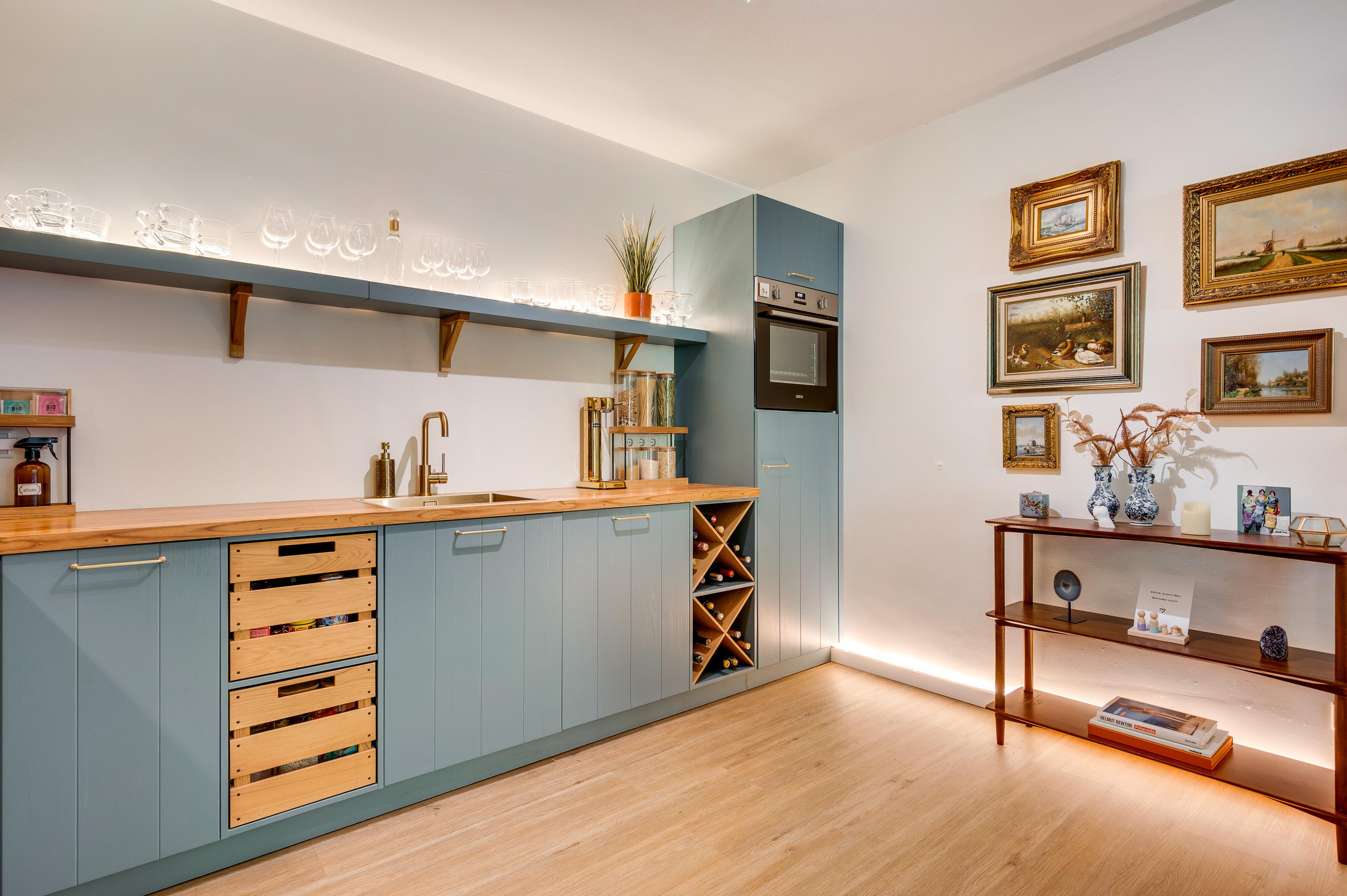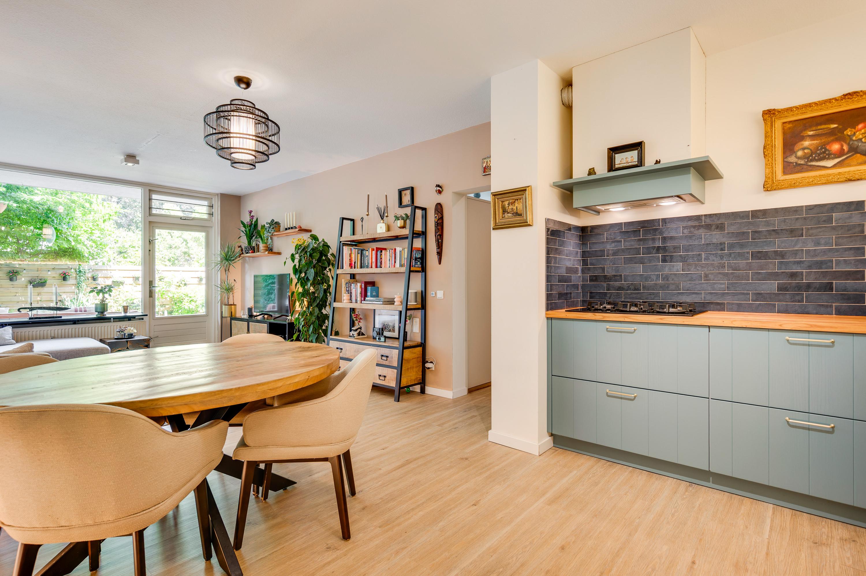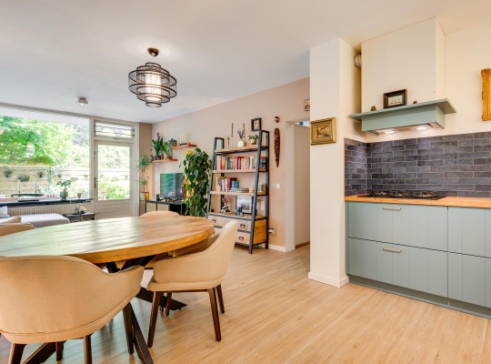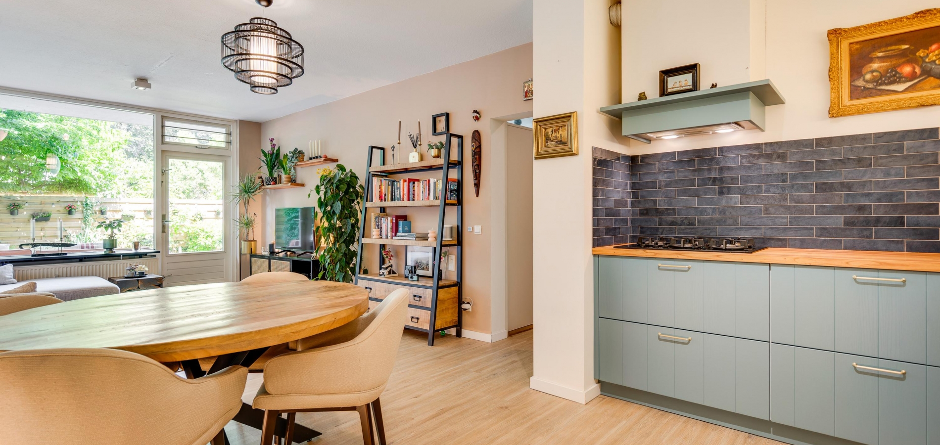 De woonkamer met open keuken is circa 8,13 x 3,70 meter, met mooi uitzicht naar en directe toegang tot de tuin. Het zitgedeelte heeft een ruime opzet en de eettafel staat vlak naast de keuken. De hoekopstelling, in een mooie blauwe kleur, is de perfecte plek voor de kook- en bakliefhebber. Alles klopt: van de wijnrekken tot de lange plank bij het spoelgedeelte. De afzuiging is in een mooie schouw gemaakt en verder zijn de gaskookplaat, vaatwasser, combi-oven en koelkast ingebouwd.