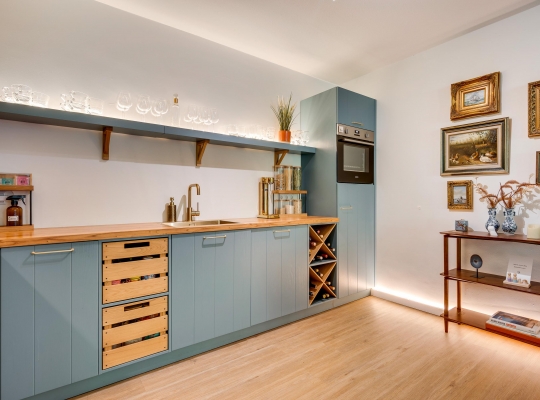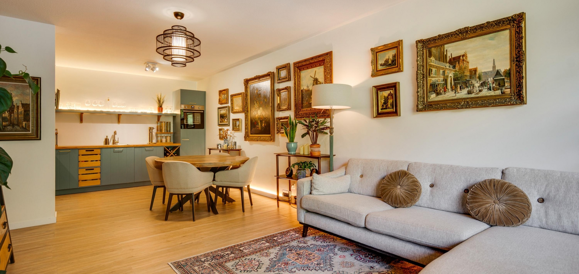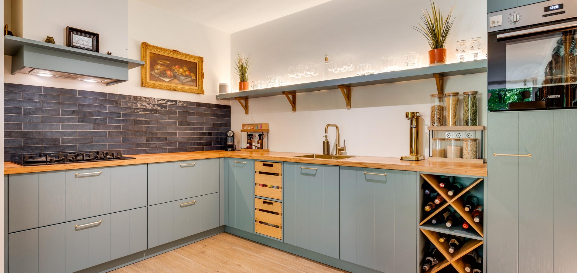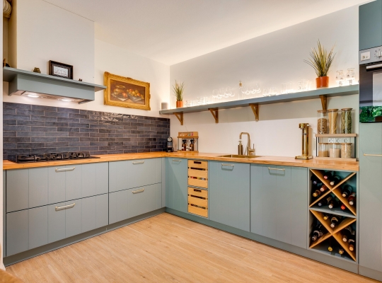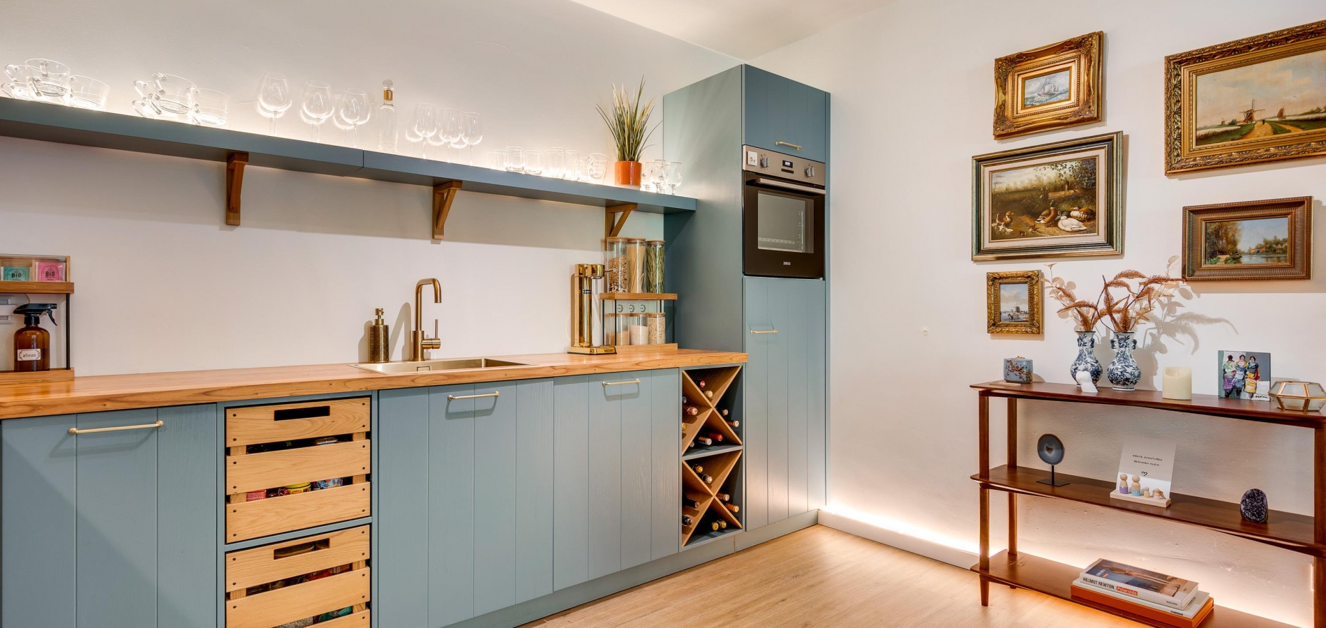 De woonkamer met open keuken is circa 8,13 x 3,70 meter, met mooi uitzicht naar en directe toegang tot de tuin. Het zitgedeelte heeft een ruime opzet en de eettafel staat vlak naast de keuken. De hoekopstelling, in een mooie blauwe kleur, is de perfecte plek voor de kook- en bakliefhebber. Alles klopt: van de wijnrekken tot de lange plank bij het spoelgedeelte. De afzuiging is in een mooie schouw gemaakt en verder zijn de gaskookplaat, vaatwasser, combi-oven en koelkast ingebouwd.