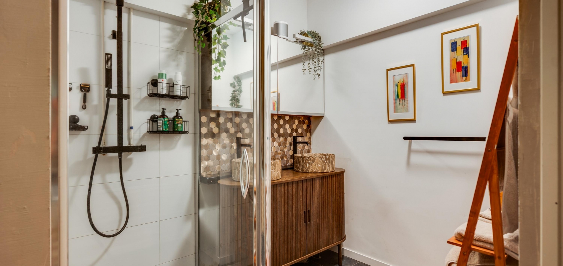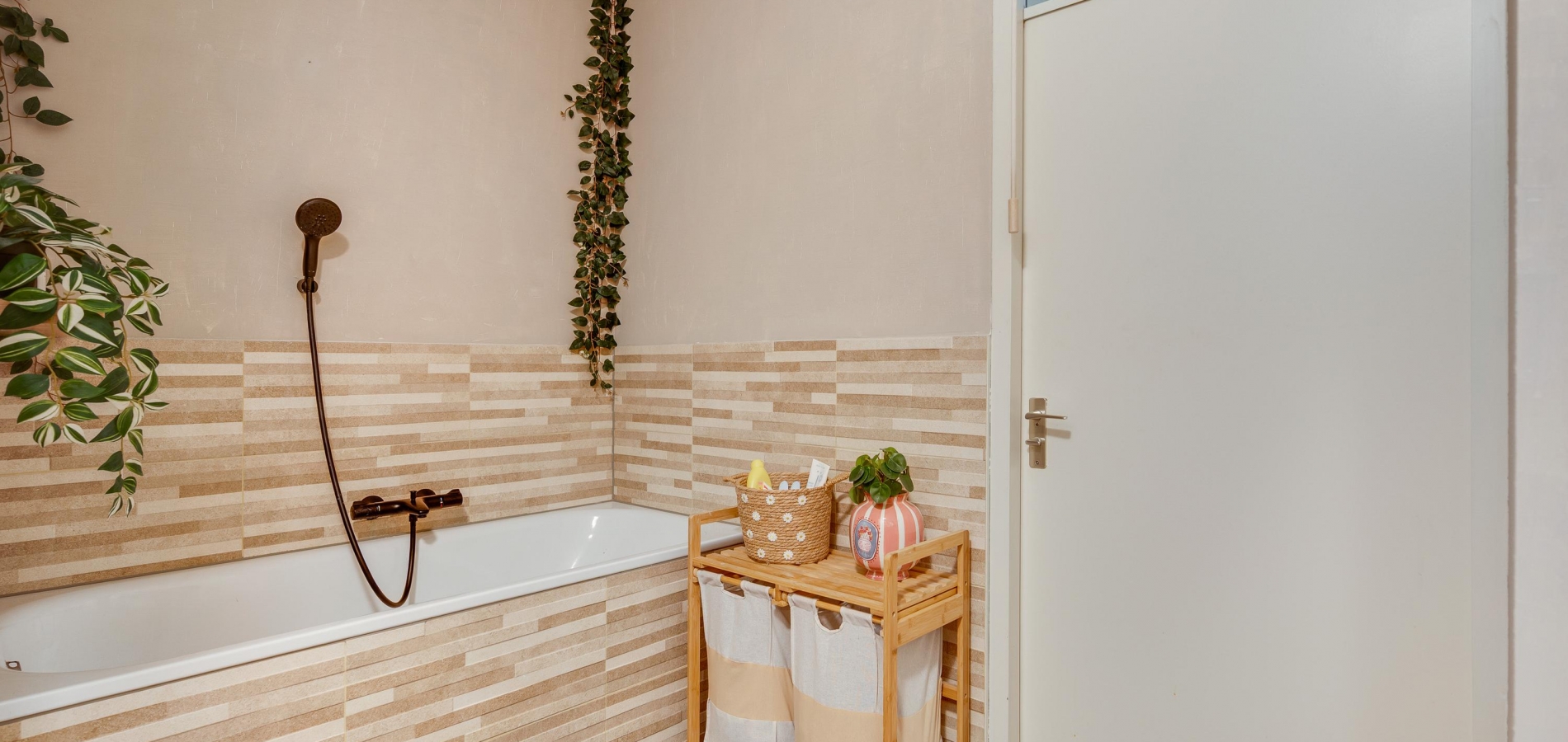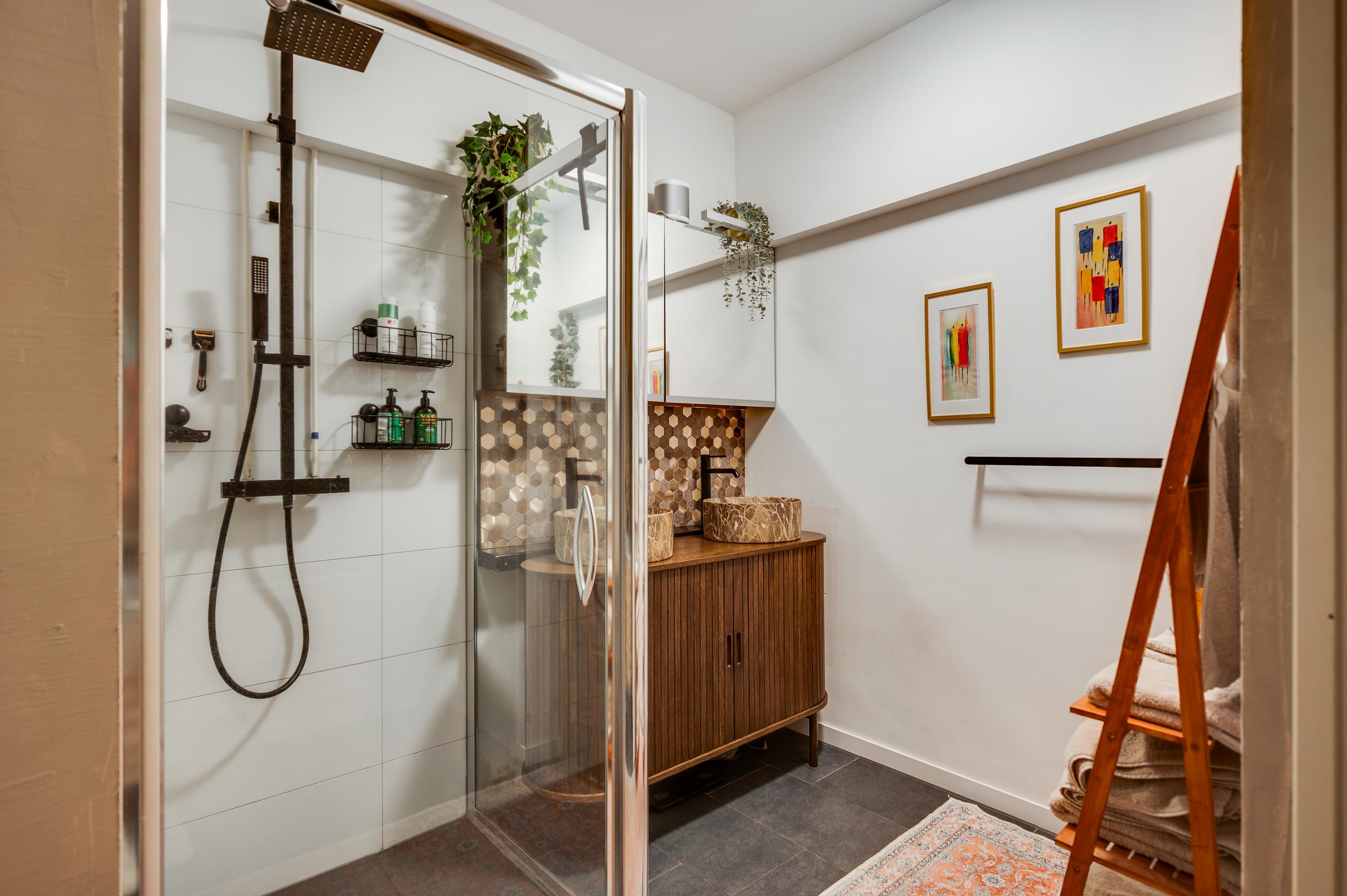Aan de overzijde van de hal is de badkamer (circa 3,34 x 2,67/2,10) die, net als de rest van het appartement, veel sfeer heeft. De ruimte is ingedeeld met een grote douche, een fraai meubel met twee wastafels, een tweedeurs spiegelkast en een ligbad.