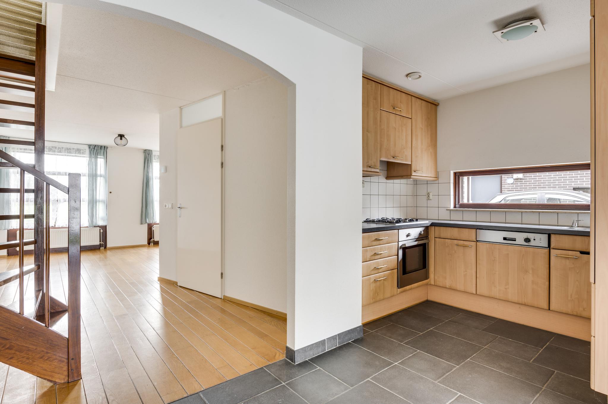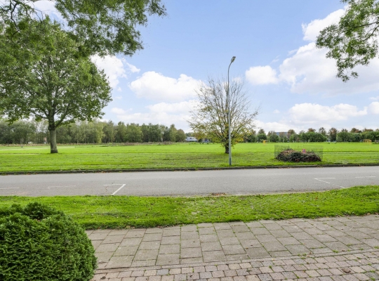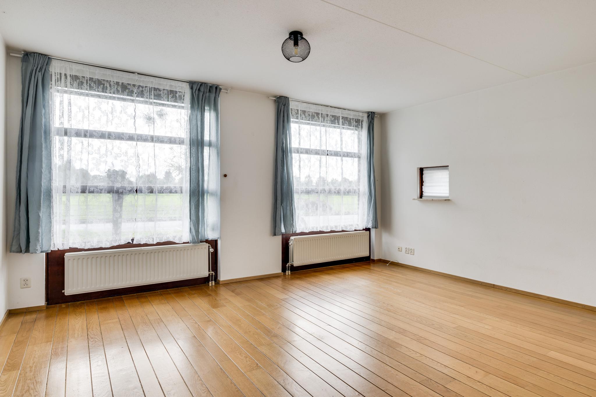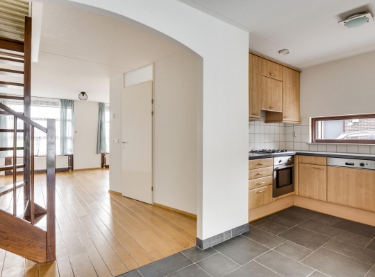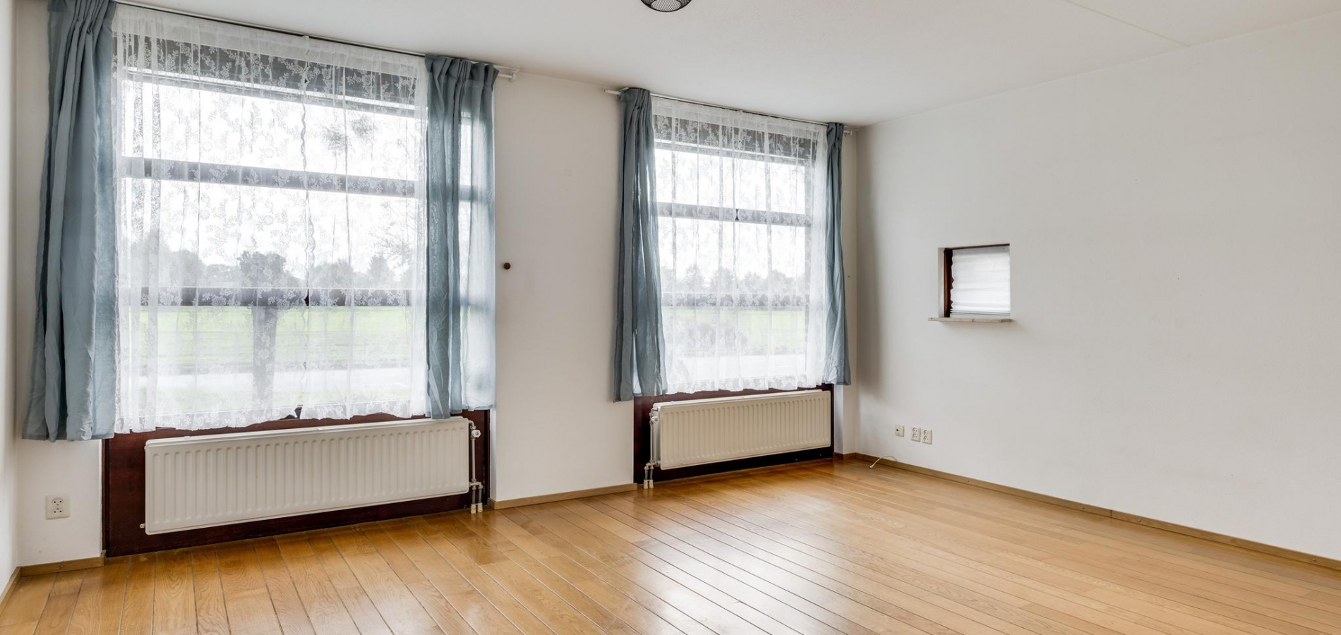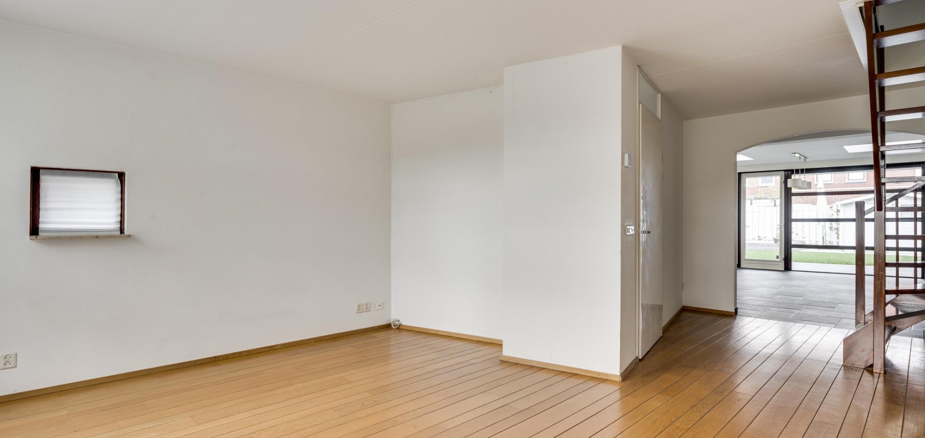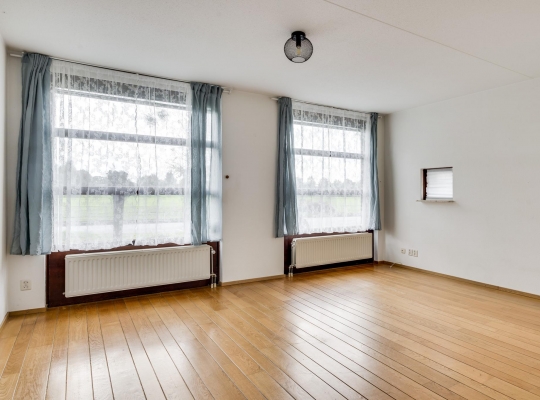 Niet alleen in de hal, maar ook in de woonkamer ligt een parketvloer. De L-vormige woonkamer (circa 26 m2) heeft een ruim zitgedeelte aan de voorzijde, met grote ramen aan de zuidkant en prachtig uitzicht naar het groen. In het andere stuk ziet u de open, hardhouten trapopgang en een brede doorgang naar de uitgebouwde keuken.