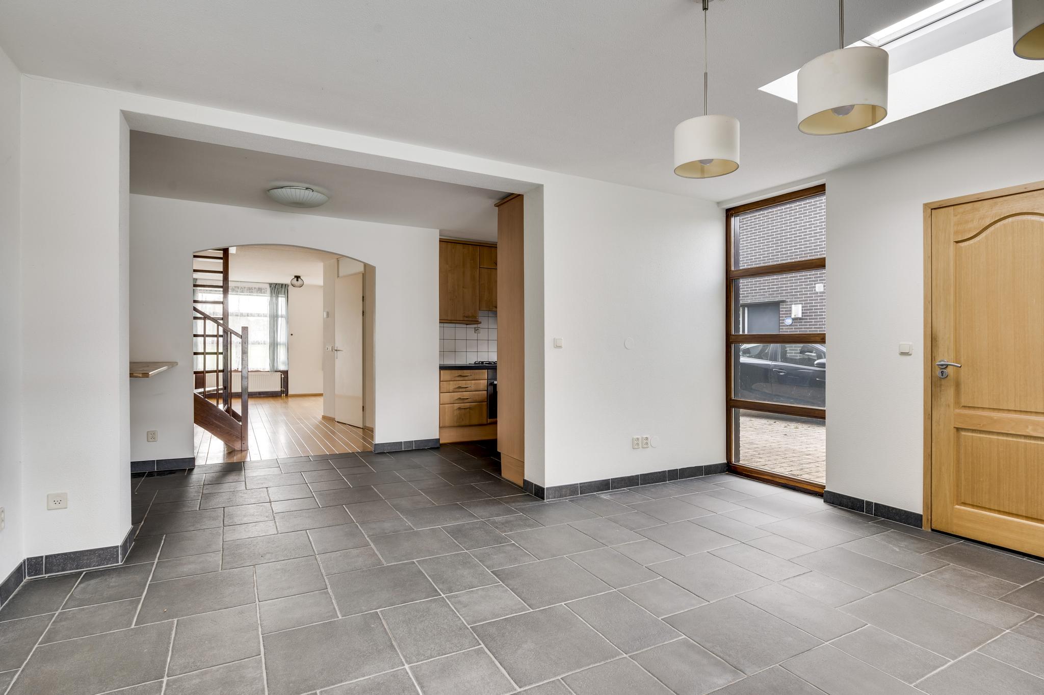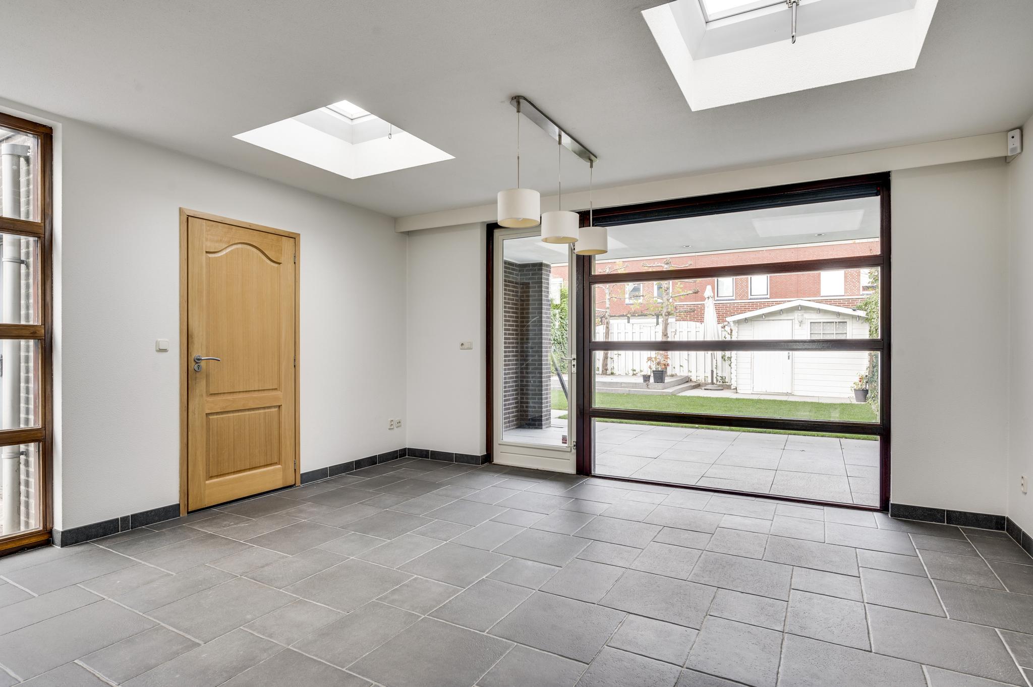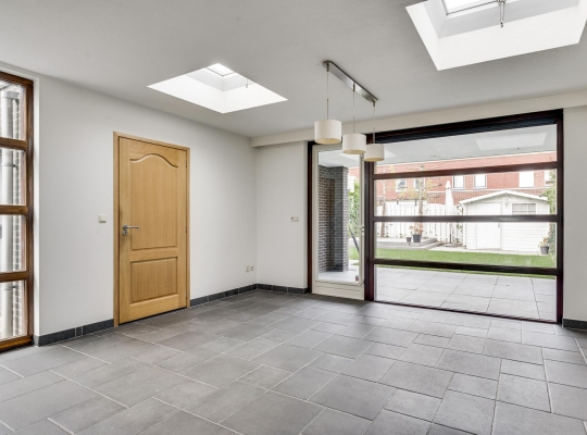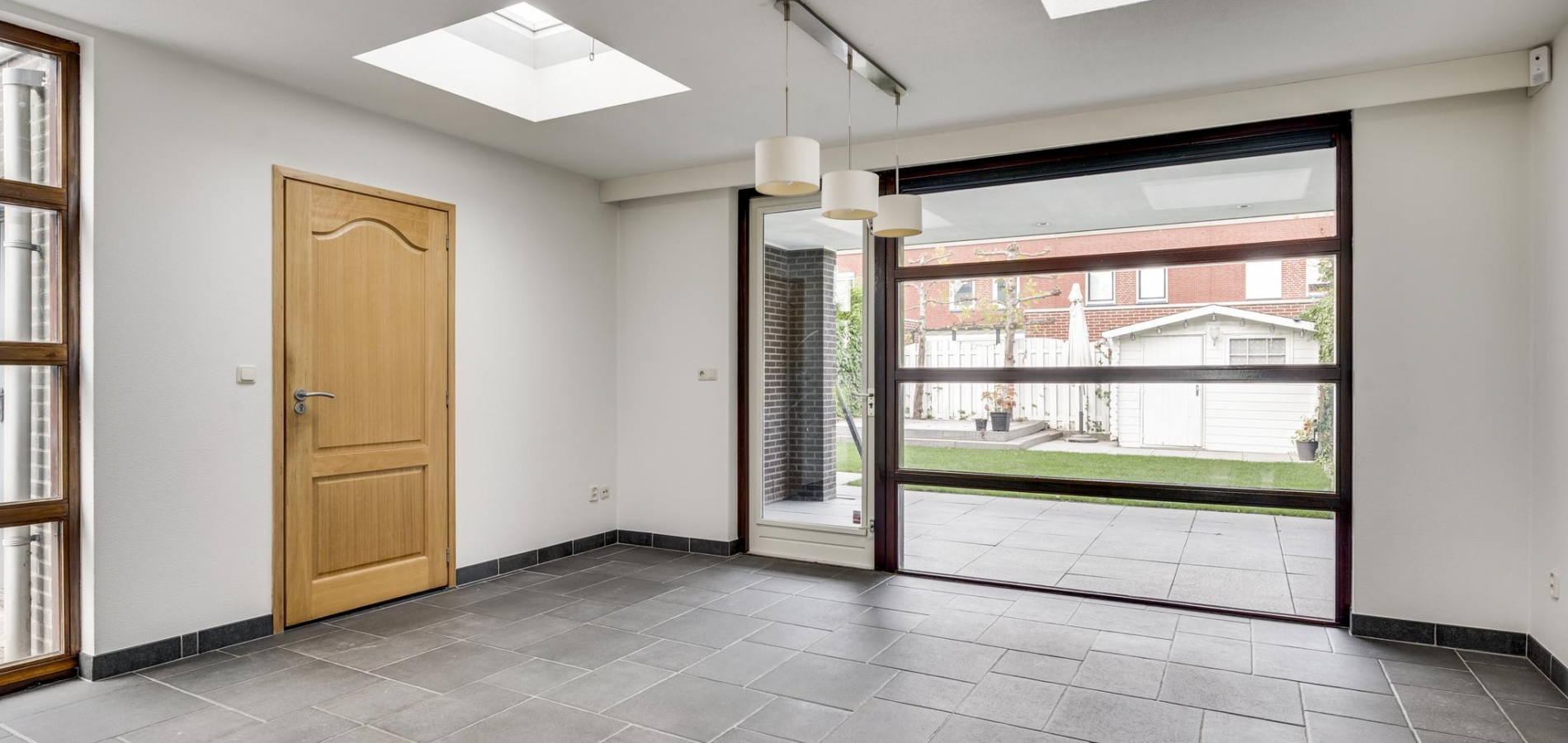 Bij het zitgedeelte ziet u een deur naar de garage (circa 5,68 x 3,09), voorzien van elektra. Komt u met de fiets thuis, dan zorgt de loopdeur ervoor dat niet de hele kantelpoort open hoeft. Ook is er een deur naar de achtertuin en op de vloer liggen plavuizen.