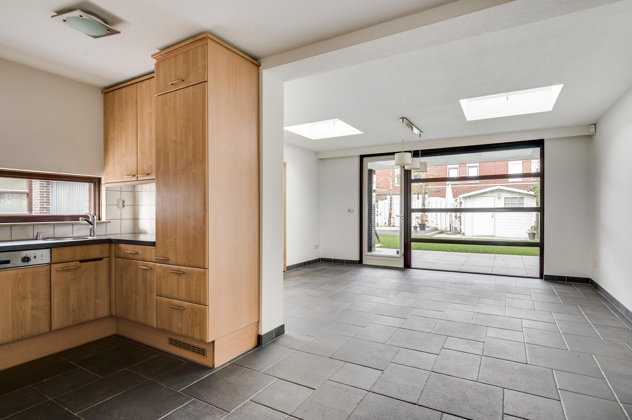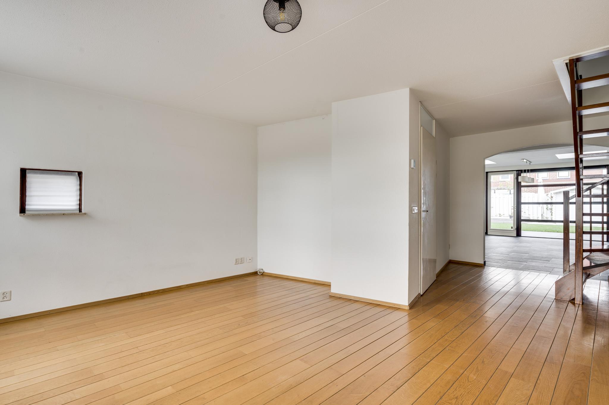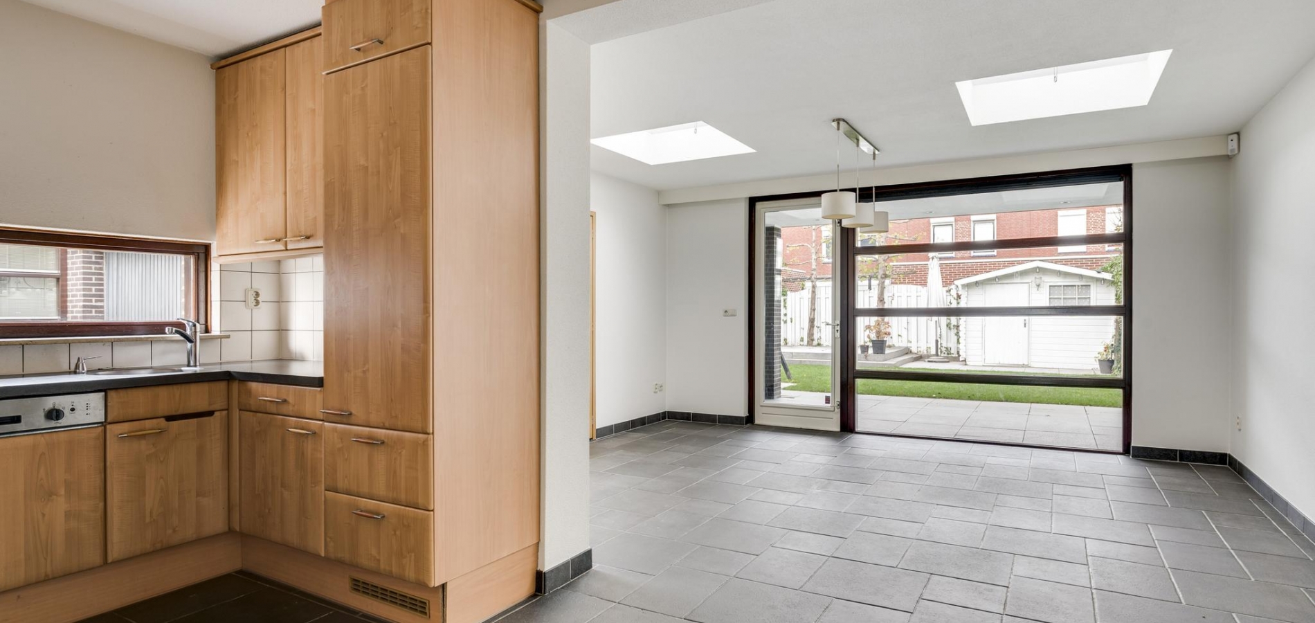Bij het zitgedeelte ziet u een deur naar de garage (circa 5,68 x 3,09), voorzien van elektra. Komt u met de fiets thuis, dan zorgt de loopdeur ervoor dat niet de hele kantelpoort open hoeft. Ook is er een deur naar de achtertuin en op de vloer liggen plavuizen.