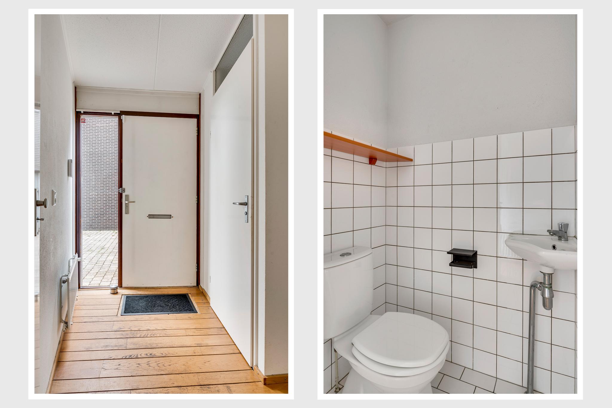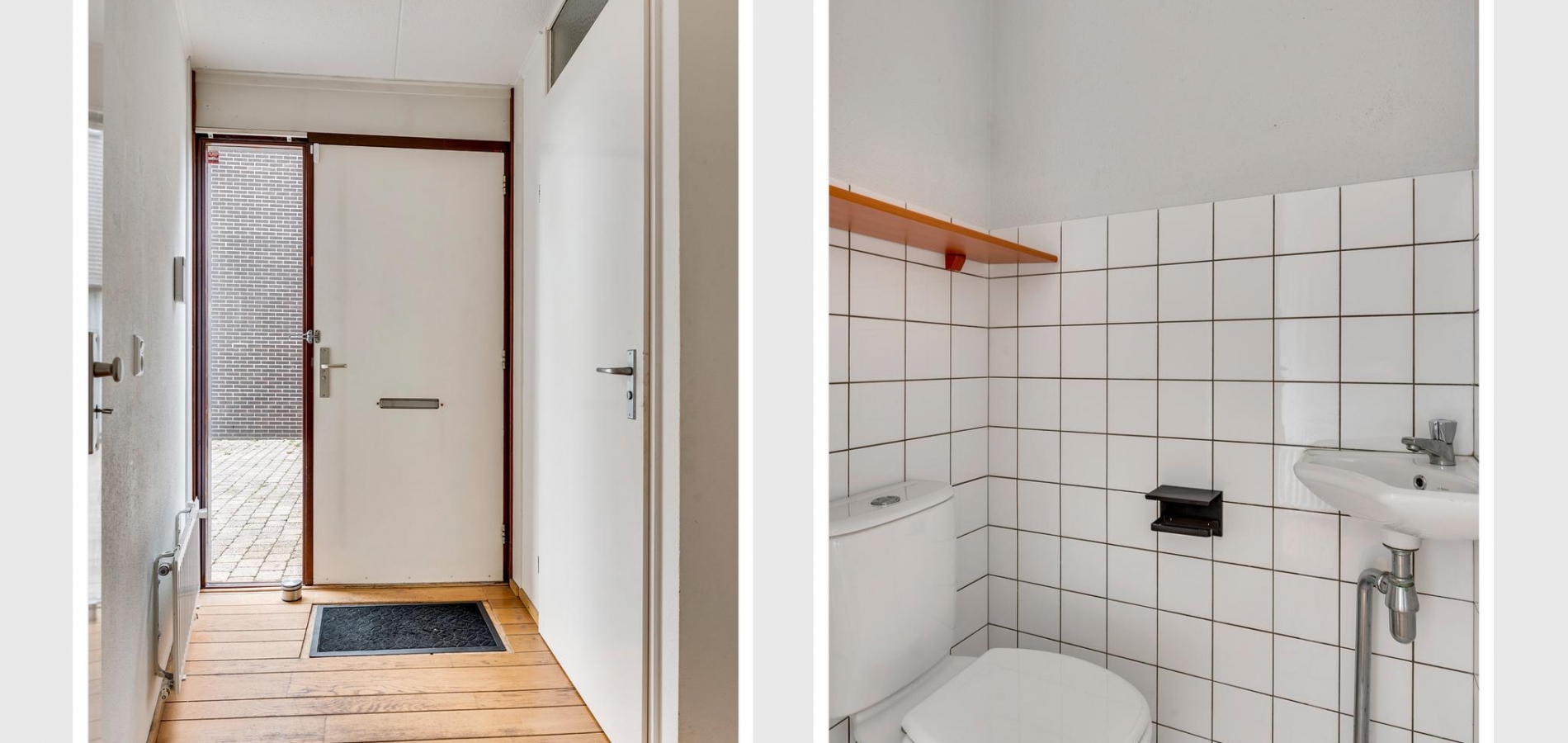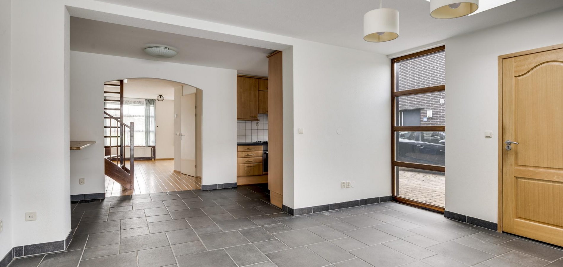 Halverwege de oprit, waar meerdere auto’s kunnen staan, is de entree van deze ruime woning. De L-vormige hal biedt toegang tot de meterkast, toiletruimte en de woonkamer. Rechts van de toiletruimte is een nis, die als garderobe in gebruik is.