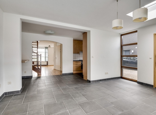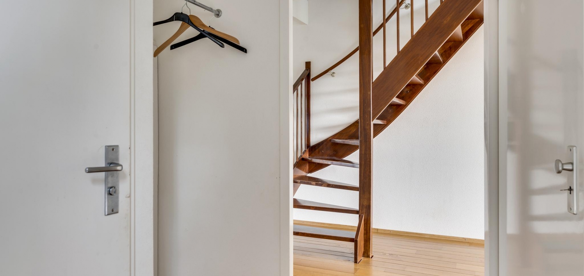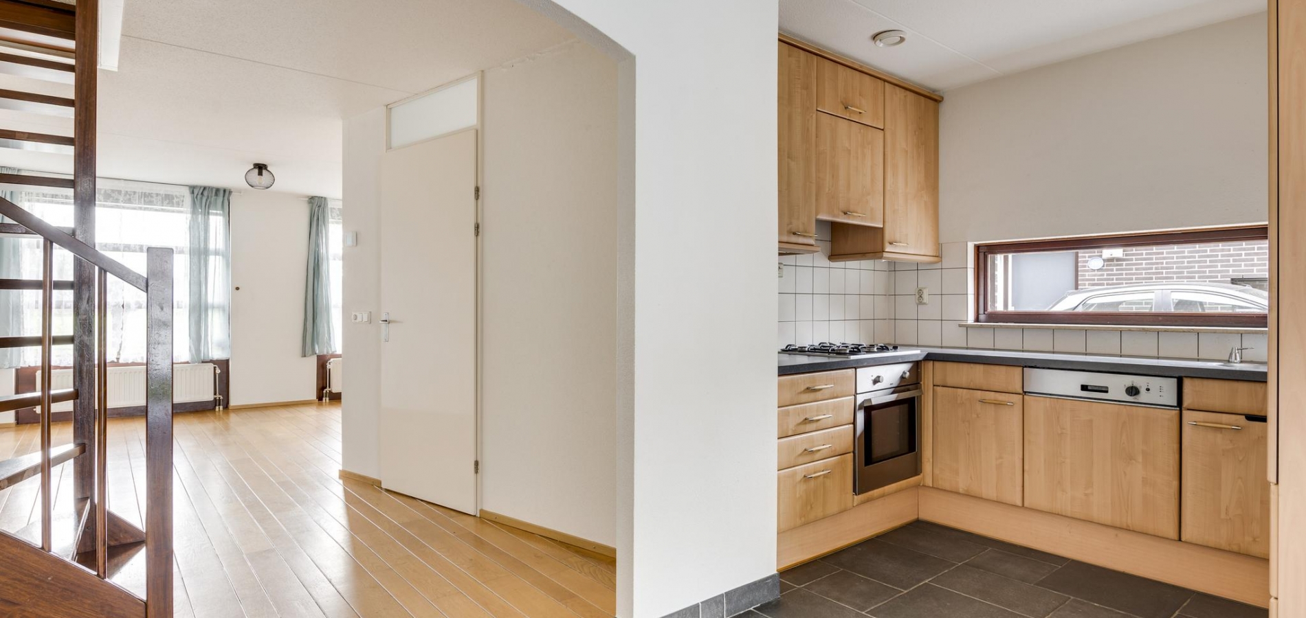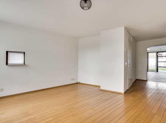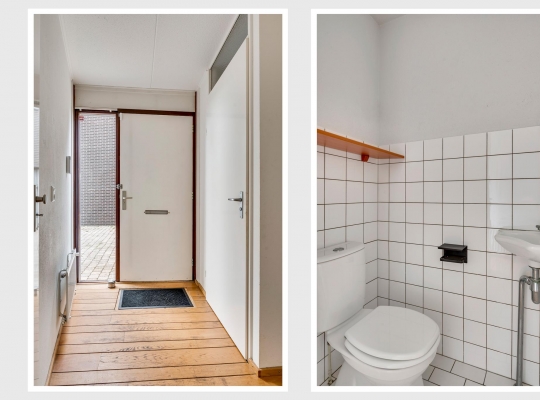 Halverwege de oprit, waar meerdere auto’s kunnen staan, is de entree van deze ruime woning. De L-vormige hal biedt toegang tot de meterkast, toiletruimte en de woonkamer. Rechts van de toiletruimte is een nis, die als garderobe in gebruik is.