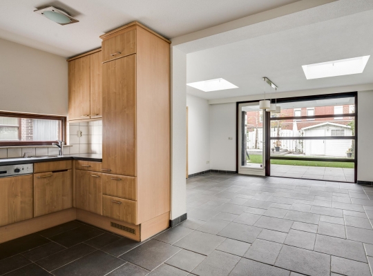 De keuken en aansluitende eetkamer vormen zijn in totaal circa 29 m2 groot, wat de benaming woonkeuken gerechtvaardigd maakt. Onder de antracietkleurige tegels ligt vloerwarming en twee lichtkoepels bij het eetgedeelte zorgen, samen met het raam tot vloerhoogte, voor veel lichtinval. In de keuken staat een U-opstelling met een gasfornuis, afzuigkap, vaatwasser, koelkast en een oven.