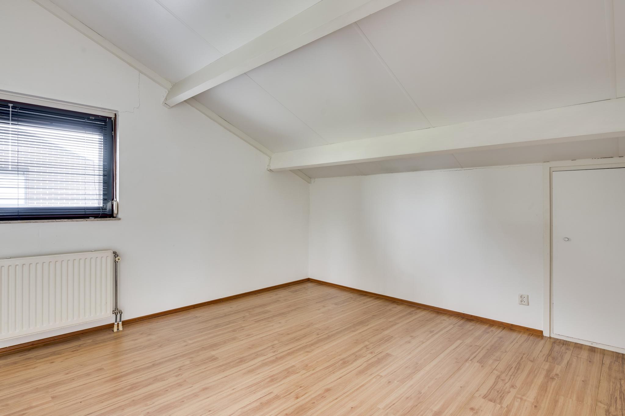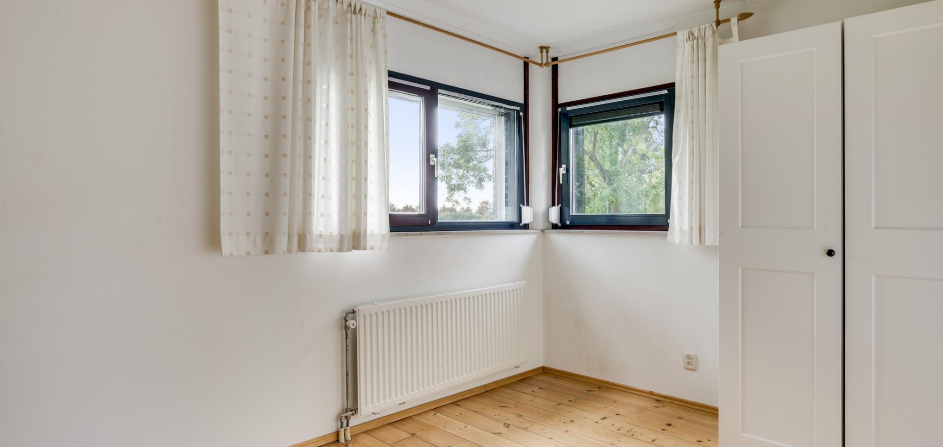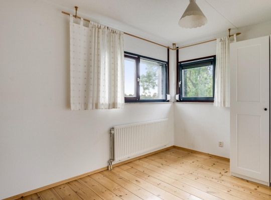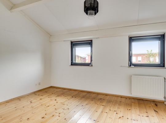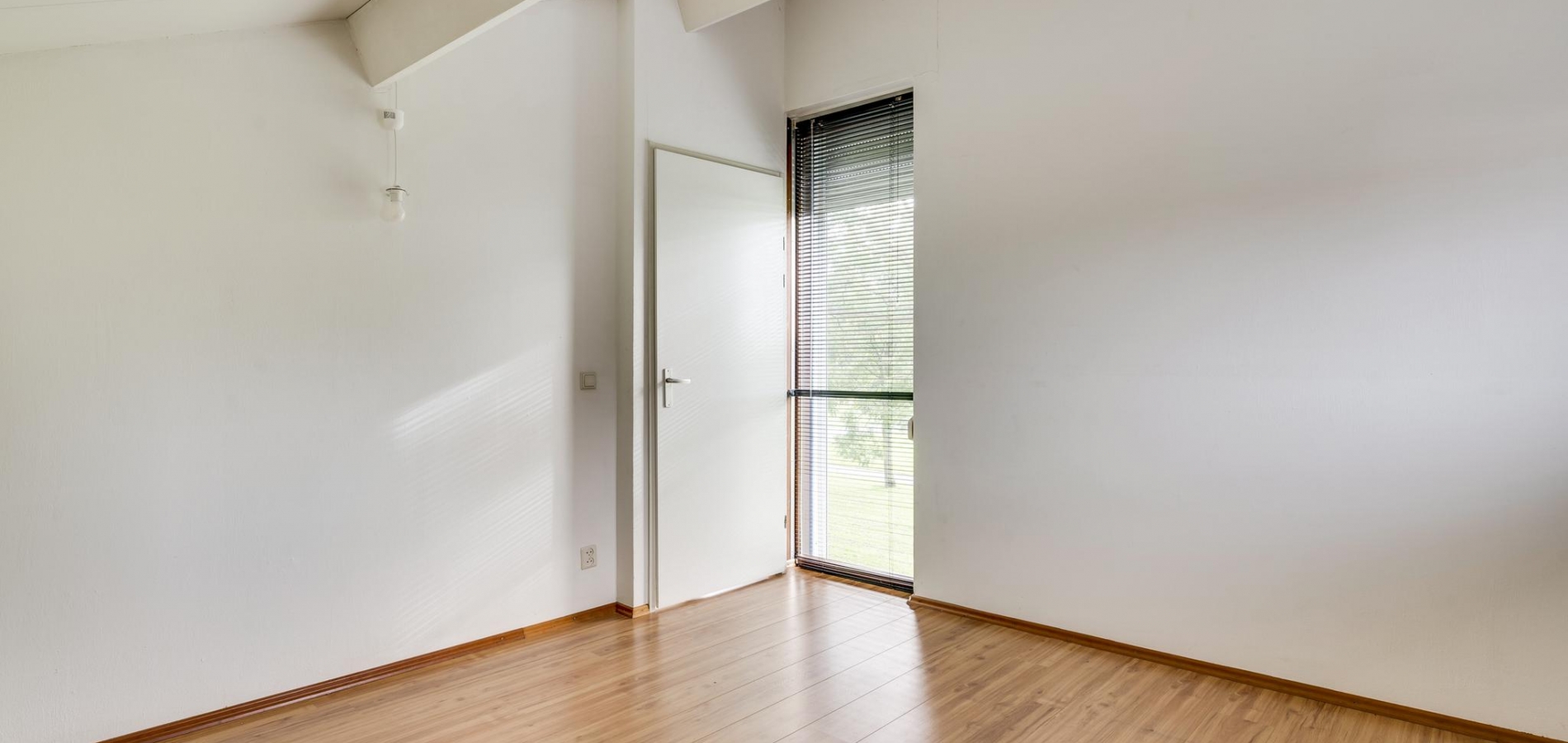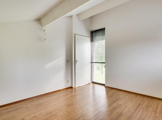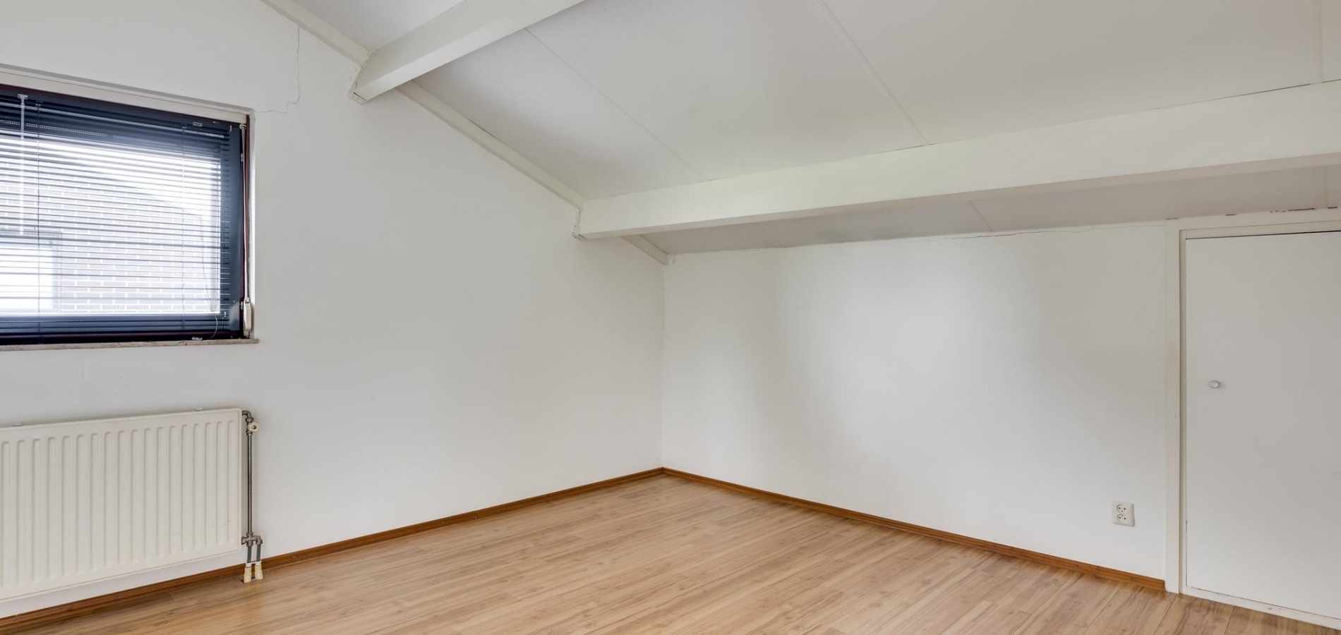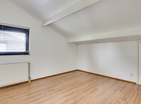 Een vaste trap geeft toegang tot een portaal, met aansluitend slaapkamer III (circa 4,19 x 3,85). Ook in deze kamer ligt een houten vloer en het schuine plafond met hoge nok versterkt het gevoel van ruimte. Als dit een kinderkamer wordt, dan is de hoogte perfect voor een hoogslaper. In het schuine dakvlak is een praktische berging van ruim 1.40 meter diep.
