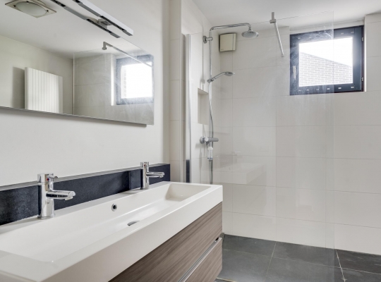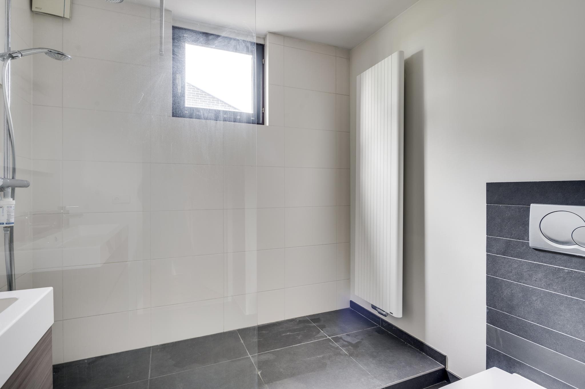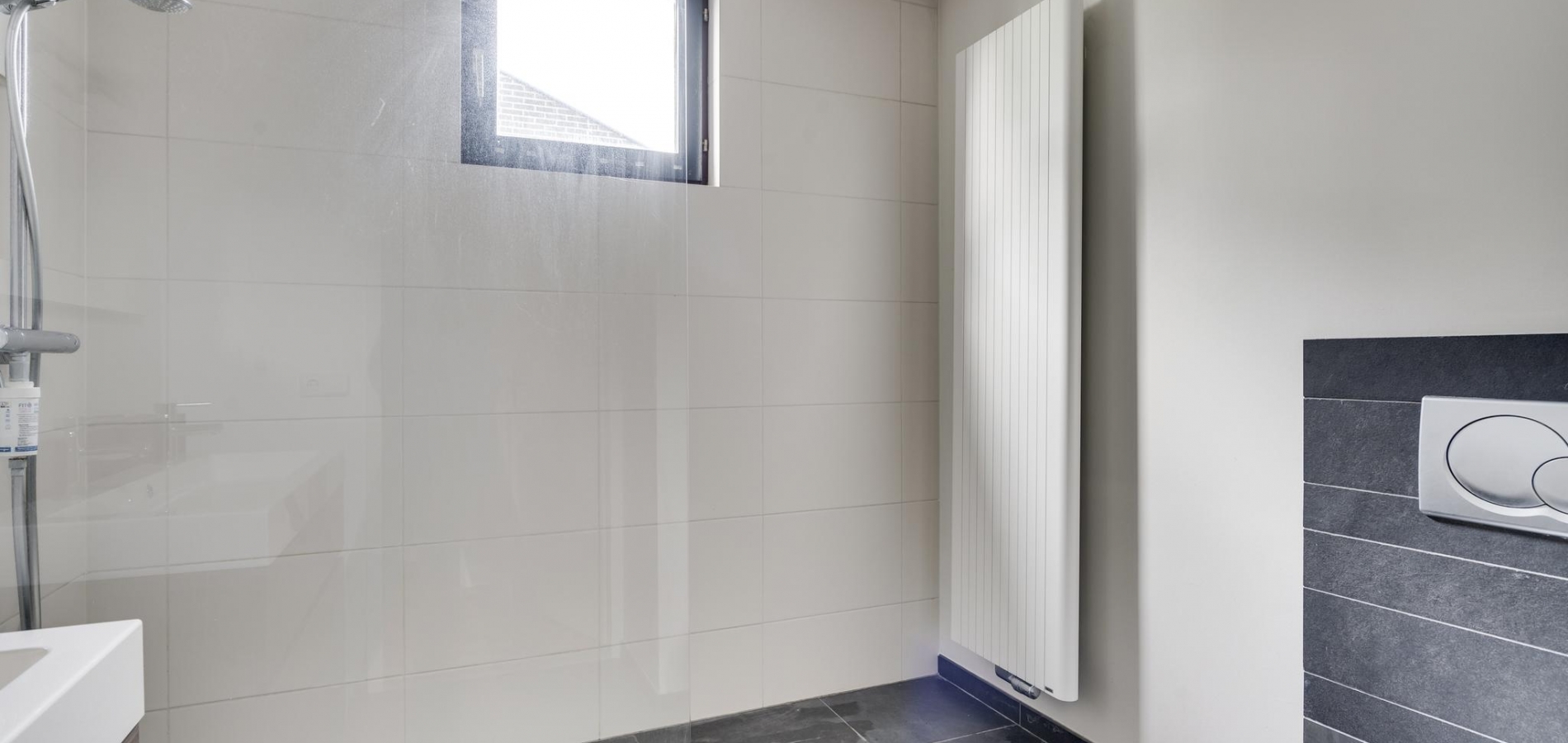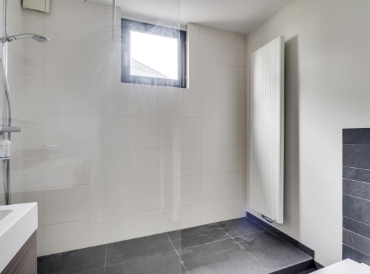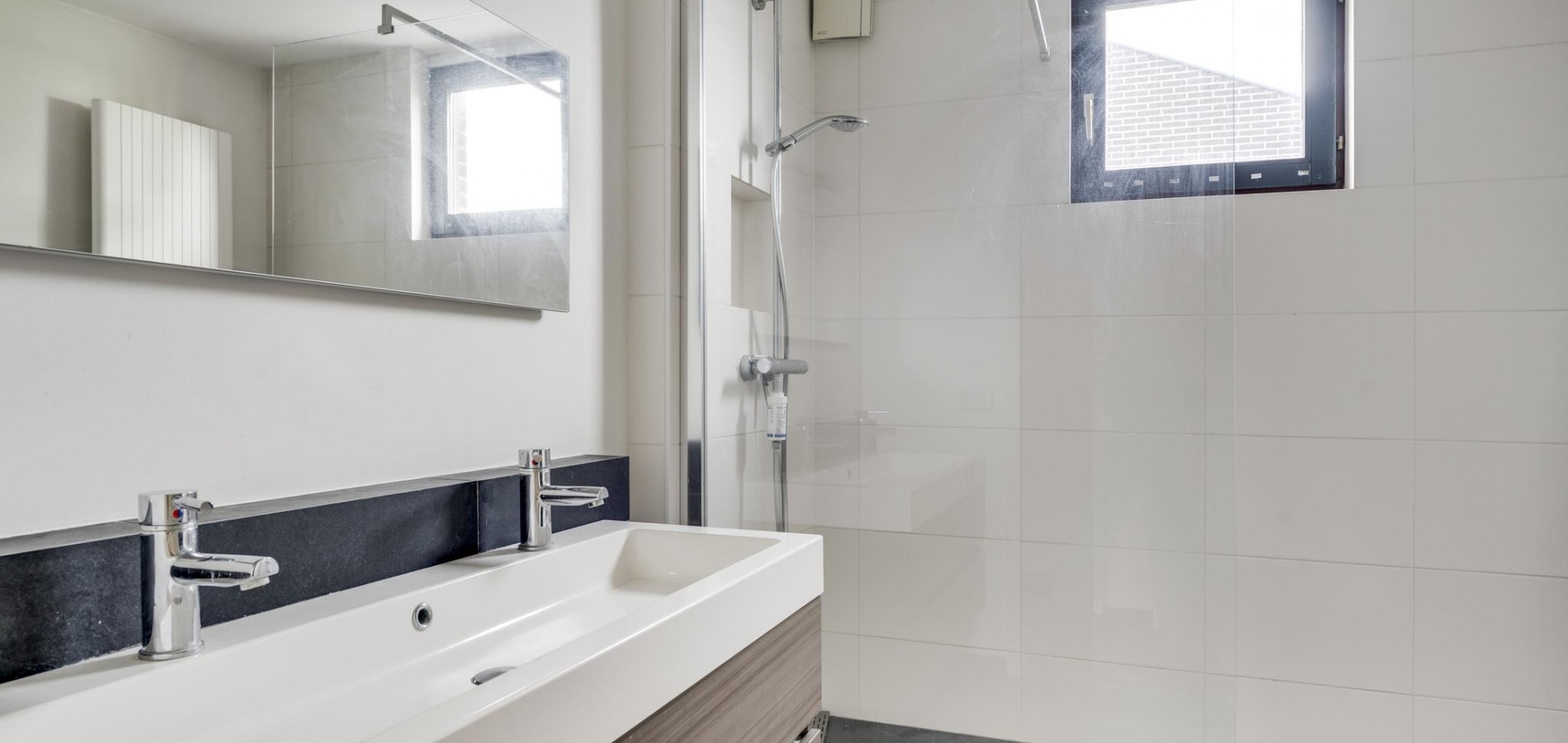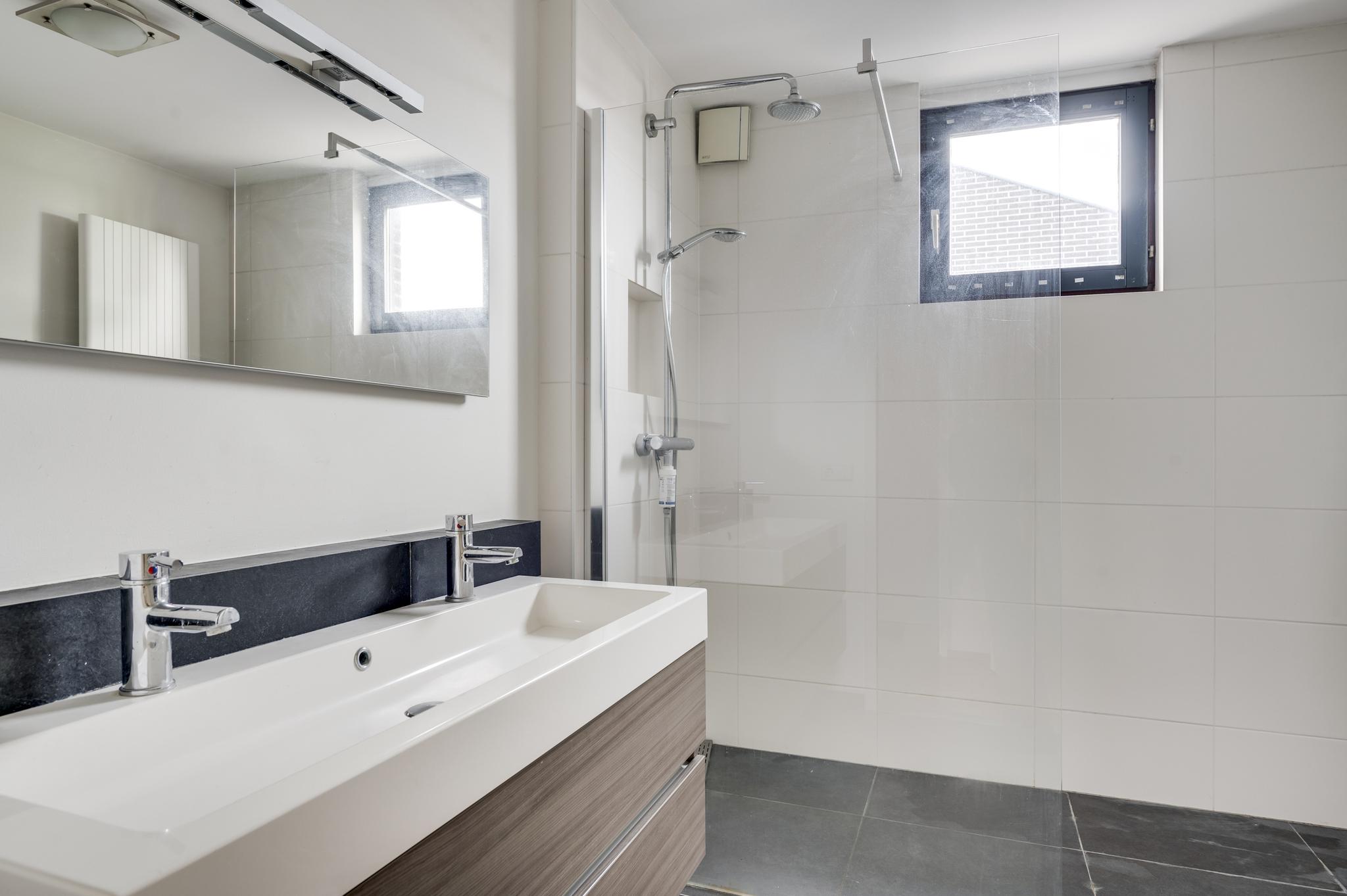 De moderne badkamer (circa 2,42 x 2,20) met zijraam is ingedeeld met een grote inloopdouche, dubbel wastafelmeubel, een brede spiegel met verlichting, een designradiator en een wandcloset.