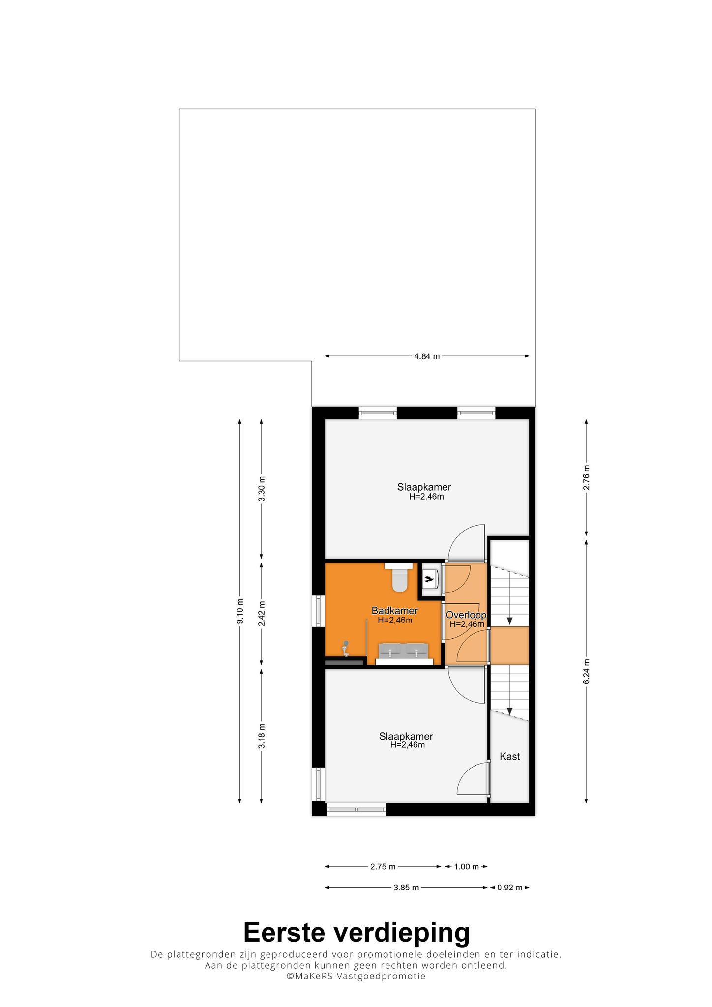 Op de eerste verdieping zijn twee slaapkamers en de badkamer. Slaapkamer I (circa 3,85 x 3,18) bevindt zich aan de voorzijde, met prachtig uitzicht naar het groen. Aan de achterzijde is slaapkamer II (circa 4,84 x 3,30/2,71) waar, net als op bijna de hele verdieping, een houten vloer ligt.