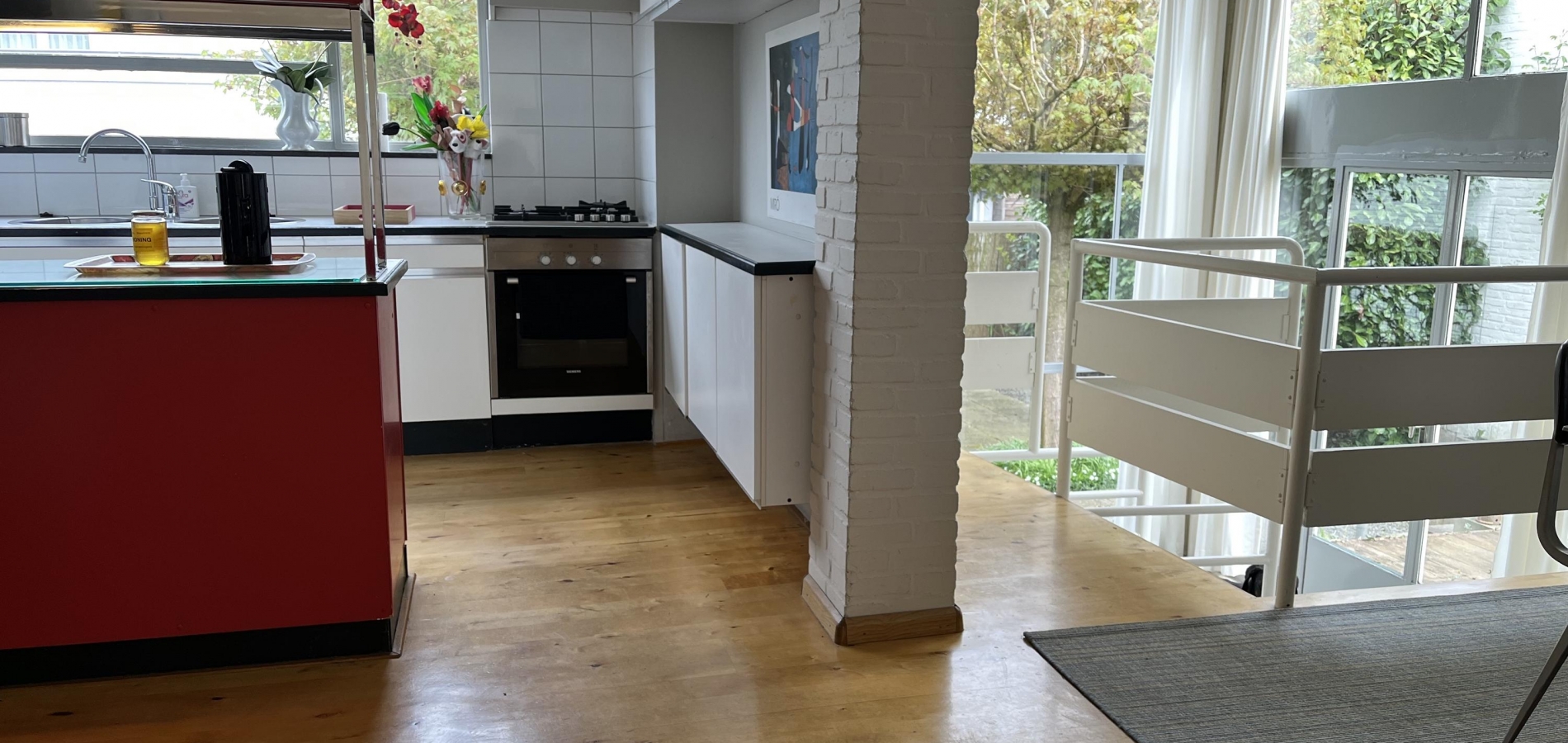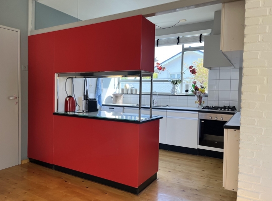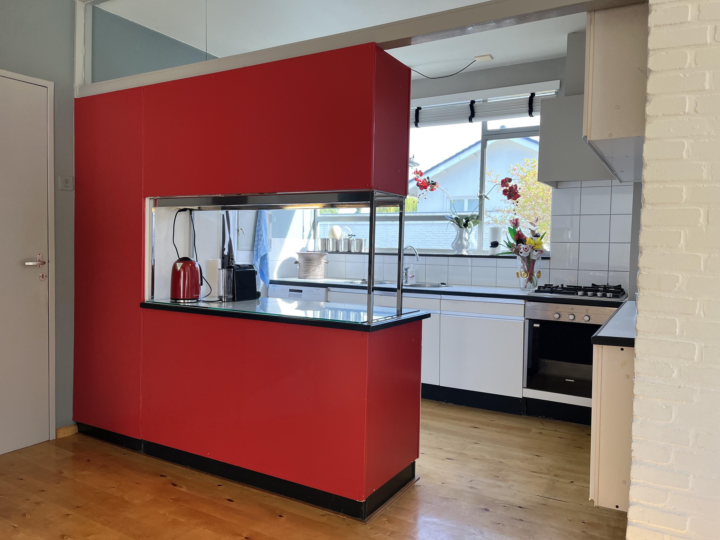 De keuken is voorzien van een grote raampartij en biedt een fijn zicht op de achtertuin en op de straat. De keukeninrichting is overwegend authentiek.