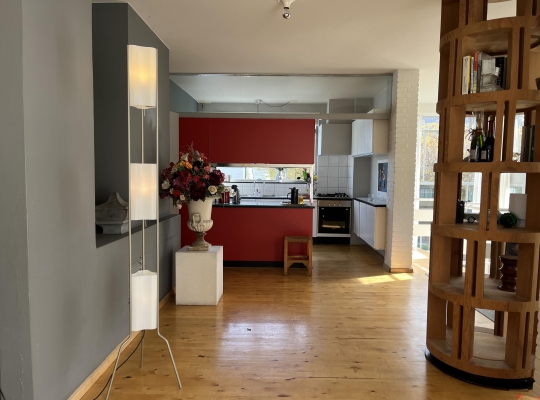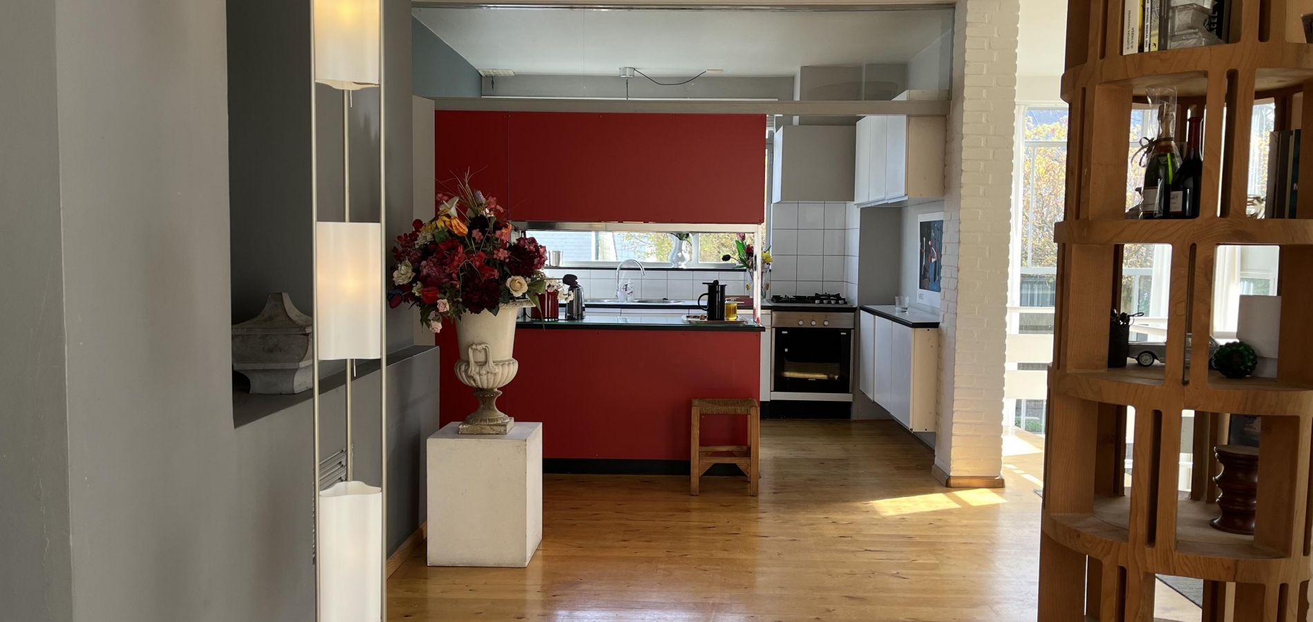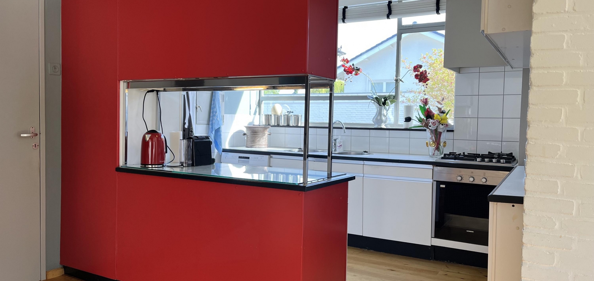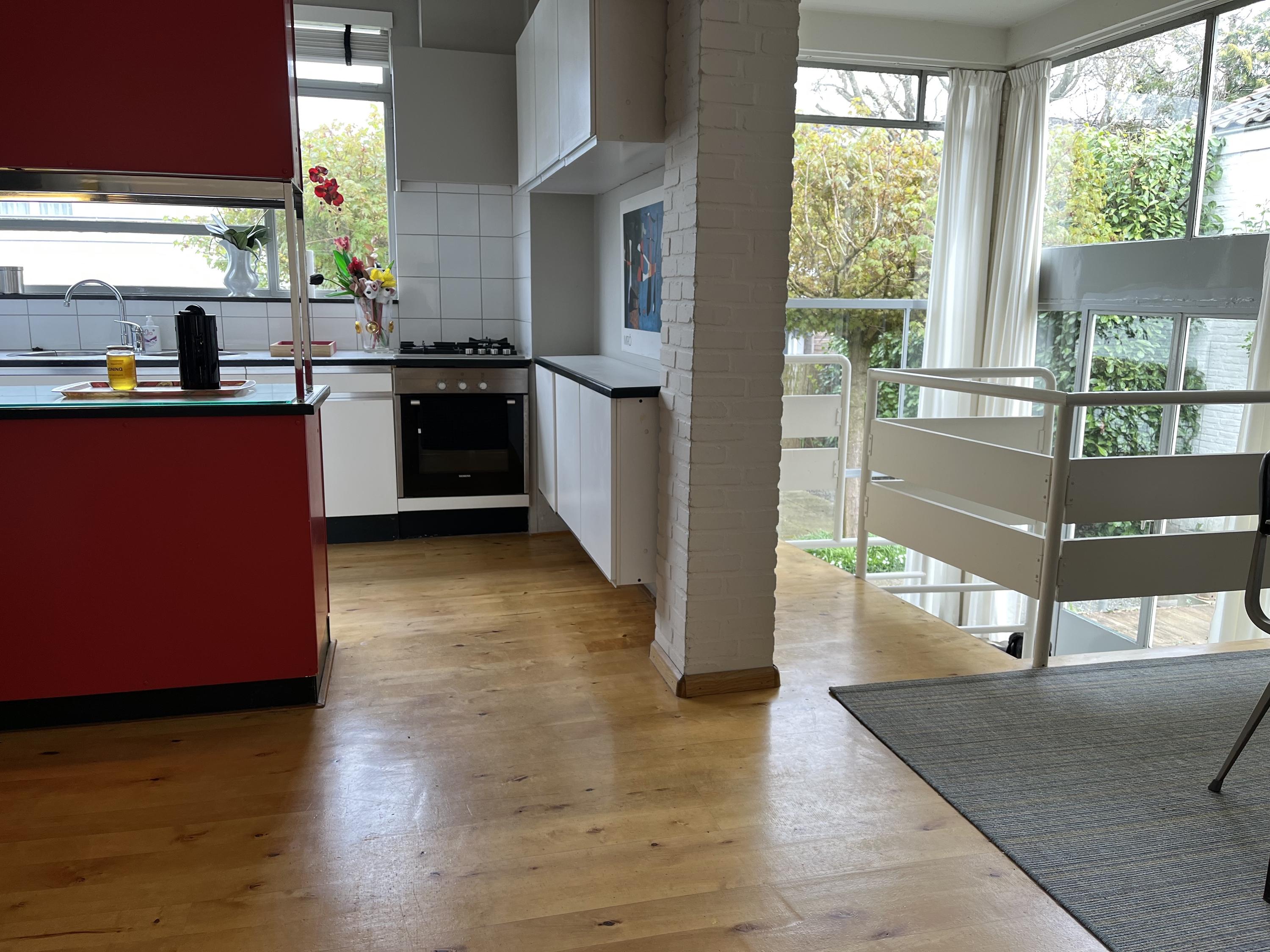De keuken is voorzien van een grote raampartij en biedt een fijn zicht op de achtertuin en op de straat. De keukeninrichting is overwegend authentiek.
