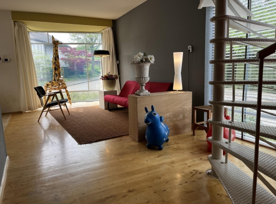 De speels ingedeelde woonkamer van ca. 60m2 is voorzien van een houten parketvloer. Opvallend zijn de ruime monumentale stalen spiltrap, de grote ramen en de erker met een vrij zicht op het Fort Sint Pieter in de verte. De zichten vanuit de woonkamer op de tuin rondom het huis versterken het buitenleven in deze prachtige wijk. Vanuit de woonkamer heeft u via openslaande deuren toegang tot twee terrassen die zich op verschillende niveaus aan de zonzijde op het zuiden bevinden.