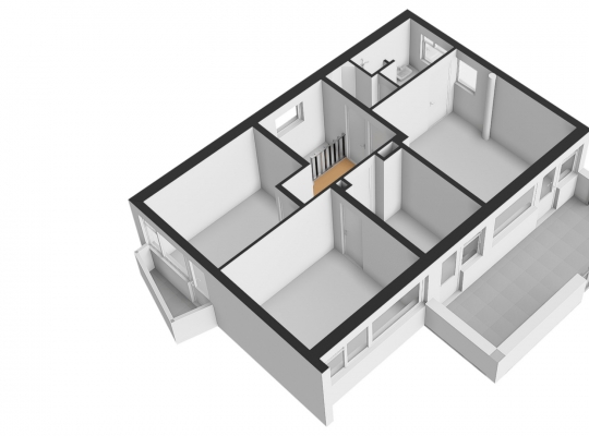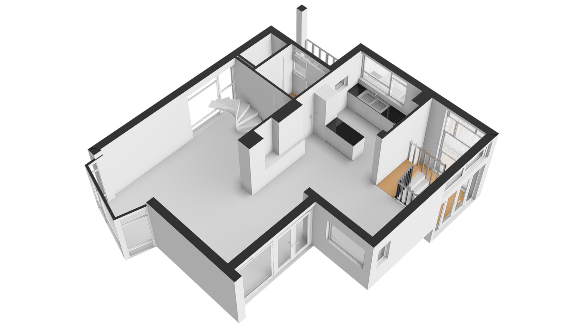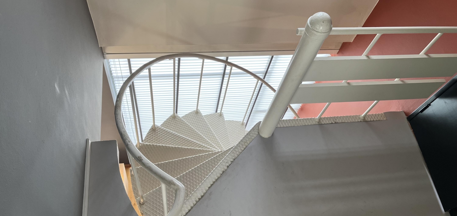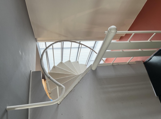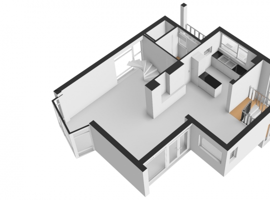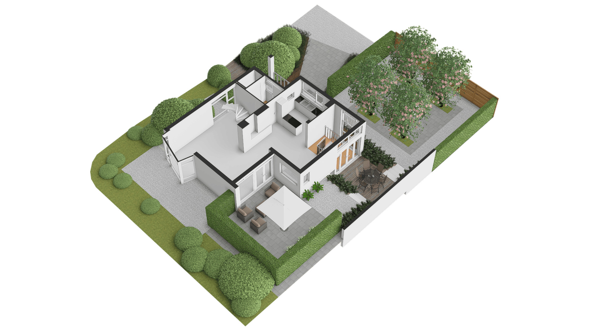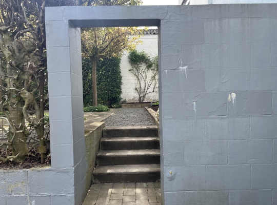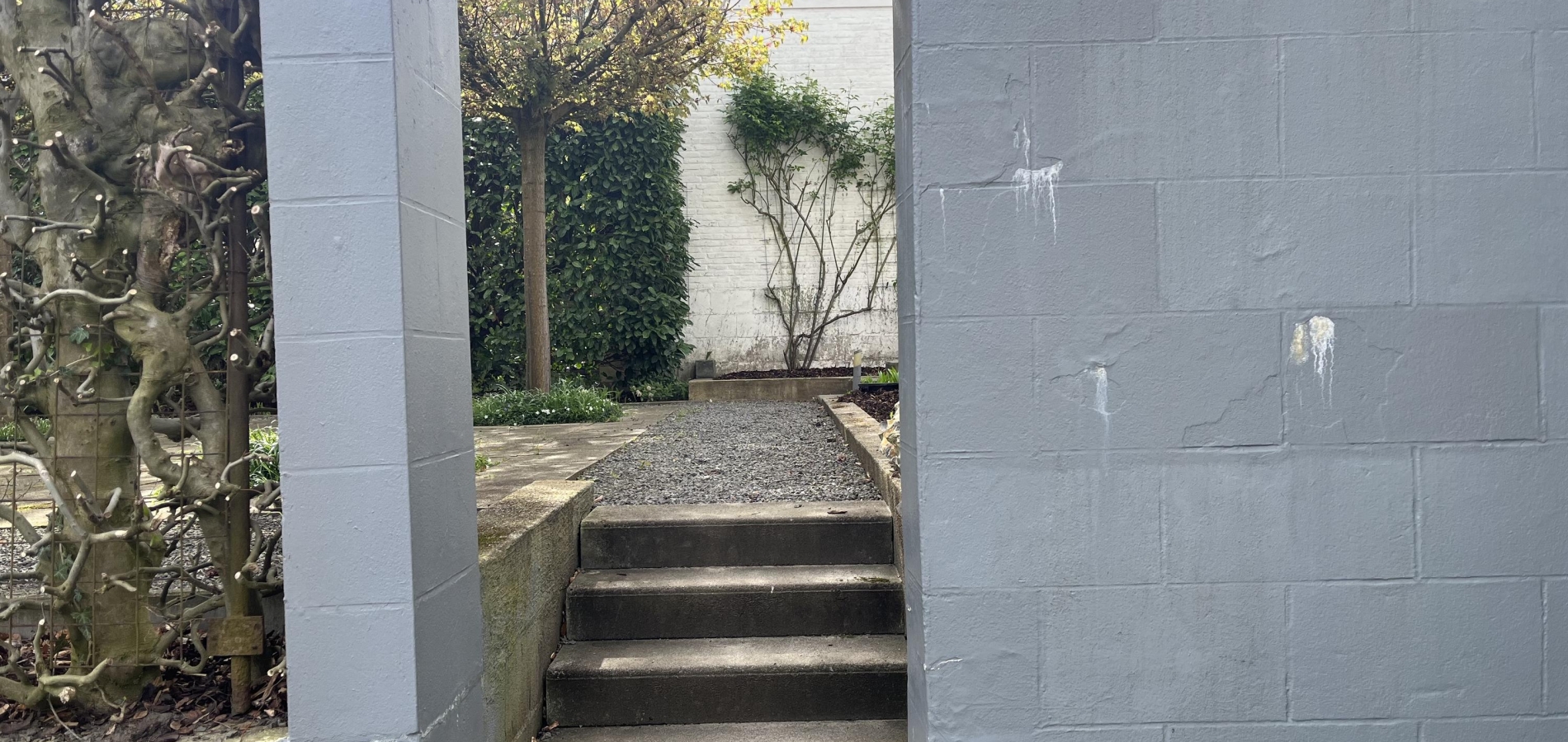 Aan de achterzijde van de woonkamer leidt een open trap naar het souterrain. Halverwege de trap zijn daar nog de openslaande deuren die toegang geven naar de lagergelegen tuinterrassen.