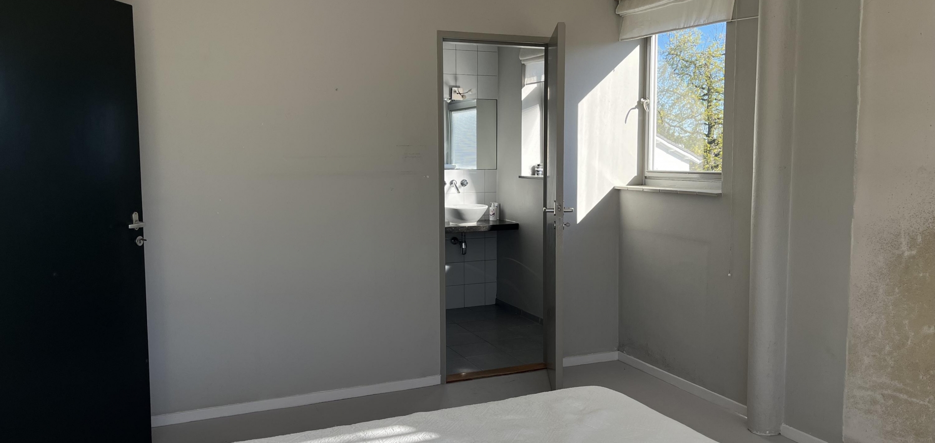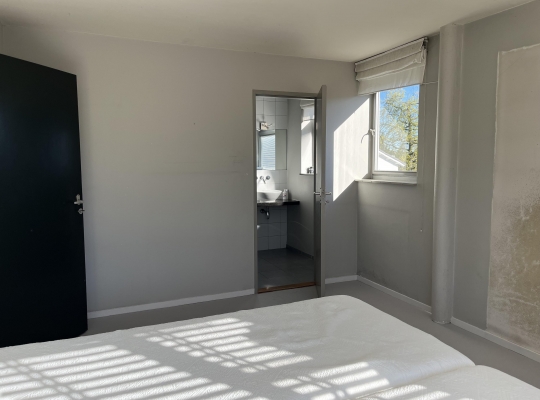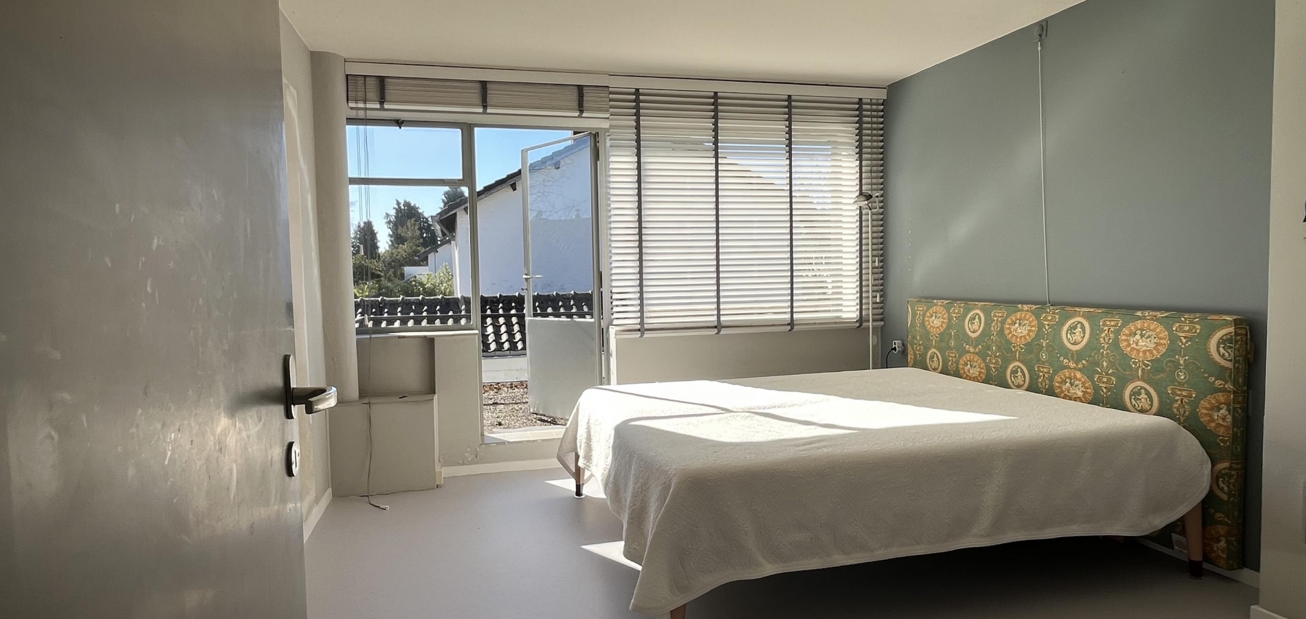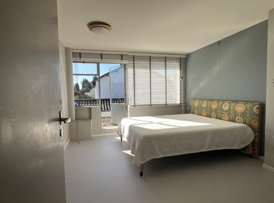 De ouderslaapkamer met aansluitende badkamer meet 428 x 360 cm en geeft uit op een royaal dakterras op het zuiden.