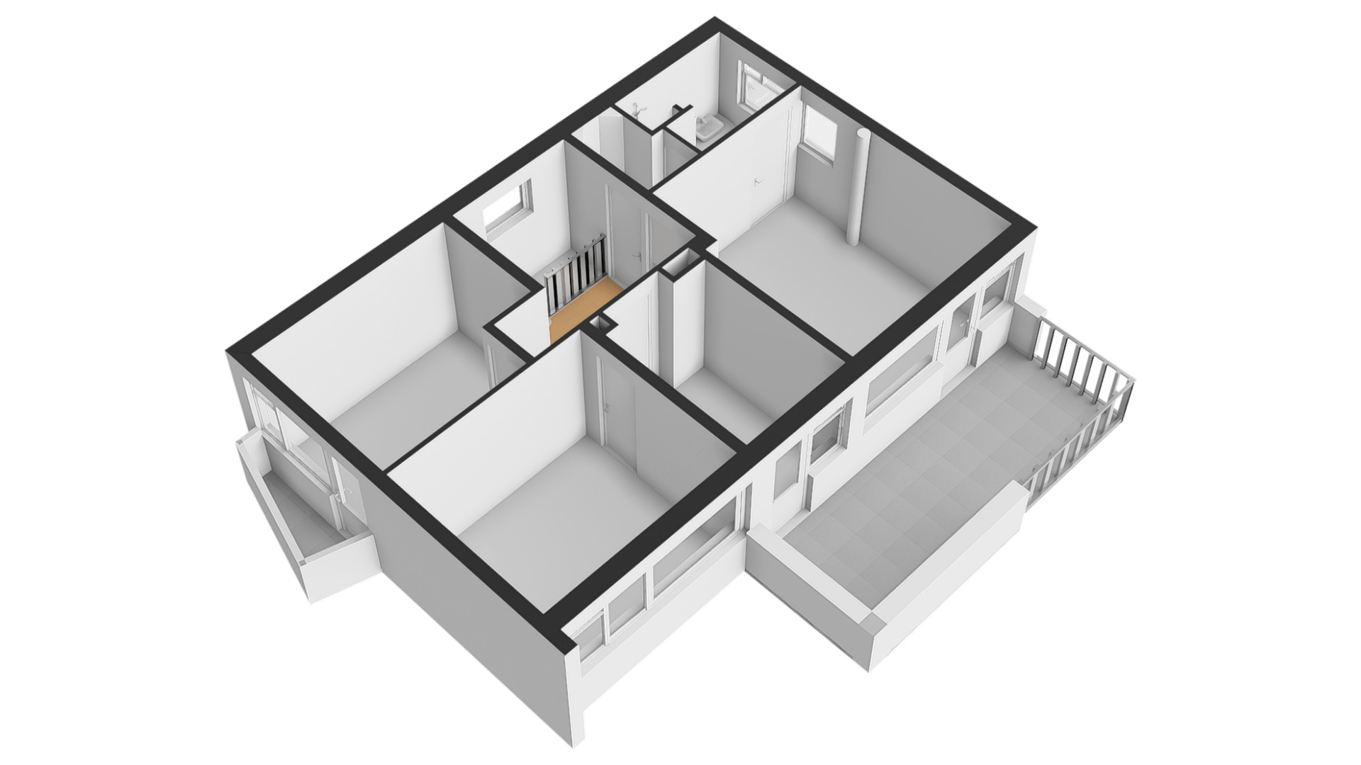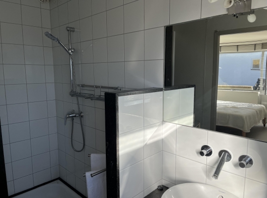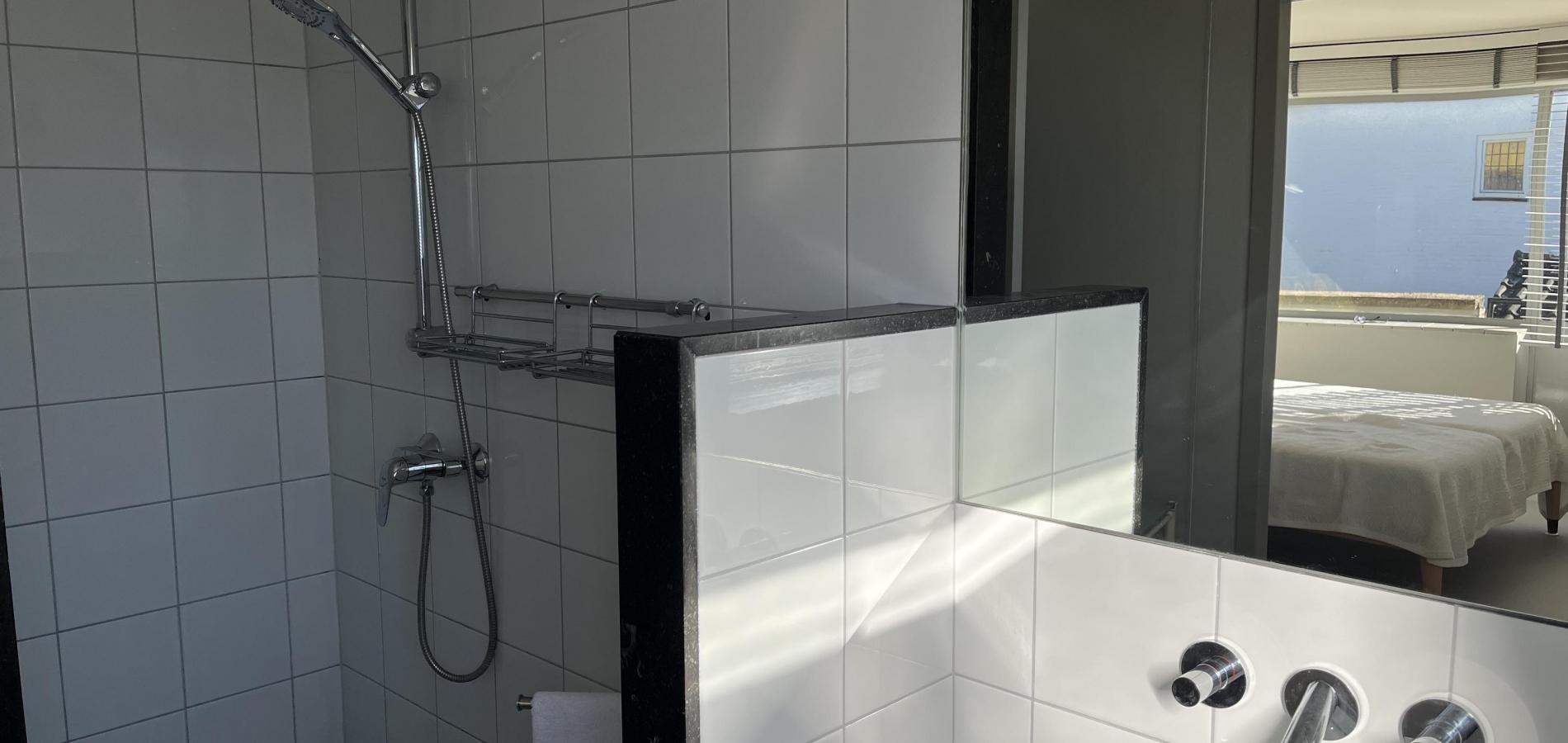 Er is een eenvoudige badkamer van 360 x 171 cm met een douche, een wastafel met hardstenen blad en een aparte toiletruimte met wandcloset. Die toiletruimte is vanuit de ouderslaapkamer en vanuit de overloop apart toegankelijk.