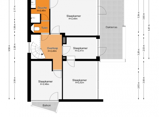 Ook slaapkamer 2, met afmeting 311 x 228 cm heeft toegang tot dat dakterras met een afmeting van 587 x 227 cm. Slaapkamer 3, met een afmeting 359 x 311 cm beschikt over een muurkast met ook daar die fraaie grote ramen. Slaapkamer 4, met afmeting van 359 x ca. 289 cm heeft een deur naar het markante balkon op het westen met magnifiek uitzicht op een van de flanken van de Sint-Pietersberg en op het Fort Sint Pieter.
