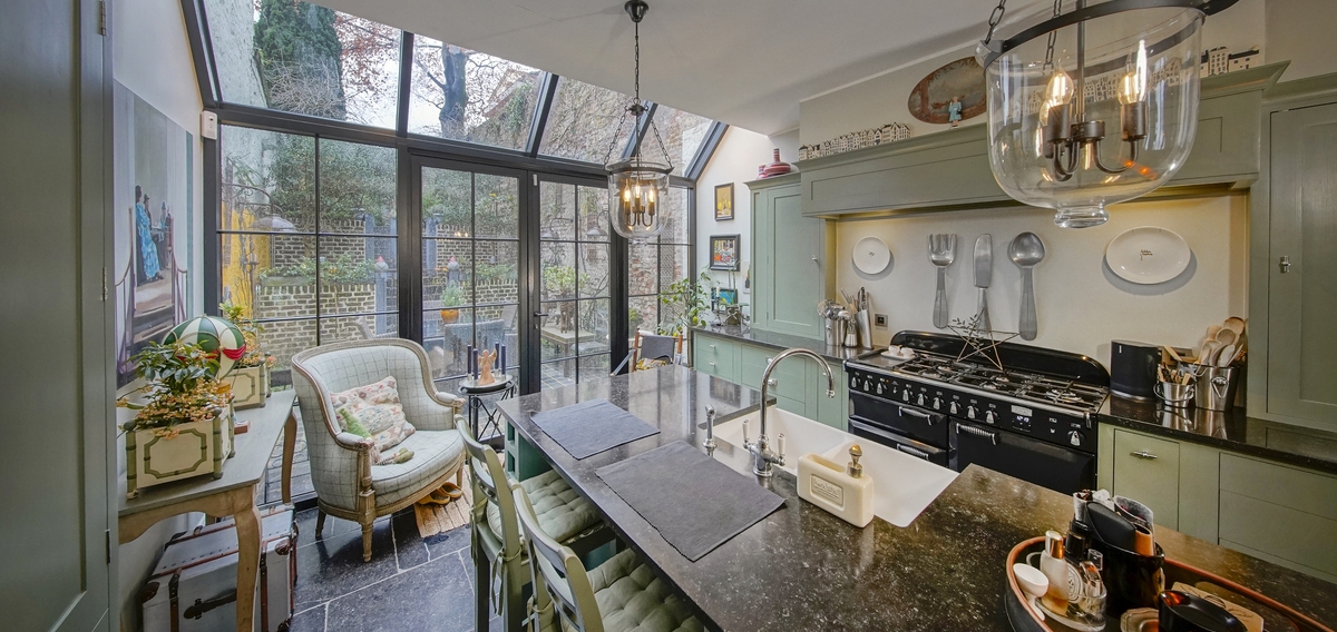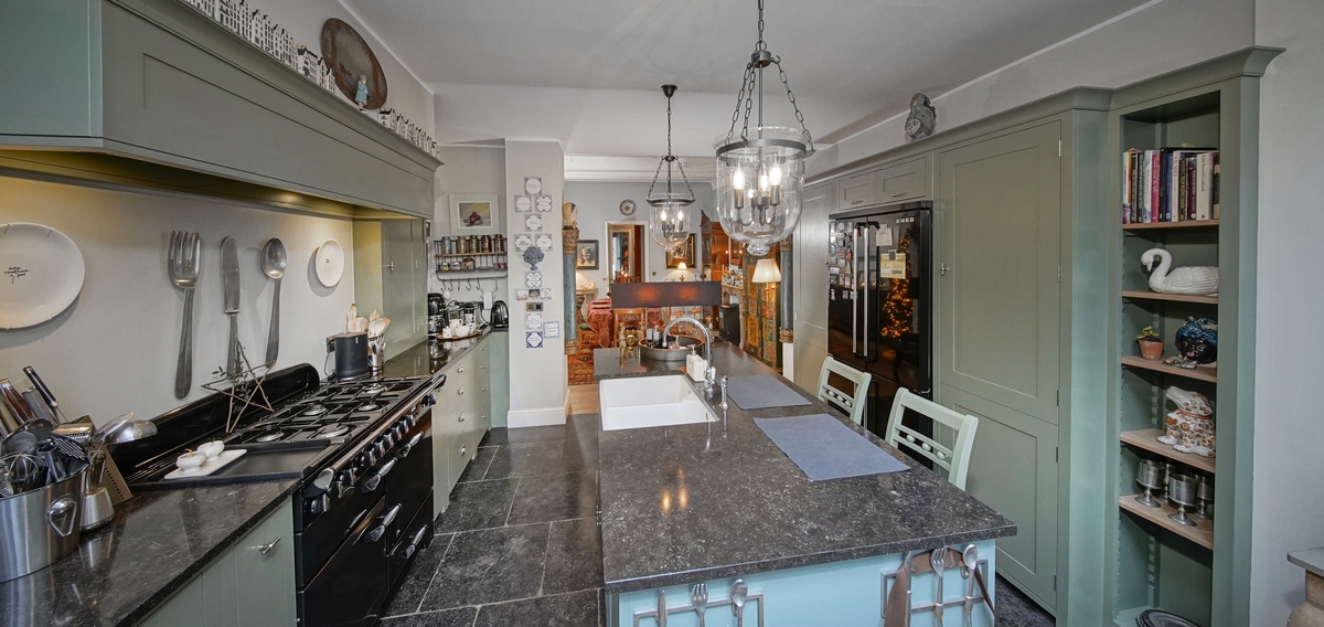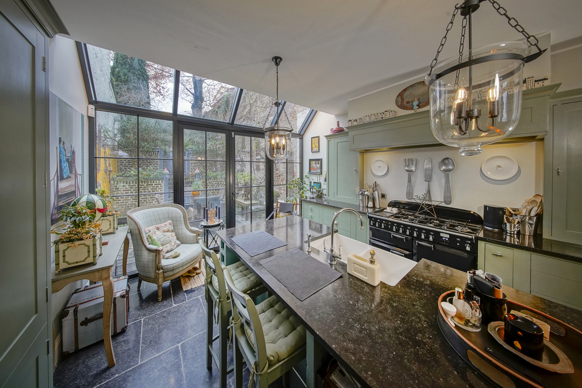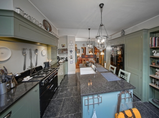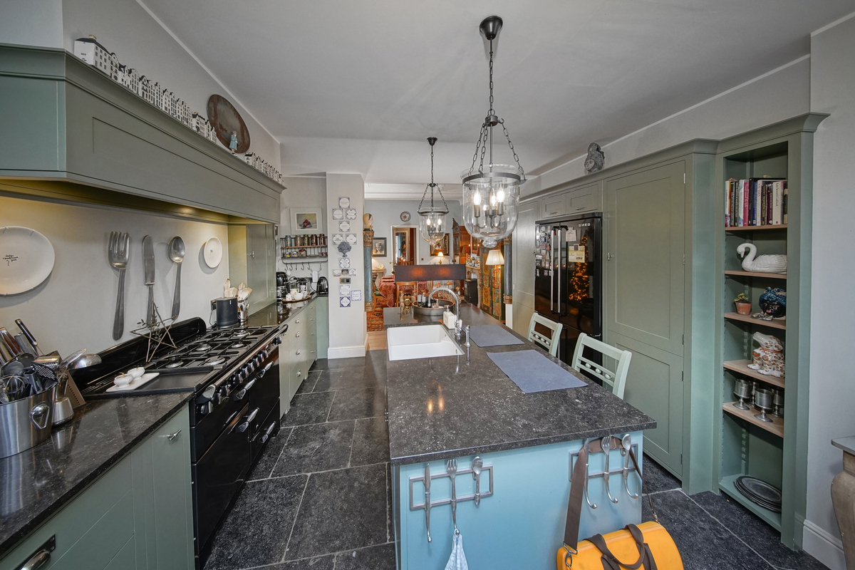 Aan de achterzijde ligt de leefkeuken (circa 21 m²). De keuken is uitgevoerd met een ambachtelijke keukenopstelling van het merk Neptune met eikenhouten kasten en diverse inbouwapparatuur. Via openslaande deuren is het terras en de tuin te bereiken.