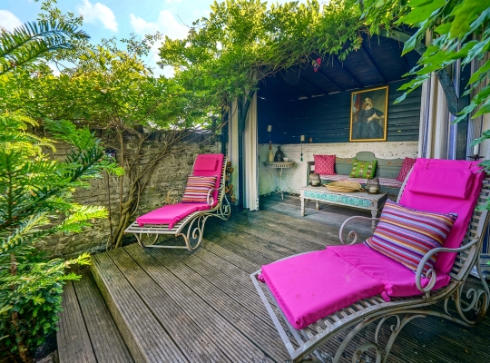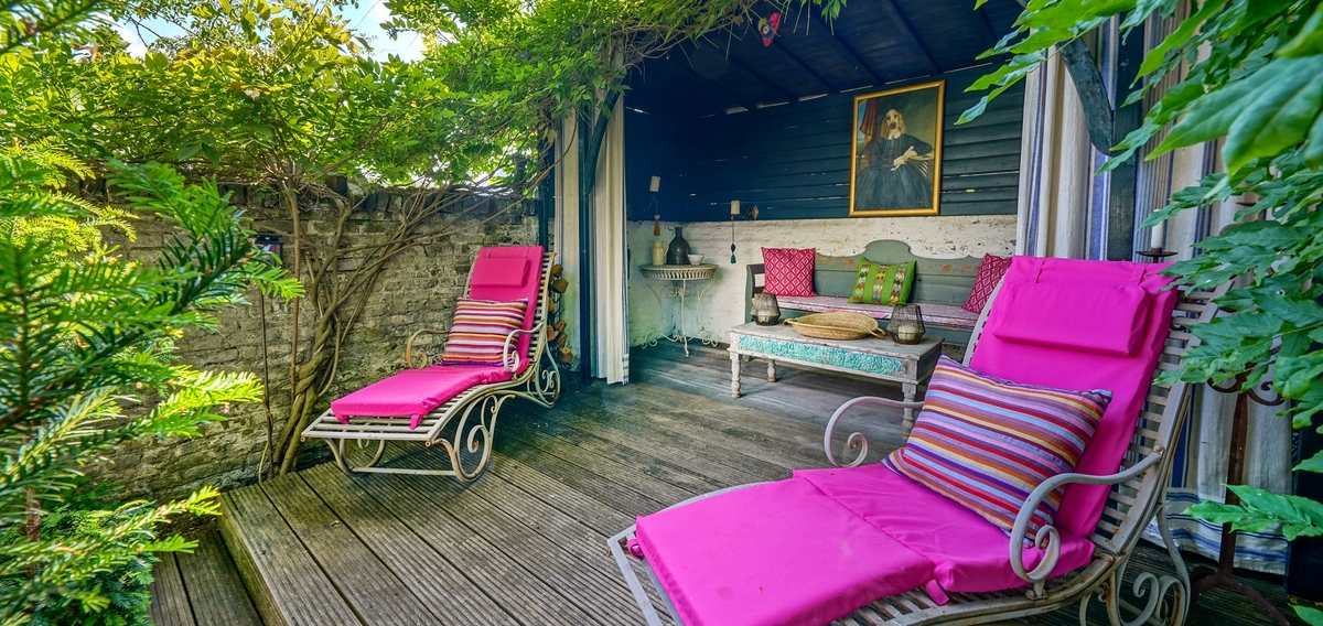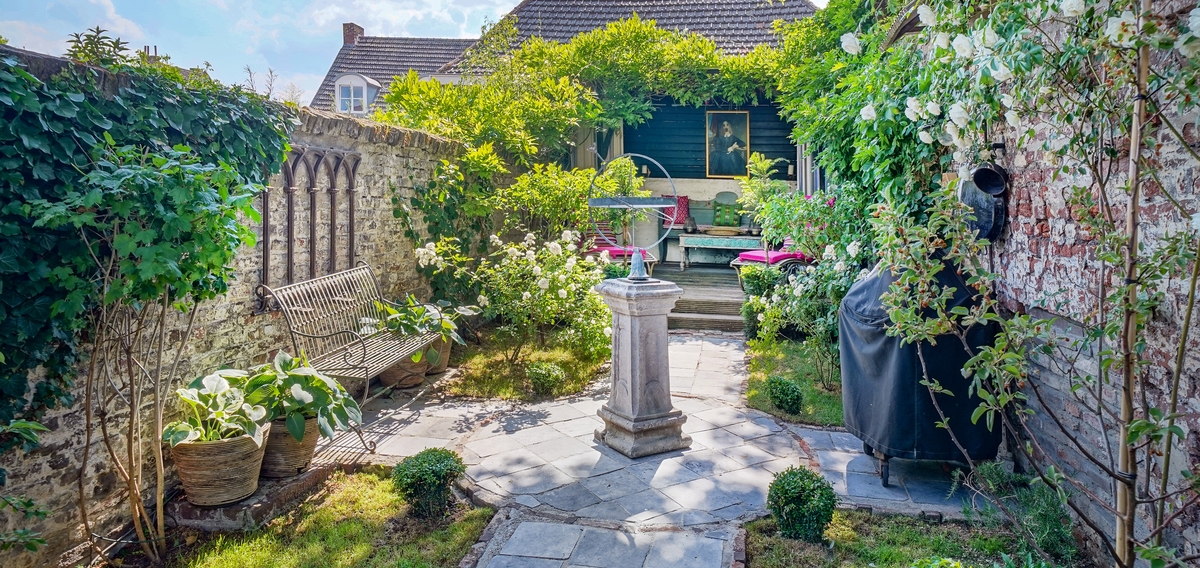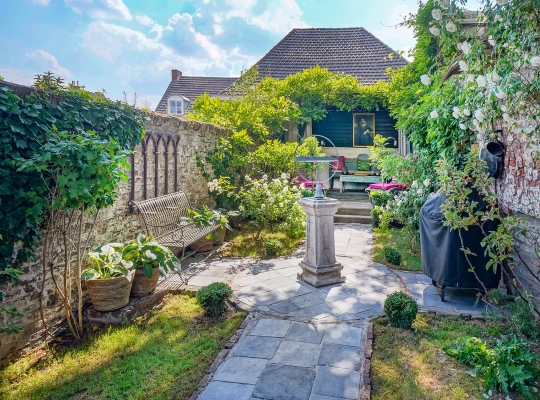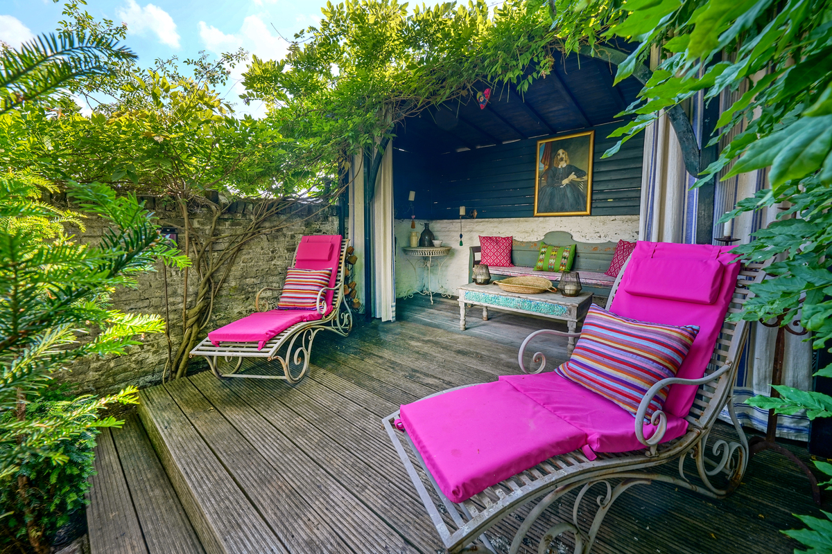 De stadstuin ligt op het zuidwesten en is speels aangelegd met meerdere niveaus. Direct aan de keuken ligt een terras, waarna een trap naar een hoger gelegen gedeelte leidt. Achter in de tuin bevindt zich een terras met overkapping.