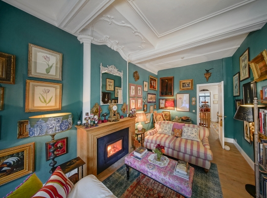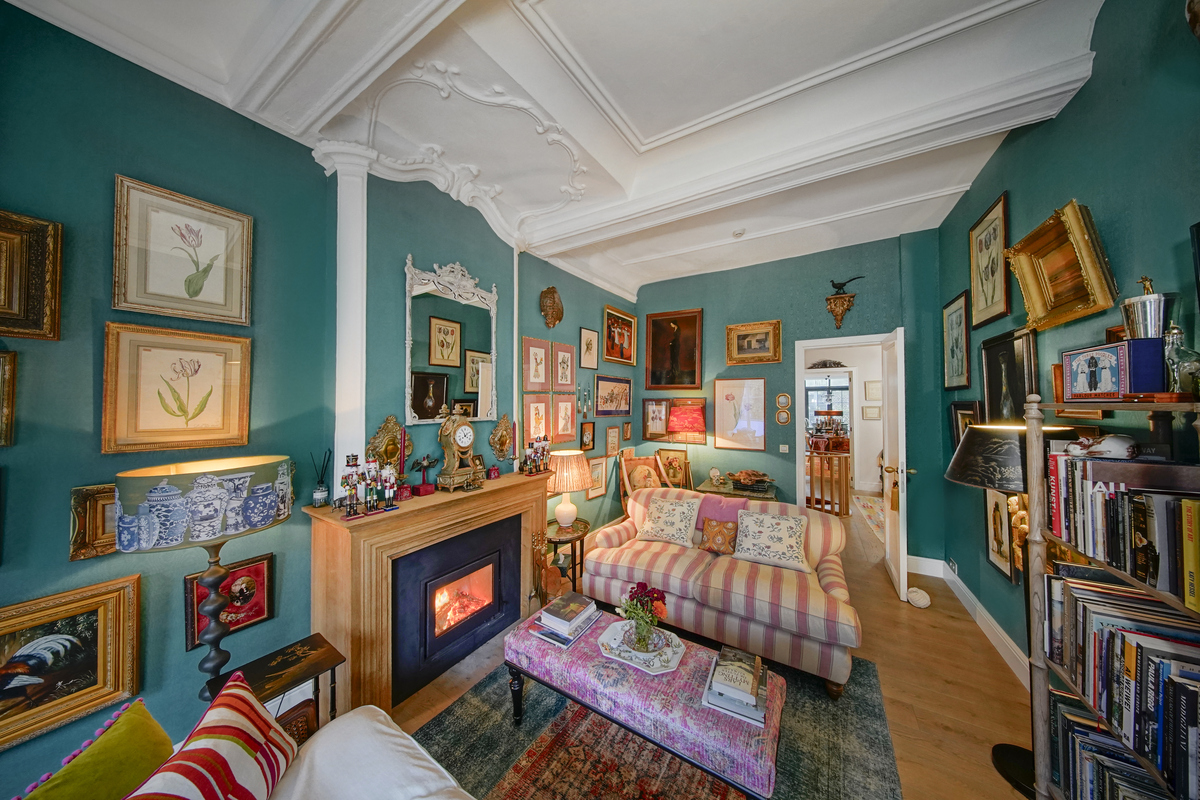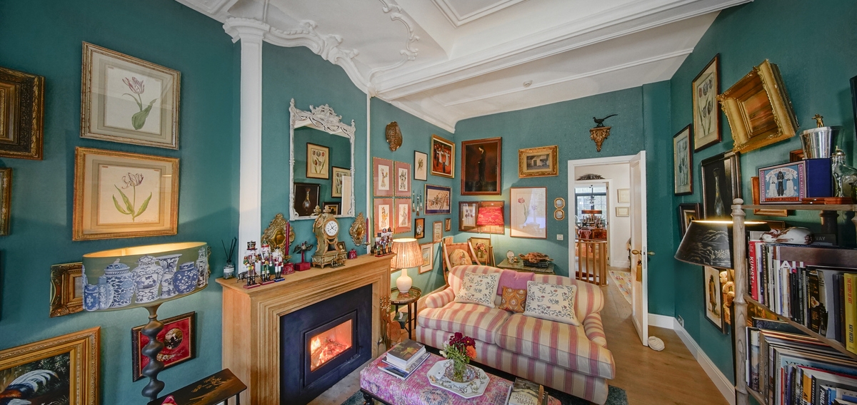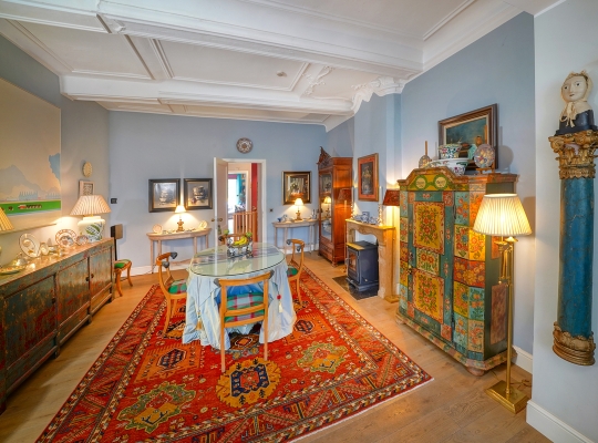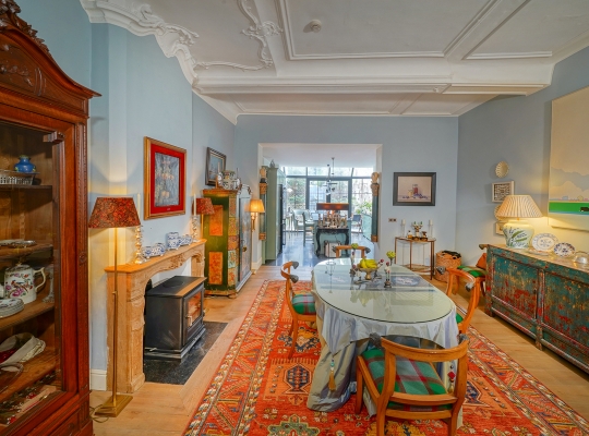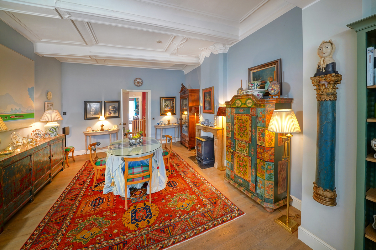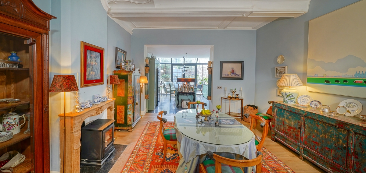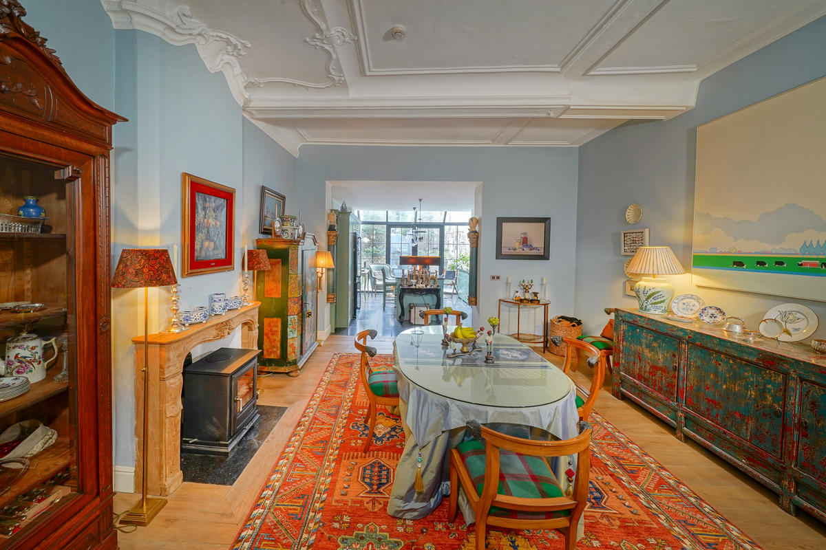 Via de entree komt u in de hal met garderobe, meterkast en toegang tot de verschillende vertrekken. Aan de voorzijde van de woning ligt de zitkamer (circa 20 m²) met hoge plafonds, sierlijsten en een houtkachel. Aansluitend bevindt zich de eetkamer (circa 23 m²), eveneens met een houtkachel en fraaie ornamentenplafonds.