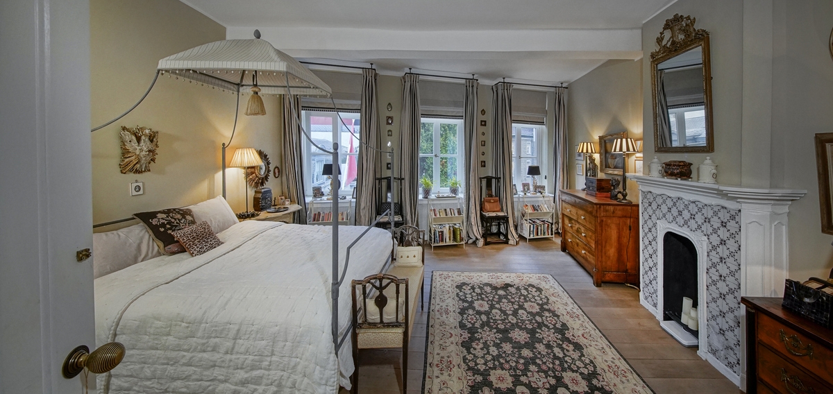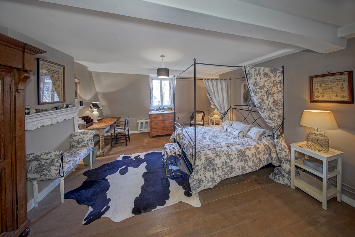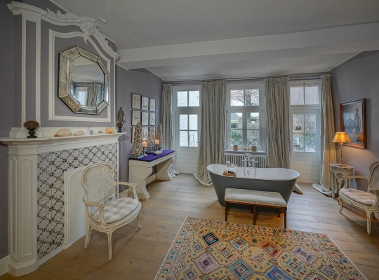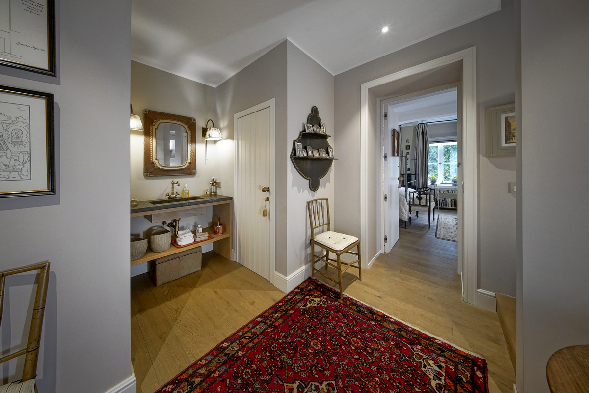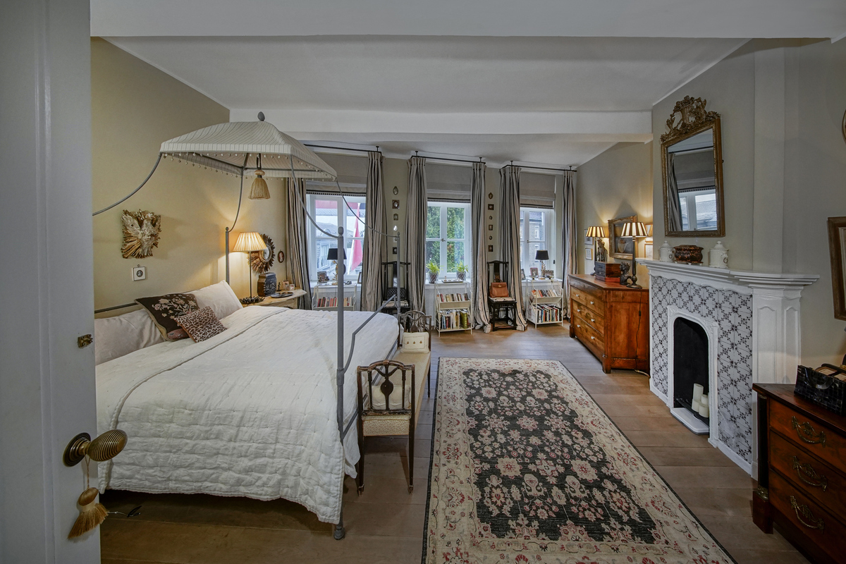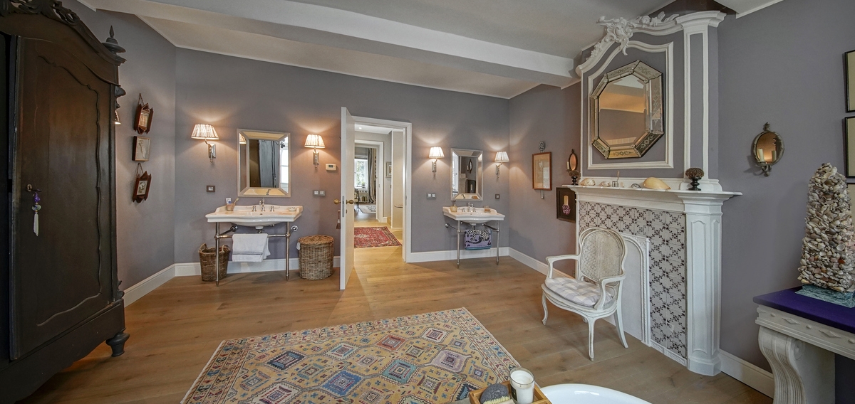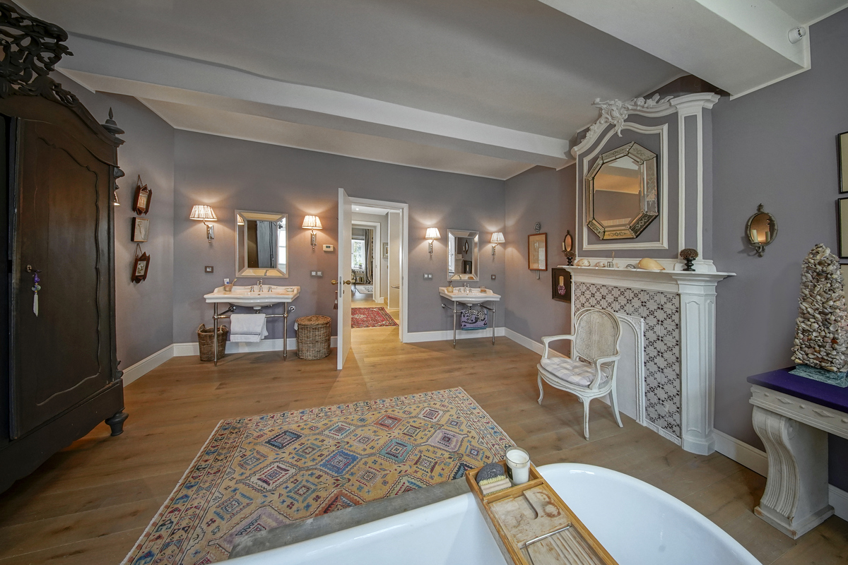 Via een eikenhouten wenteltrap is de eerste verdieping bereikbaar. De overloop geeft toegang tot de badkamer, een separaat toilet en de slaapkamer. De badkamer (circa 23 m²) is royaal en voorzien van een duo ligbad, twee wastafelmeubels en een monumentale haardmantel. Slaapkamer I (circa 30 m²) bevindt zich eveneens op deze verdieping en beschikt over een inbouwkast en een monumentale haard.