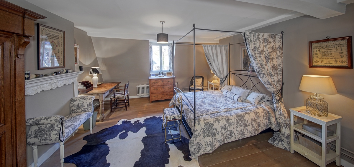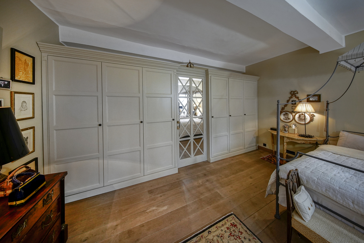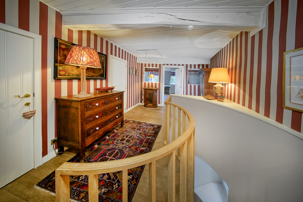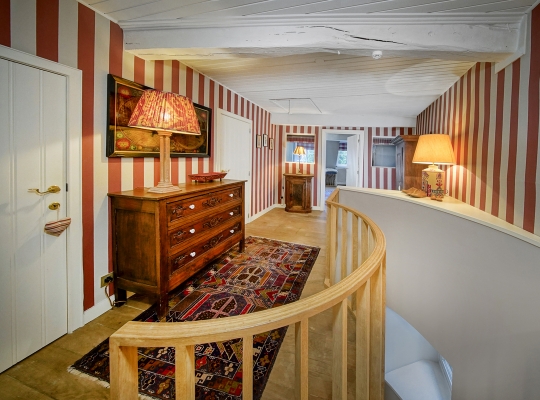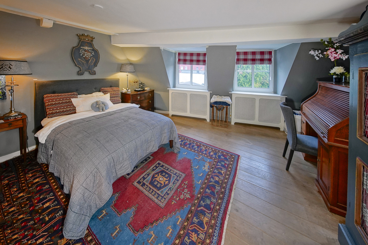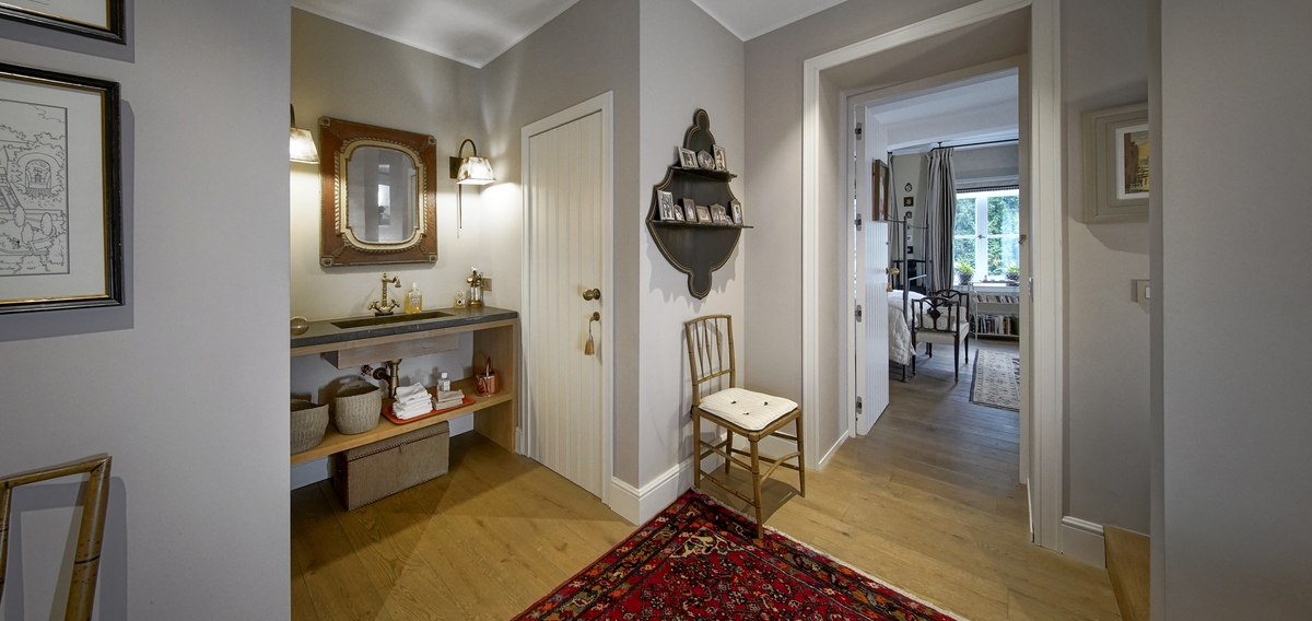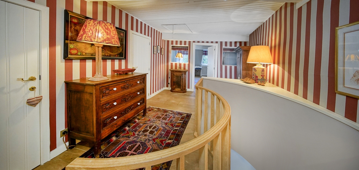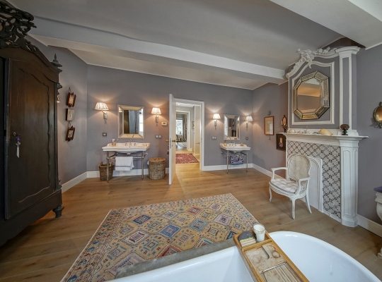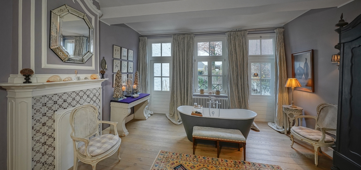 Via een eikenhouten wenteltrap is de eerste verdieping bereikbaar. De overloop geeft toegang tot de badkamer, een separaat toilet en de slaapkamer. De badkamer (circa 23 m²) is royaal en voorzien van een duo ligbad, twee wastafelmeubels en een monumentale haardmantel. Slaapkamer I (circa 30 m²) bevindt zich eveneens op deze verdieping en beschikt over een inbouwkast en een monumentale haard.