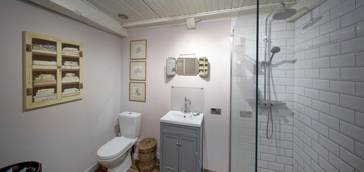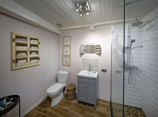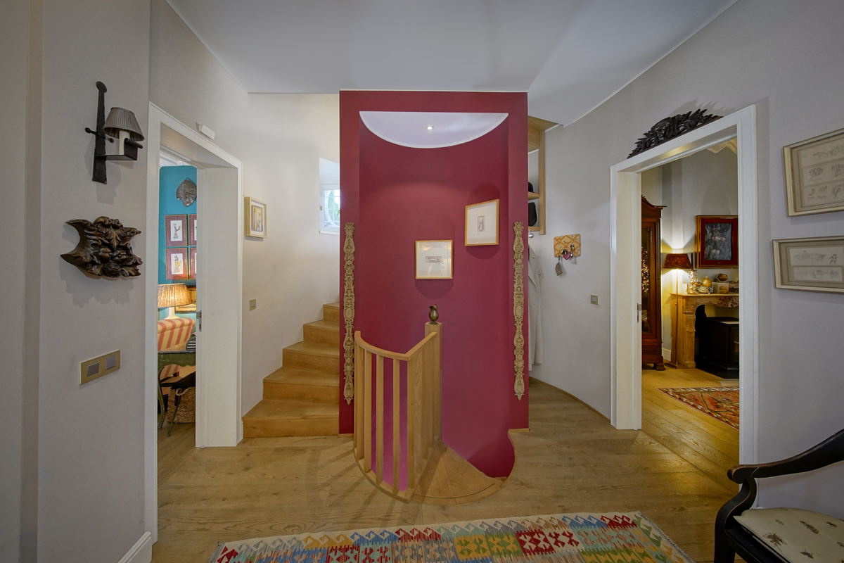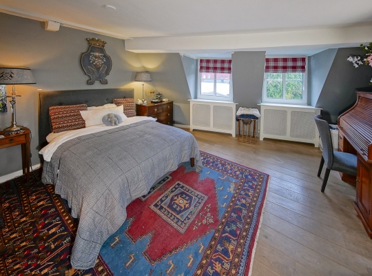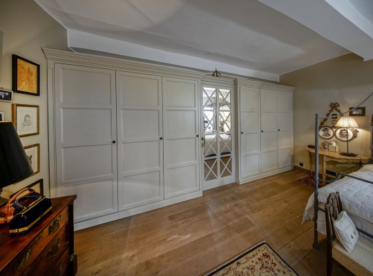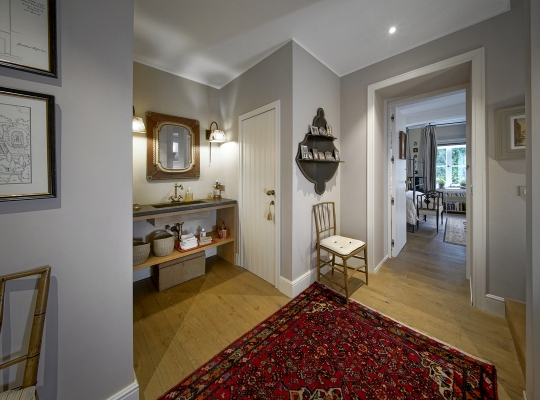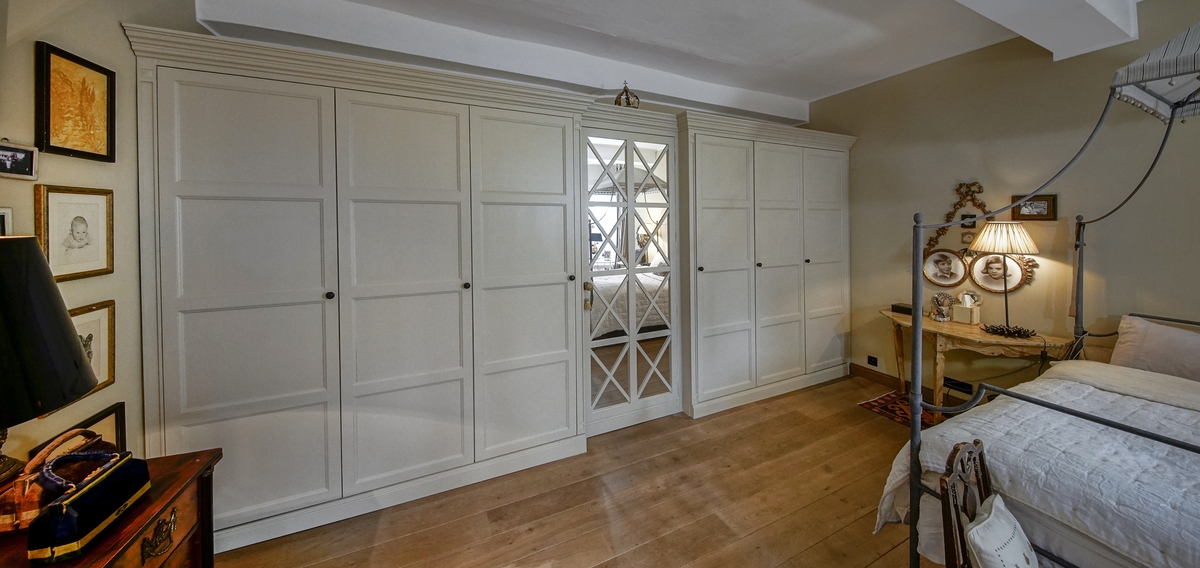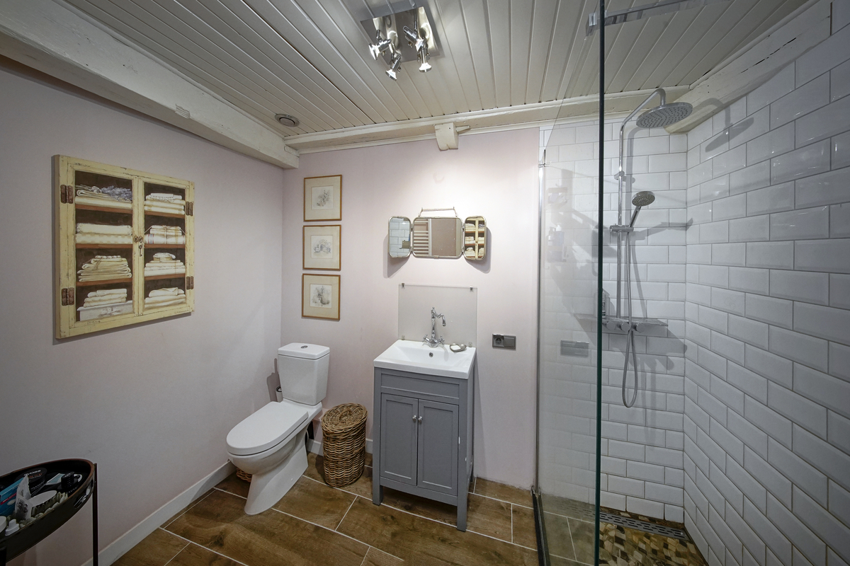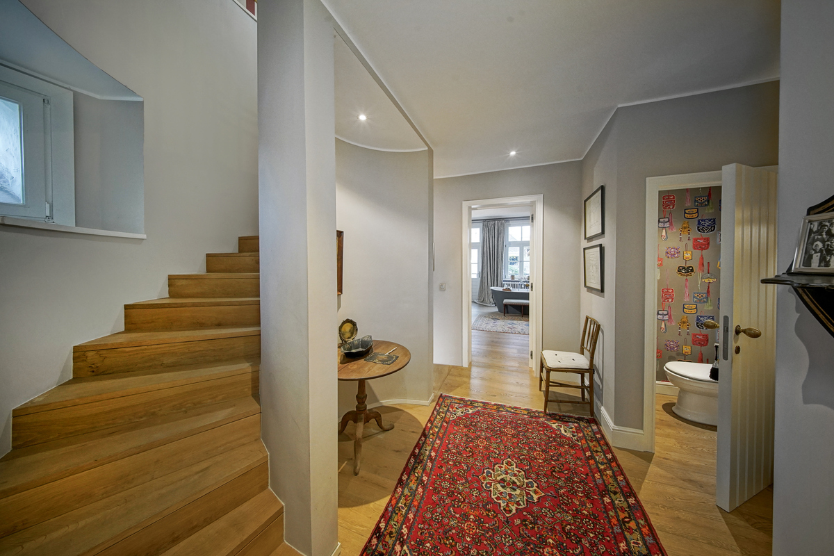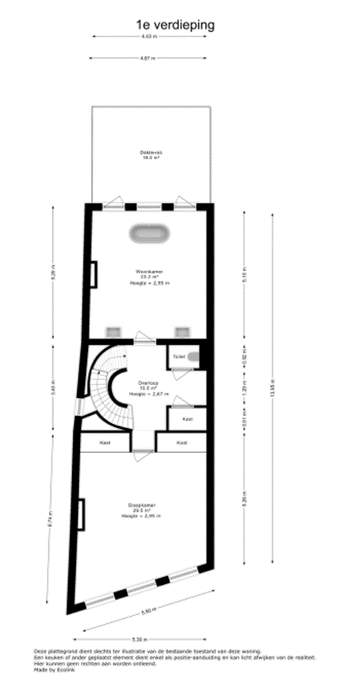 Via een eikenhouten wenteltrap is de eerste verdieping bereikbaar. De overloop geeft toegang tot de badkamer, een separaat toilet en de slaapkamer. De badkamer (circa 23 m²) is royaal en voorzien van een duo ligbad, twee wastafelmeubels en een monumentale haardmantel. Slaapkamer I (circa 30 m²) bevindt zich eveneens op deze verdieping en beschikt over een inbouwkast en een monumentale haard.