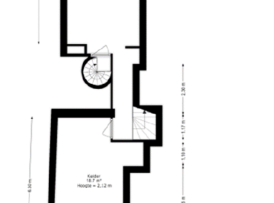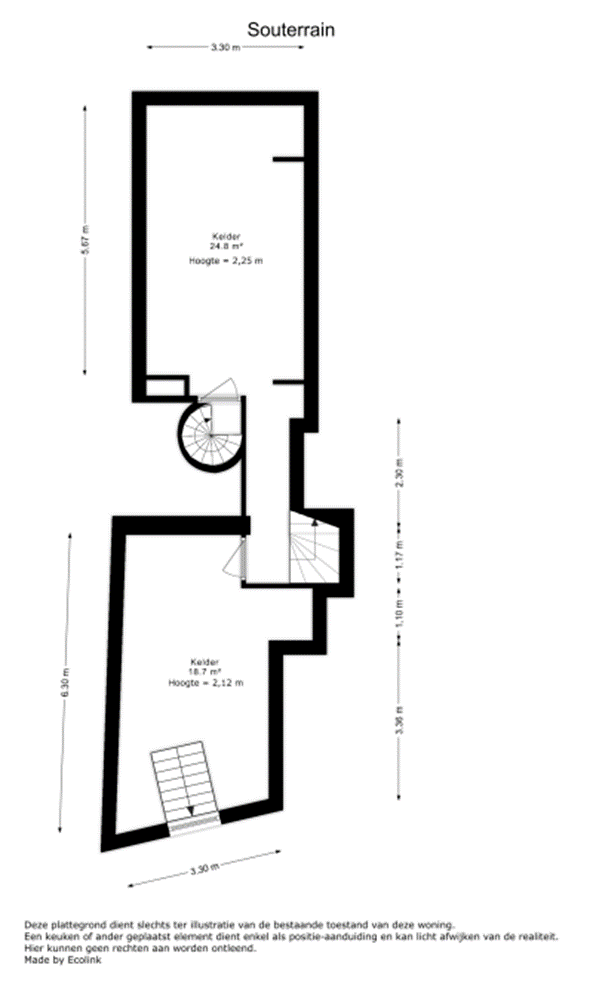 Vanuit de hal is via een houten wenteltrap de kelder te bereiken. Het eerste keldervertrek (circa 25 m²) heeft wanden en vloer van veldbrandsteen en een plafond met tongewelf. Het tweede keldervertrek (circa 19 m²) bevindt zich aan de voorzijde en heeft een gecementeerde vloer, wanden van veldbrandsteen en eveneens een tongewelf. Vanuit deze ruimte is er een deur naar het trottoir aan de voorzijde van de woning.
