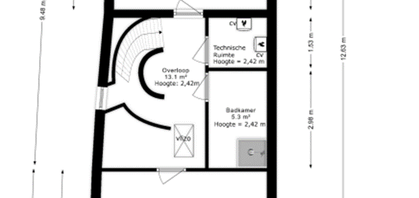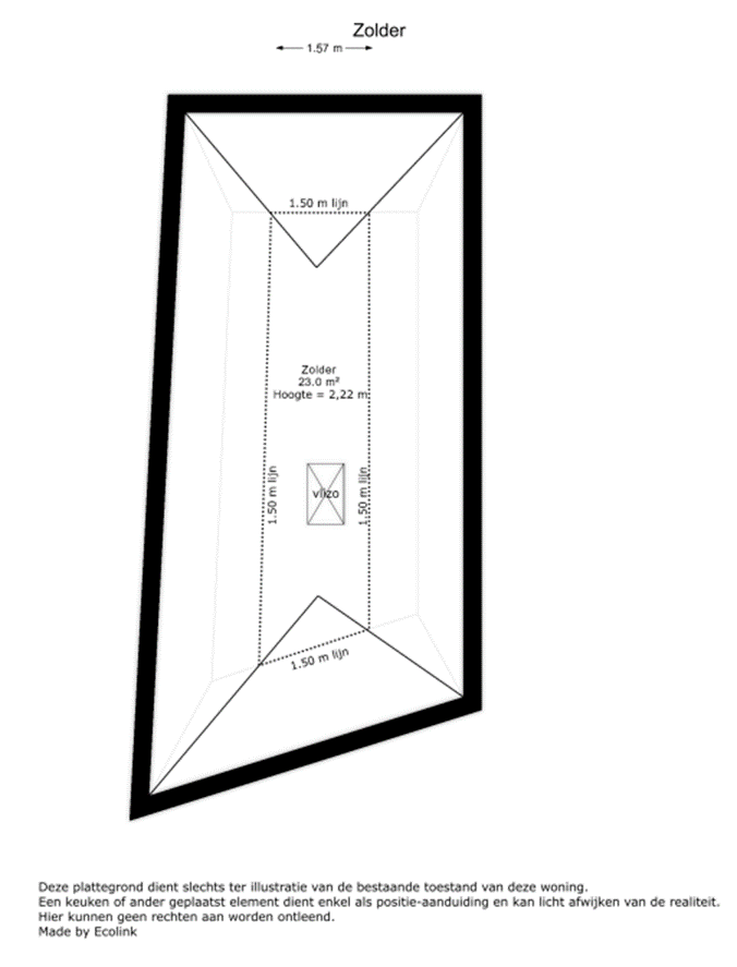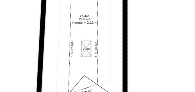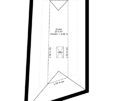 Via een vlizotrap is de zolder bereikbaar. Deze ruimte (circa 23 m²) heeft een houten vloer en een zichtbare kapconstructie en is geschikt als bergruimte.