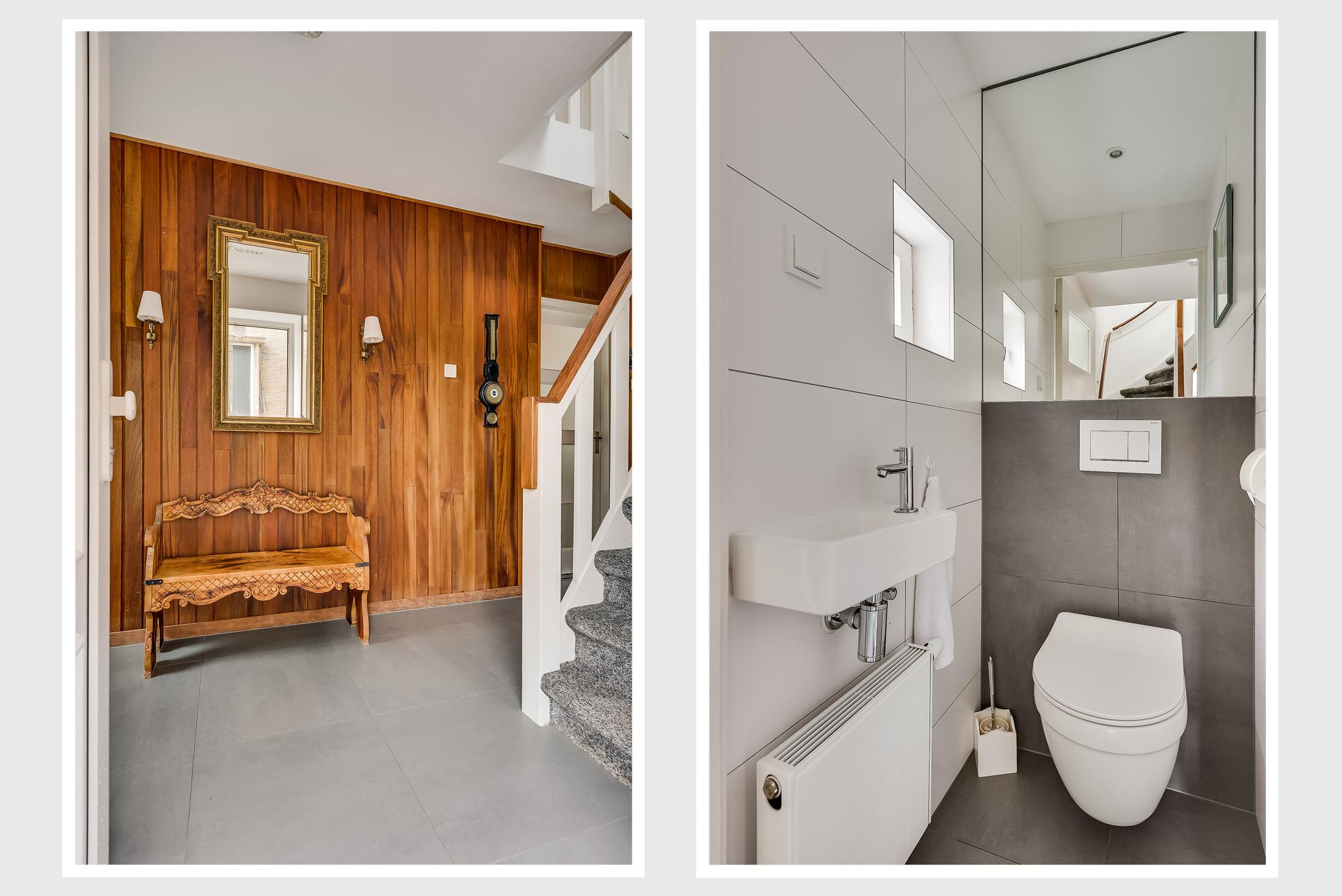 Aan de rechterzijde is de entree, die toegang geeft tot de 4,80 meter lange hal. Hier ziet u de trap naar de eerste verdieping en achter een van de deuren is de trap naar het souterrain. De in 2019 vernieuwde, moderne toiletruimte is ingedeeld met een wandcloset, fonteintje, radiator en een grote spiegel.