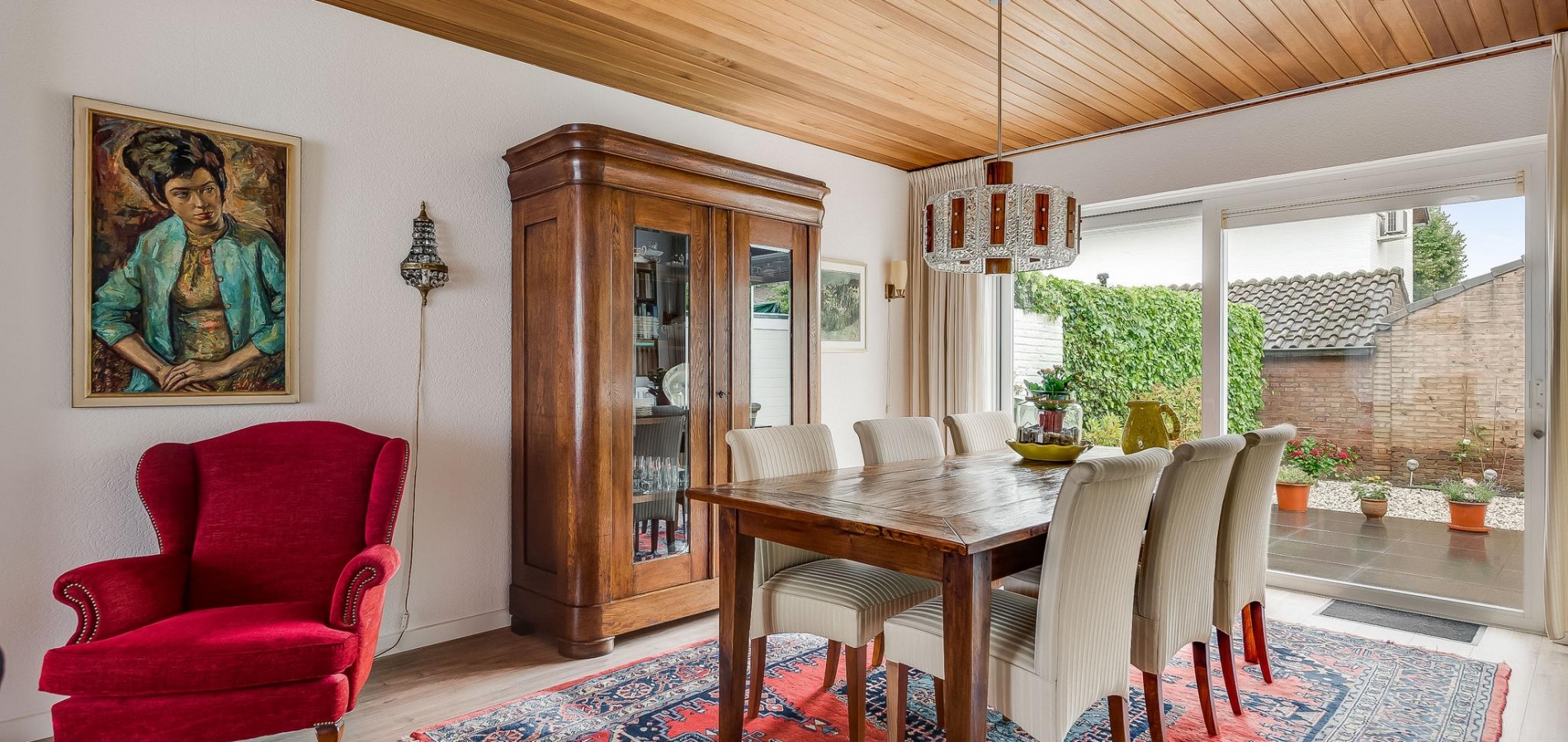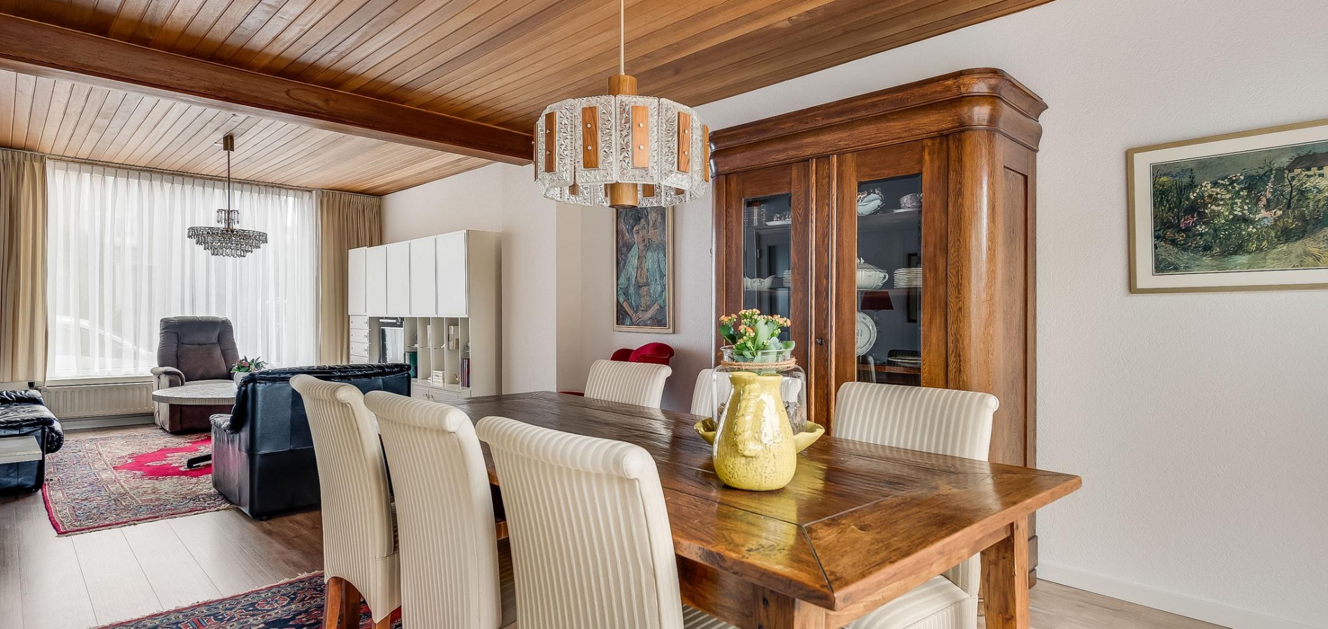 Links in de hal is een deur naar de woonkamer (9,50 x 3,97/3,87) met een laminaatvloer, veel lichtinval aan twee zijden en een grote schuifpui naar de achtertuin. Het zitgedeelte is aan de voorzijde en het ruime eetgedeelte aan de achterzijde. Een andere indeling is, gezien de verhouding tussen de ruimtes, mogelijk.
