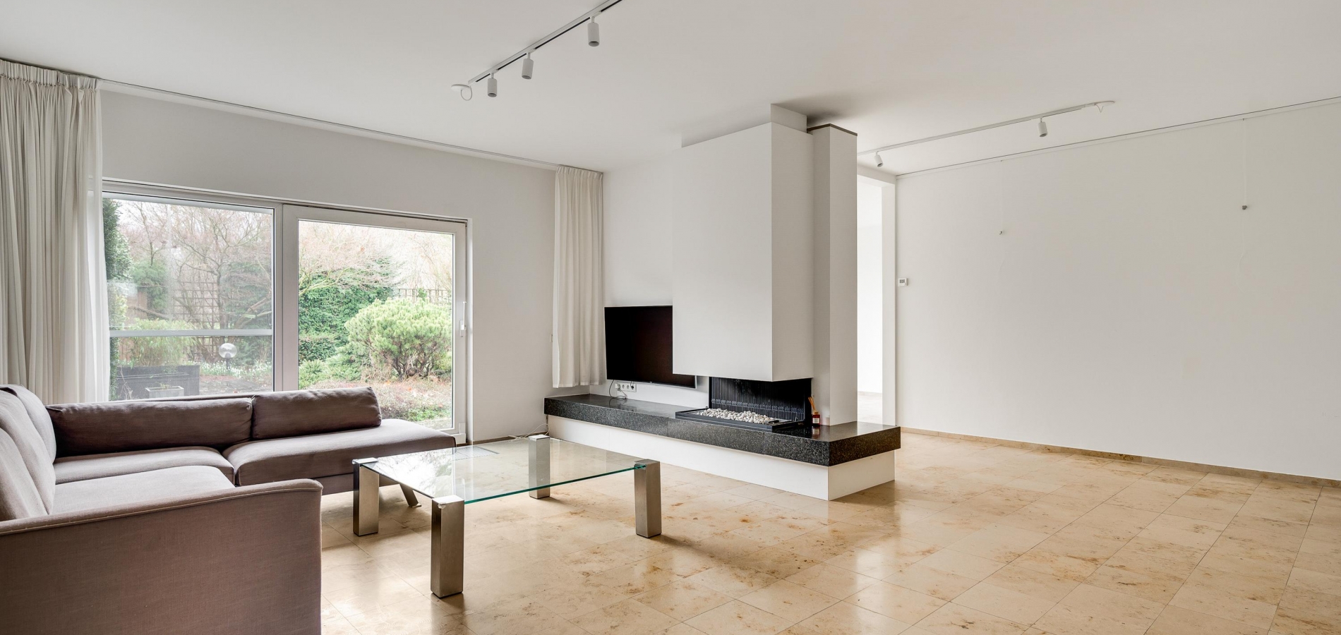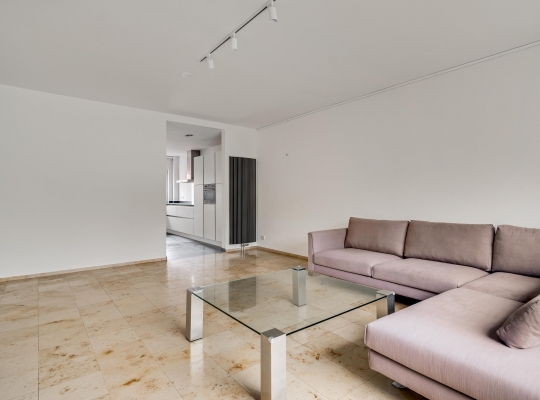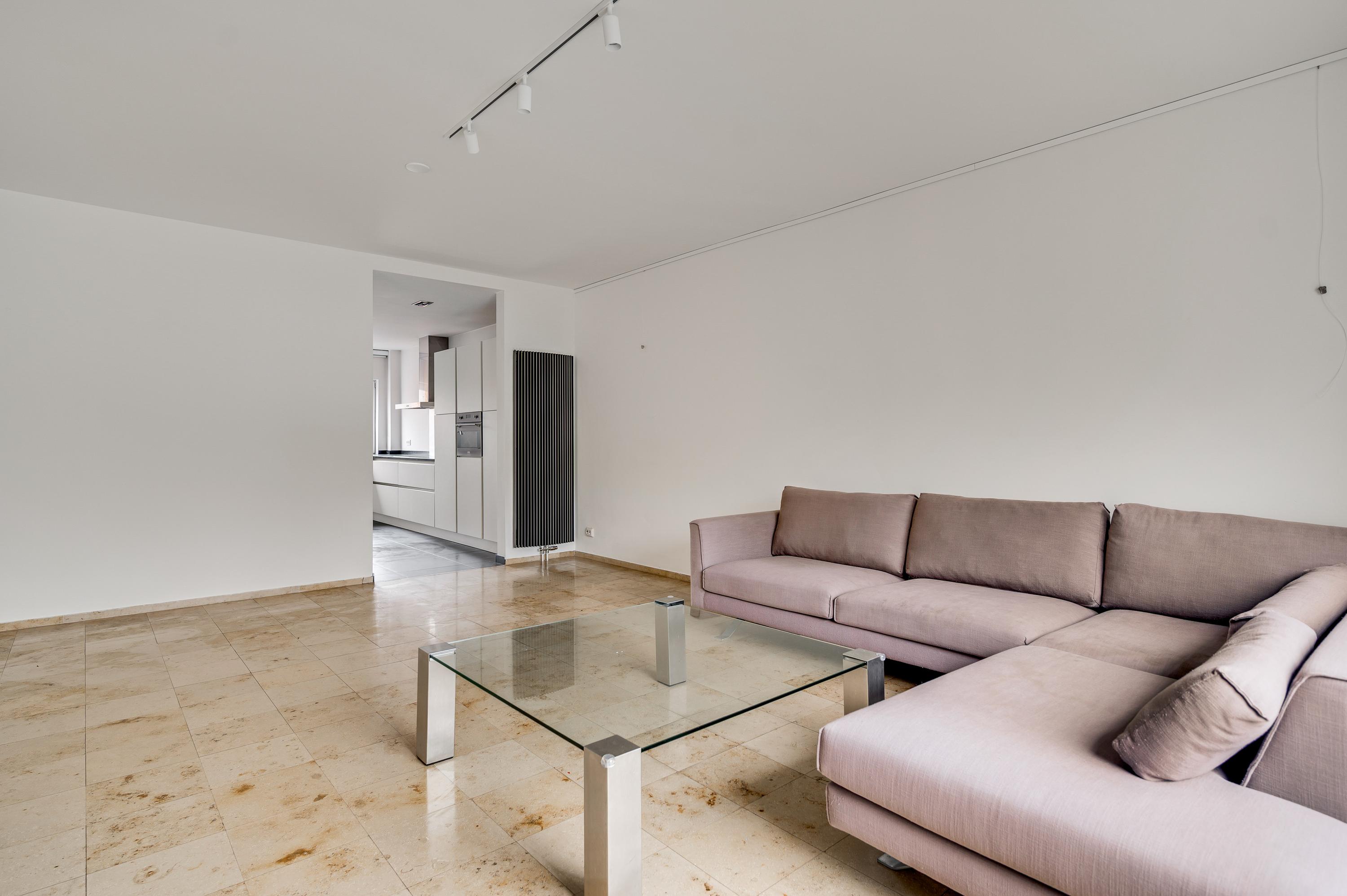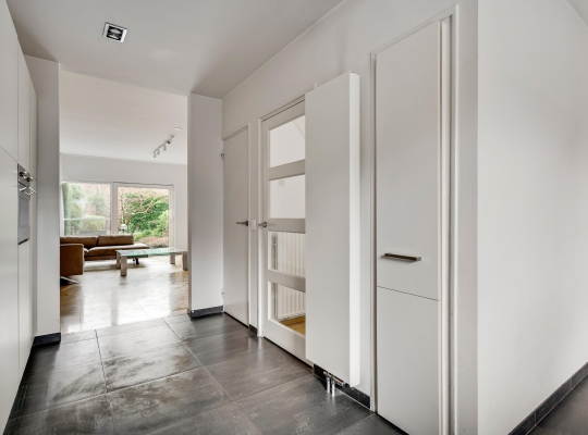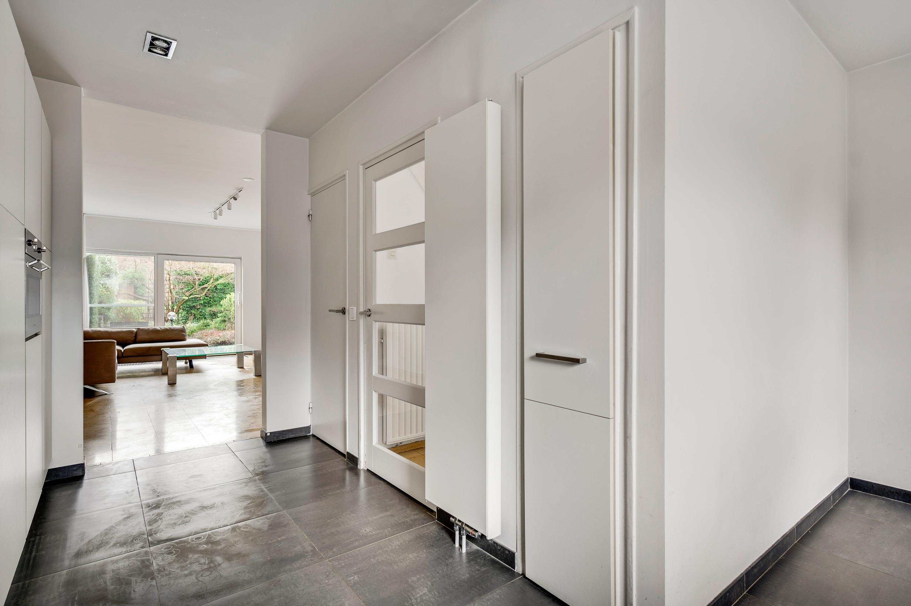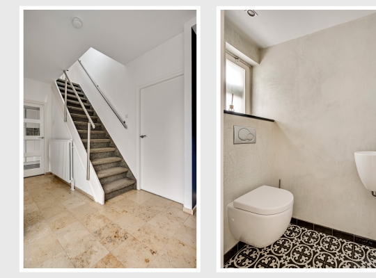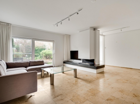 Aan de achterzijde is de speels ingedeelde woon-/eetkamer van ruim 50 m2, met een gashaard bij het zitgedeelte en een dubbele schuifpui naar de tuin. De natuursteen vloer en de schouw bij de haard zorgen voor een woonkamer die heel stijlvol en luxe oogt. Vanuit de eetkamer is er toegang tot een berging/bijkeuken (circa 2,86 x 1,68) met de HR-ketel (Remeha, 2017, huur) en de opstelling van de wasapparatuur.