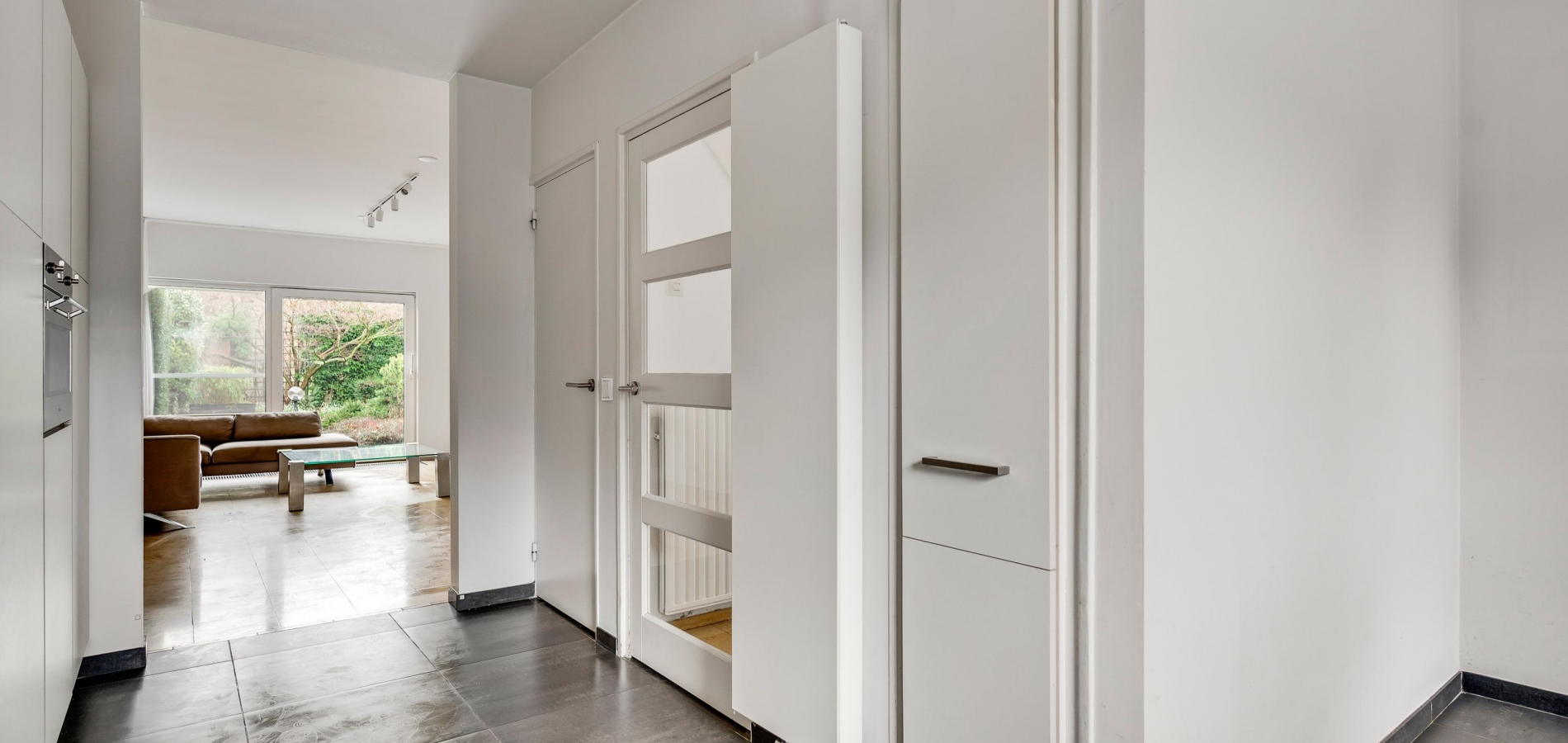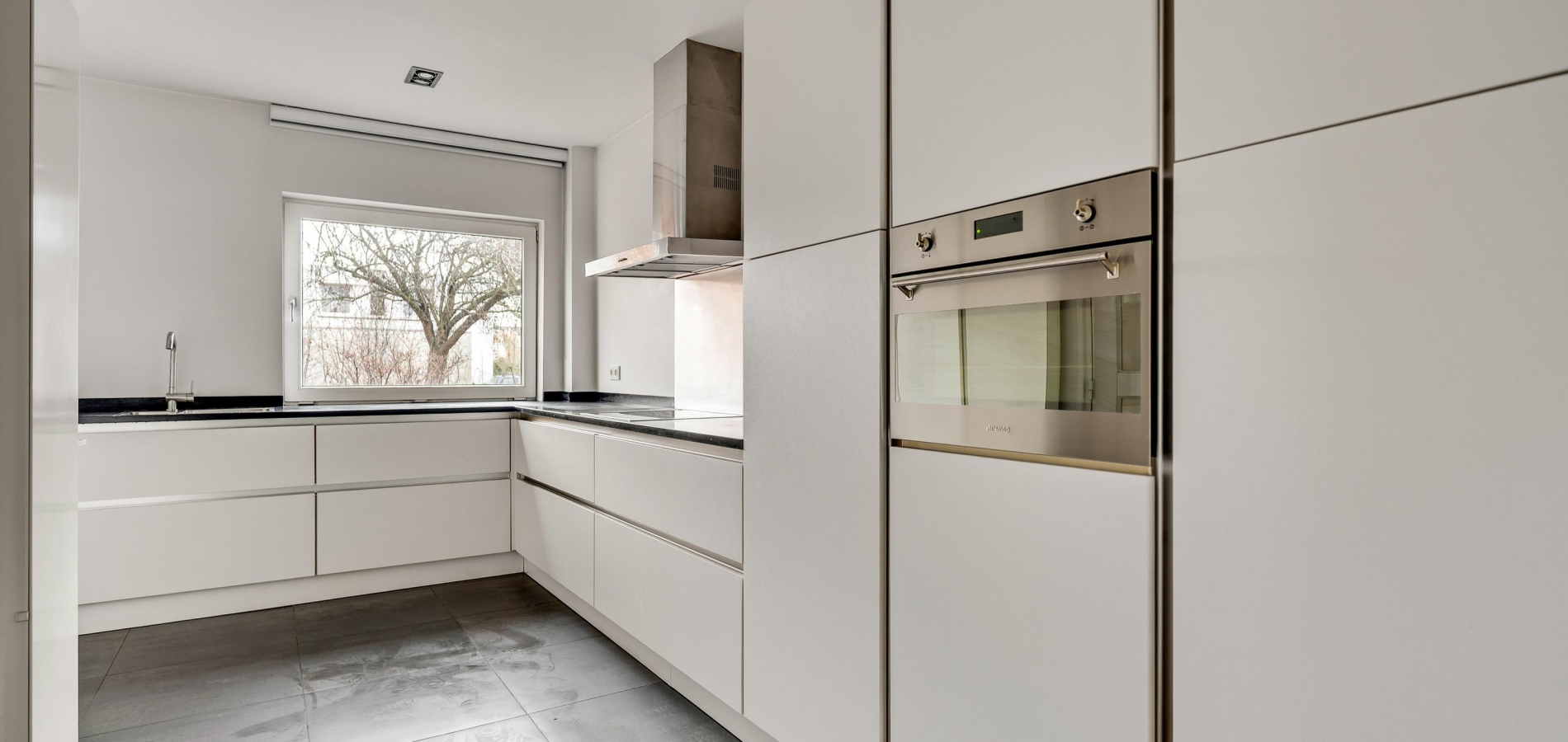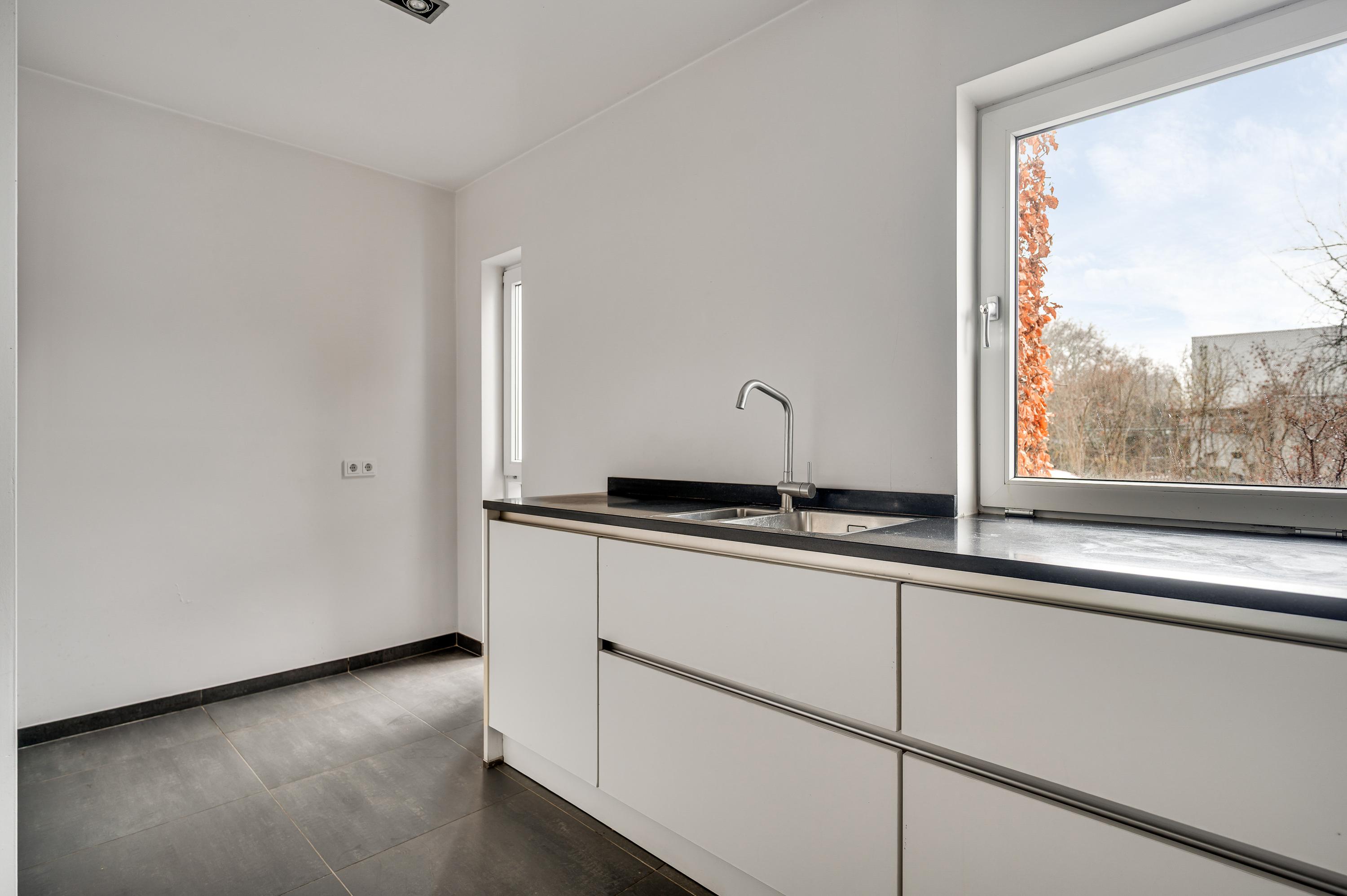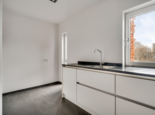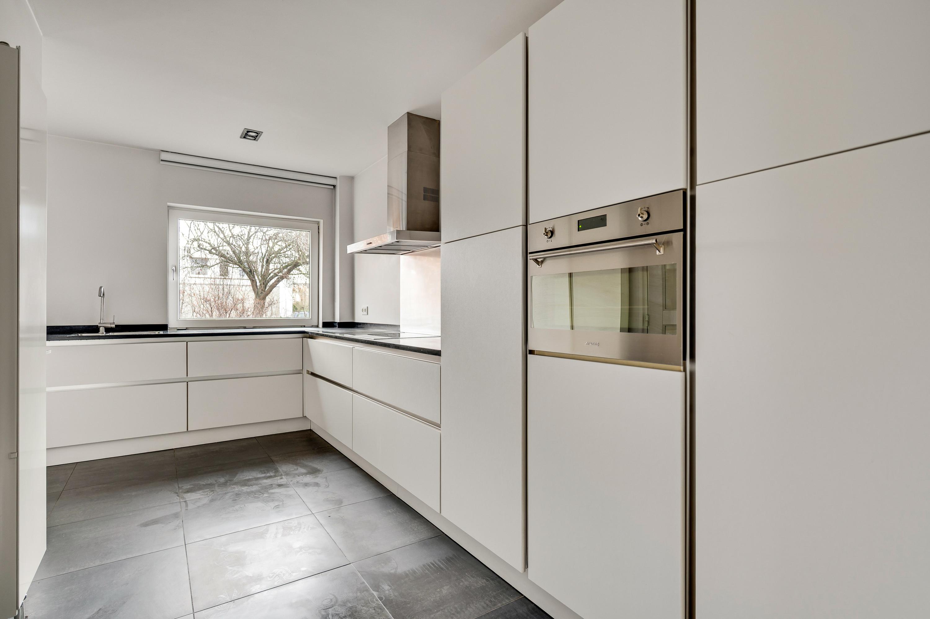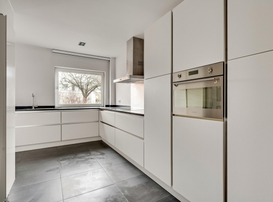 Vanuit de L-vormige keuken (circa 14,5 m2) is er mooi uitzicht op de voortuin en de rustige straat. De donkere tegelvloer vormt een mooie combinatie met de royale, L-vormige opstelling. Alle benodigde apparatuur is ingebouwd: een keramische kookplaat, afzuigkap, combi-oven, vaatwasser en een koelkast met vriesvak.